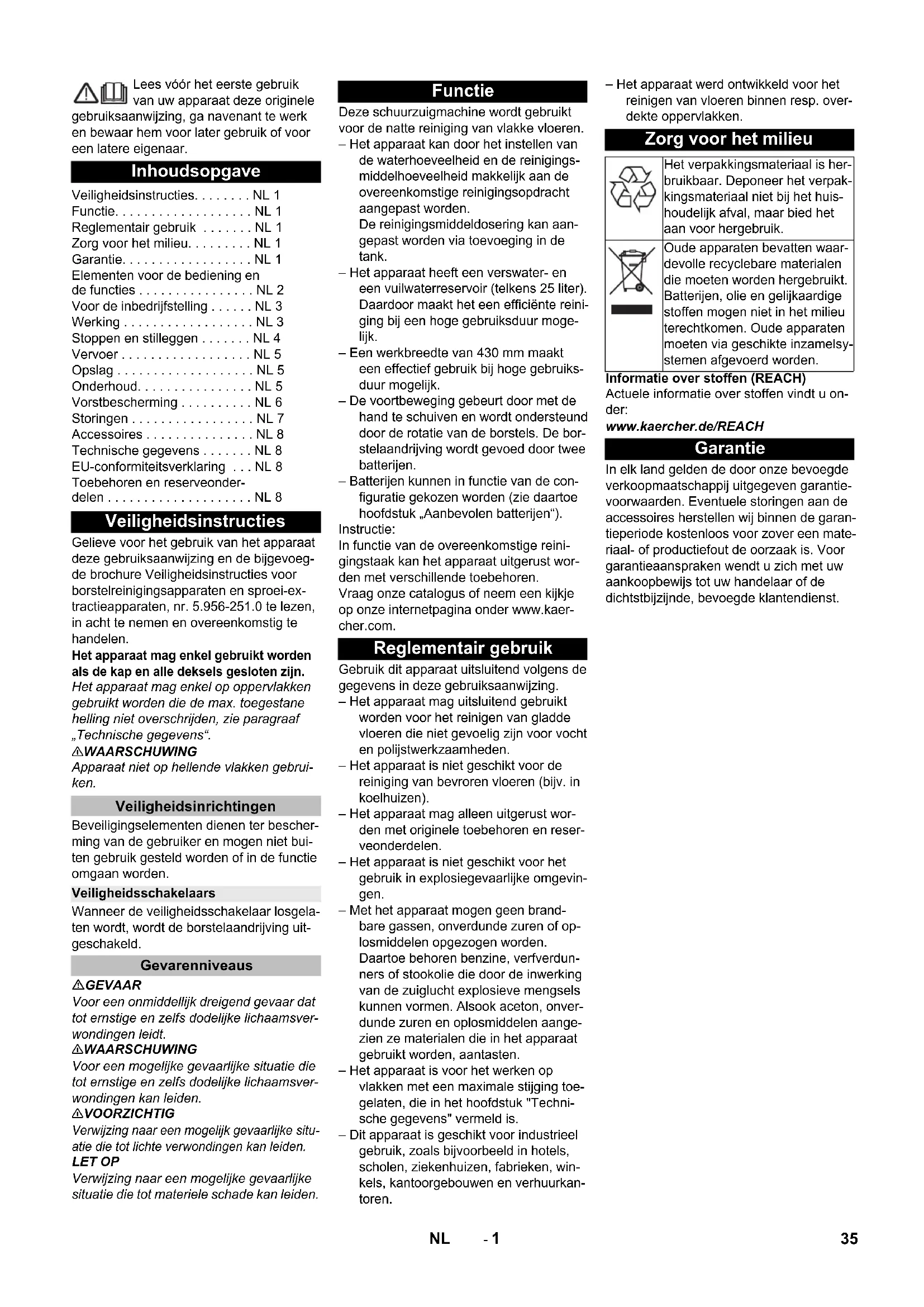 Chairman of the Board of Management Director Regulatory Affairs & Certification Accessori e ricambi 34 IT- 1 Lees vóór het eerste gebruik van uw apparaat deze originele gebruiksaanwijzing, ga navenant te werk en bewaar hem voor later gebruik of voor een latere eigenaar. Gelieve voor het gebruik van het apparaat deze gebruiksaanwijzing en de bijgevoeg- de brochure Veiligheidsinstructies voor borstelreinigingsapparaten en sproei-ex- tractieapparaten, nr. 5.956-251.0 te lezen, in acht te nemen en overeenkomstig te handelen. Het apparaat mag enkel gebruikt worden als de kap en alle deksels gesloten zijn. Het apparaat mag enkel op oppervlakken gebruikt worden die de max. toegestane helling niet overschrijden, zie paragraaf „Technische gegevens“. 몇 WAARSCHUWING Apparaat niet op hellende vlakken gebrui- ken. Beveiligingselementen dienen ter bescher- ming van de gebruiker en mogen niet bui- ten gebruik gesteld worden of in de functie omgaan worden. Wanneer de veiligheidsschakelaar losgela- ten wordt, wordt de borstelaandrijving uit- geschakeld. GEVAAR Voor een onmiddellijk dreigend gevaar dat tot ernstige en zelfs dodelijke lichaamsver- wondingen leidt. 몇 WAARSCHUWING Voor een mogelijke gevaarlijke situatie die tot ernstige en zelfs dodelijke lichaamsver- wondingen kan leiden. 몇 VOORZICHTIG Verwijzing naar een mogelijk gevaarlijke situ- atie die tot lichte verwondingen kan leiden. LET OP Verwijzing naar een mogelijke gevaarlijke situatie die tot materiele schade kan leiden. Deze schuurzuigmachine wordt gebruikt voor de natte reiniging van vlakke vloeren. – Het apparaat kan door het instellen van de waterhoeveelheid en de reinigings- middelhoeveelheid makkelijk aan de overeenkomstige reinigingsopdracht aangepast worden. De reinigingsmiddeldosering kan aan- gepast worden via toevoeging in de tank. – Het apparaat heeft een verswater- en een vuilwaterreservoir (telkens 25 liter). Daardoor maakt het een efficiënte reini- ging bij een hoge gebruiksduur moge- lijk. – Een werkbreedte van 430 mm maakt een effectief gebruik bij hoge gebruiks- duur mogelijk. – De voortbeweging gebeurt door met de hand te schuiven en wordt ondersteund door de rotatie van de borstels. De bor- stelaandrijving wordt gevoed door twee batterijen. – Batterijen kunnen in functie van de con- figuratie gekozen worden (zie daartoe hoofdstuk „Aanbevolen batterijen“). Instructie: In functie van de overeenkomstige reini- gingstaak kan het apparaat uitgerust wor- den met verschillende toebehoren. Vraag onze catalogus of neem een kijkje op onze internetpagina onder www.kaer- cher.com. Gebruik dit apparaat uitsluitend volgens de gegevens in deze gebruiksaanwijzing. – Het apparaat mag uitsluitend gebruikt worden voor het reinigen van gladde vloeren die niet gevoelig zijn voor vocht en polijstwerkzaamheden. – Het apparaat is niet geschikt voor de reiniging van bevroren vloeren (bijv. in koelhuizen). – Het apparaat mag alleen uitgerust wor- den met originele toebehoren en reser- veonderdelen. – Het apparaat is niet geschikt voor het gebruik in explosiegevaarlijke omgevin- gen. – Met het apparaat mogen geen brand- bare gassen, onverdunde zuren of op- losmiddelen opgezogen worden. Daartoe behoren benzine, verfverdun- ners of stookolie die door de inwerking van de zuiglucht explosieve mengsels kunnen vormen. Alsook aceton, onver- dunde zuren en oplosmiddelen aange- zien ze materialen die in het apparaat gebruikt worden, aantasten. – Het apparaat is voor het werken op vlakken met een maximale stijging toe- gelaten, die in het hoofdstuk "Techni- sche gegevens" vermeld is. – Dit apparaat is geschikt voor industrieel gebruik, zoals bijvoorbeeld in hotels, scholen, ziekenhuizen, fabrieken, win- kels, kantoorgebouwen en verhuurkan- toren. – Het apparaat werd ontwikkeld voor het reinigen van vloeren binnen resp. over- dekte oppervlakken. Informatie over stoffen (REACH) Actuele informatie over stoffen vindt u on- der: www.kaercher.de/REACH In elk land gelden de door onze bevoegde verkoopmaatschappij uitgegeven garantie- voorwaarden. Eventuele storingen aan de accessoires herstellen wij binnen de garan- tieperiode kostenloos voor zover een mate- riaal- of productiefout de oorzaak is. Voor garantieaanspraken wendt u zich met uw aankoopbewijs tot uw handelaar of de dichtstbijzijnde, bevoegde klantendienst. Inhoudsopgave Veiligheidsinstructies. . . . . . . . NL 1 Functie. . . . . . . . . . . . . . . . . . . NL 1 Reglementair gebruik . . . . . . . NL 1 Zorg voor het milieu. . . . . . . . . NL 1 Garantie. . . . . . . . . . . . . . . . . . NL 1 Elementen voor de bediening en de functies . . . . . . . . . . . . . . . . NL 2 Voor de inbedrijfstelling . . . . . . NL 3 Werking . . . . . . . . . . . . . . . . . . NL 3 Stoppen en stilleggen . . . . . . . NL 4 Vervoer . . . . . . . . . . . . . . . . . . NL 5 Opslag . . . . . . . . . . . . . . . . . . . NL 5 Onderhoud. . . . . . . . . . . . . . . . NL 5 Vorstbescherming . . . . . . . . . . NL 6 Storingen . . . . . . . . . . . . . . . . . NL 7 Accessoires . . . . . . . . . . . . . . . NL 8 Technische gegevens . . . . . . . NL 8 EU-conformiteitsverklaring . . . NL 8 Toebehoren en reserveonder- delen . . . . . . . . . . . . . . . . . . . . NL 8 Veiligheidsinstructies Veiligheidsinrichtingen Veiligheidsschakelaars Gevarenniveaus Functie Reglementair gebruik Zorg voor het milieu Het verpakkingsmateriaal is her- bruikbaar. Deponeer het verpak- kingsmateriaal niet bij het huis- houdelijk afval, maar bied het aan voor hergebruik. Oude apparaten bevatten waar- devolle recyclebare materialen die moeten worden hergebruikt. Batterijen, olie en gelijkaardige stoffen mogen niet in het milieu terechtkomen. Oude apparaten moeten via geschikte inzamelsy- stemen afgevoerd worden. Garantie 35NL- 2 1 Pluizenzeef 2 Veiligheidsschakelaar 3 Accu * 4 Aftapslang vuil water met doseerinrich- ting 5 Steunrail voor Homebase 6Vlotter 7 Schoonwaterreservoir 8 Vergrendeling schoonwaterreservoir 9 Reiniging