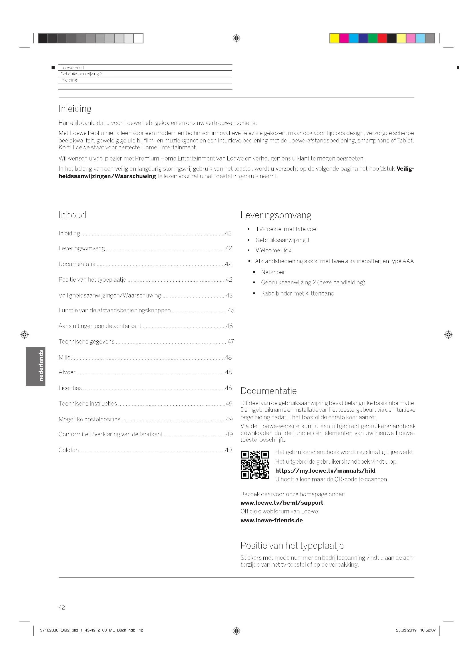 - Inleiding Inleiding Hartelijk dank, dat u voor Loewe hebt gekozen en ons uw vertrouwen schenkt. Met Loewe hebt u niet alleen voor een modern en technisch innovatieve televisie gekozen, maar ook voor tijdloos design, verzorgde scherpe beeldkwaliteit, geweldig geluid bij film- en muziekgenot en een intuïtieve bediening met de Loewe-afstandsbediening, smartphone of Tablet. Kort: Loewe staat voor perfecte Home Entertainment. Wij wensen u veel plezier met Premium Home Entertainment van Loewe en verheugen ons u klant te mogen begroeten. In het belang van een veilig en langdurig storingsvrij gebruik van het toestel, wordt u verzocht op de volgende pagina het hoofdstuk Veilig- heidsaanwijzingen/Waarschuwing te lezen voordat u het toestel in gebruik neemt. Documentatie Dit deel van de gebruiksaanwijzing bevat belangrijke basisinformatie. De ingebruikname en installatie van het toestel gebeurt via de intuïtieve begeleiding nadat u het toestel de eerste keer aanzet. Via de Loewe-website kunt u een uitgebreid gebruikershandboek downloaden dat de functies en elementen van uw nieuwe Loewe- toestel beschrijft. Het gebruikershandboek wordt regelmatig bijgewerkt. Het uitgebreide gebruikershandboek vindt u op https://my.loewe.tv/manuals/bild U hoeft alleen maar de QR-code te scannen. Bezoek daarvoor onze homepage onder: www.loewe.tv/be-nl/support Officiële webforum van Loewe: www.loewe-friends.de Positie van het typeplaatje Stickers met modelnummer en bedrijfsspanning vindt u aan de ach- terzijde van het tv-toestel of op de verpakking. Leveringsomvang TV-toestel met tafelvoet Gebruiksaanwijzing 1 Welcome Box: Afstandsbediening assist met twee alkalinebatterijen type AAA Netsnoer Gebruiksaanwijzing 2 (deze handleiding) Kabelbinder met klittenband Inhoud Inleiding p. 42