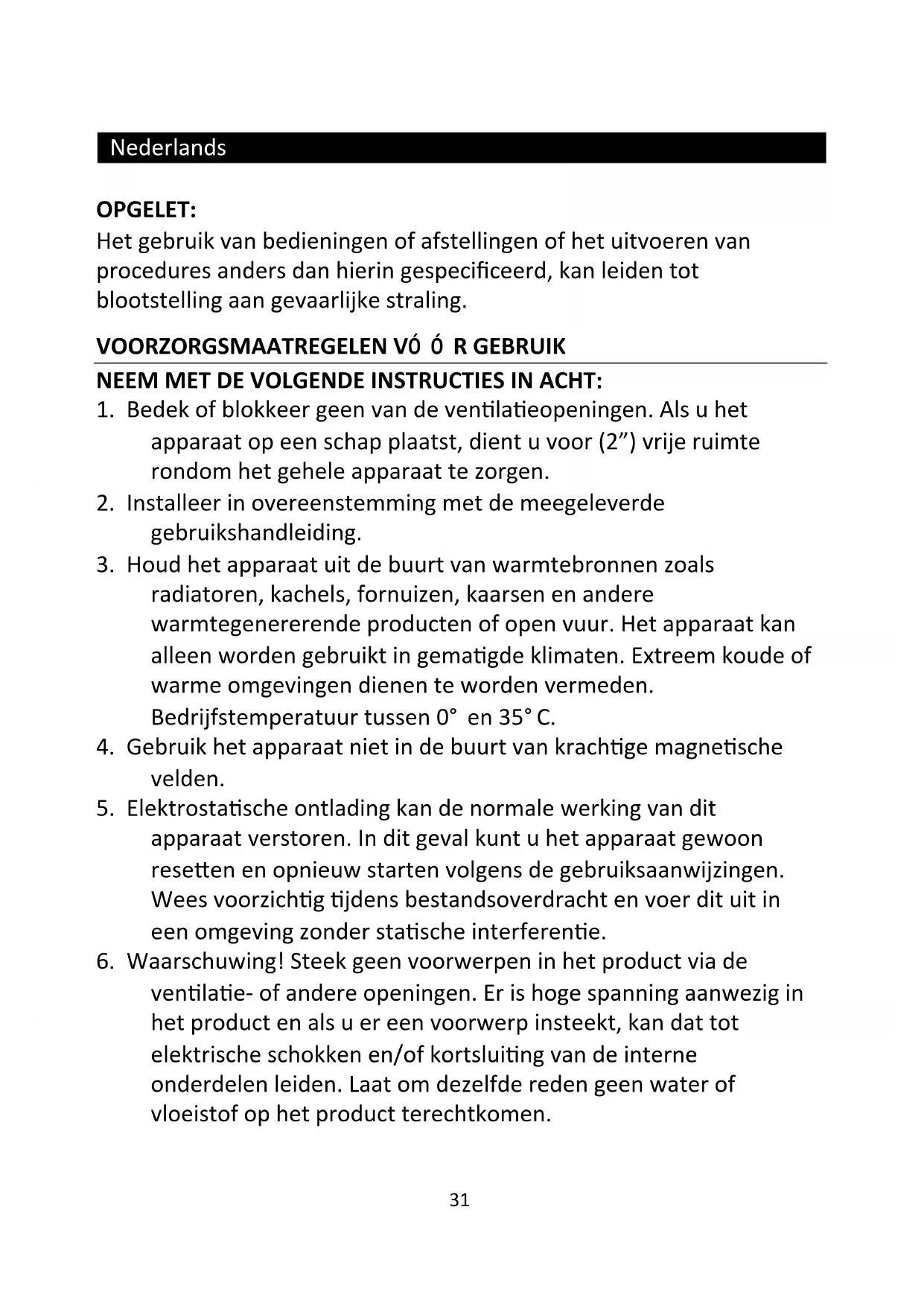 radiatoren, kachels, fornuizen, kaarsen en andere warmtegenererende producten of open vuur. Het apparaat kan alleen worden gebruikt in gematigde klimaten. Extreem koude of warme omgevingen dienen te worden vermeden. Bedrijfstemperatuur tussen 0° en 35°C.