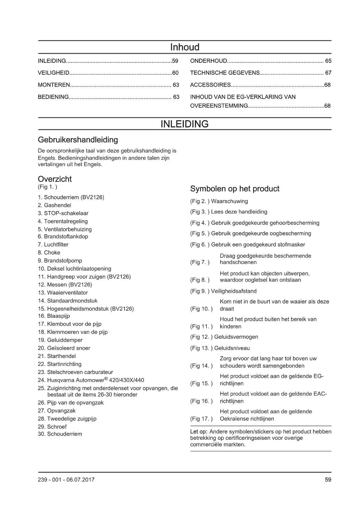 Symbolen op het product (Fig 2. ) Waarschuwing (Fig 3. ) Lees deze handleiding (Fig 4. ) Gebruik goedgekeurde gehoorbescherming (Fig 5. ) Gebruik goedgekeurde oogbescherming (Fig 6. ) Gebruik een goedgekeurd stofmasker (Fig 7. ) Draag goedgekeurde beschermende handschoenen (Fig 8. ) Het product kan objecten uitwerpen, waardoor oogletsel kan ontstaan (Fig 9. ) Veiligheidsafstand (Fig 10. ) Kom niet in de buurt van de waaier als deze draait (Fig 11. ) Houd het product buiten het bereik van kinderen (Fig 12. ) Geluidsvermogen (Fig 13. ) Geluidsniveau (Fig 14. ) Zorg ervoor dat lang haar tot boven uw schouders wordt samengebonden (Fig 15. ) Het product voldoet aan de geldende EG- richtlijnen (Fig 16. ) Het product voldoet aan de geldende EAC- richtlijnen (Fig 17. ) Het product voldoet aan de geldende Oekraïense richtlijnen Let op: Andere symbolen/stickers op het product hebben betrekking op certificeringseisen voor overige commerciële markten.