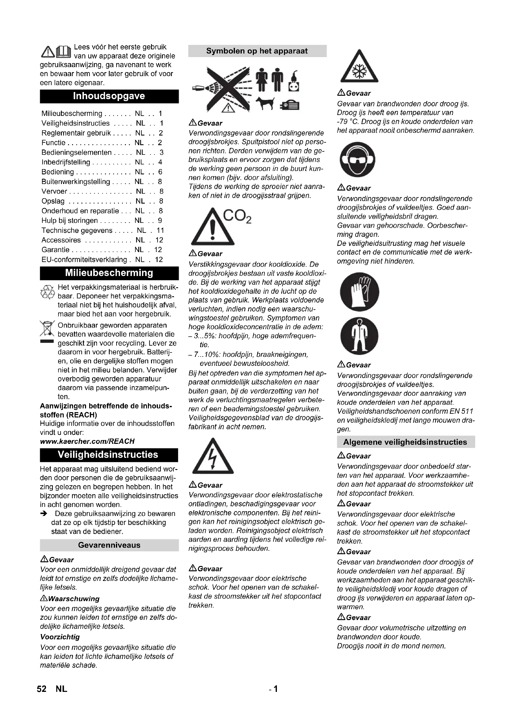 - %: hoofdpijn, hoge ademfrequen- tie. – 7 %: hoofdpijn, braakneigingen, eventueel bewusteloosheid. Bij het optreden van die symptomen het ap- paraat onmiddellijk uitschakelen en naar buiten gaan, bij de verderzetting van het werk de verluchtingsmaatregelen verbete- ren of een beademingstoestel gebruiken. Veiligheidsgegevensblad van de droogijs- fabrikant in acht nemen. Gevaar Verwondingsgevaar door elektrostatische ontladingen, beschadigingsgevaar voor elektronische componenten. Bij het reini- gen kan het reinigingsobject elektrisch ge- laden worden. Reinigingsobject elektrisch aarden en aarding tijdens het volledige rei- nigingsproces behouden. Gevaar Verwondingsgevaar door elektrische schok. Voor het openen van de schakel- kast de stroomstekker uit het stopcontact trekken. Gevaar Gevaar van brandwonden door droog ijs. Droog ijs heeft een temperatuur van -79 °C. Droog ijs en koude onderdelen van het apparaat nooit onbeschermd aanraken. Gevaar Verwondingsgevaar door rondslingerende droogijsbrokjes of vuildeeltjes. Goed aan- sluitende veiligheidsbril dragen. Gevaar van gehoorschade. Oorbescher- ming dragen. De veiligheidsuitrusting mag het visuele contact en de communicatie met de werk- omgeving niet hinderen. Gevaar Verwondingsgevaar door rondslingerende droogijsbrokjes of vuildeeltjes. Verwondingsgevaar door aanraking van koude onderdelen van het apparaat. Veiligheidshandschoenen conform EN 511 en veiligheidskledij met lange mouwen dra- gen. Gevaar Verwondingsgevaar door onbedoeld star- ten van het apparaat. Voor werkzaamhe- den aan het apparaat de stroomstekker uit het stopcontact trekken. Gevaar Verwondingsgevaar door elektrische schok. Voor het openen van de schakel- kast de stroomstekker uit het stopcontact trekken. Gevaar Gevaar van brandwonden door droogijs of koude onderdelen van het apparaat. Bij werkzaamheden aan het apparaat geschik- te veiligheidskledij voor koude dragen of droog ijs verwijderen en apparaat laten op- warmen. Gevaar Gevaar door volumetrische uitzetting en brandwonden door koude. Droogijs nooit in de mond nemen. Inhoudsopgave Milieubescherming p. 10