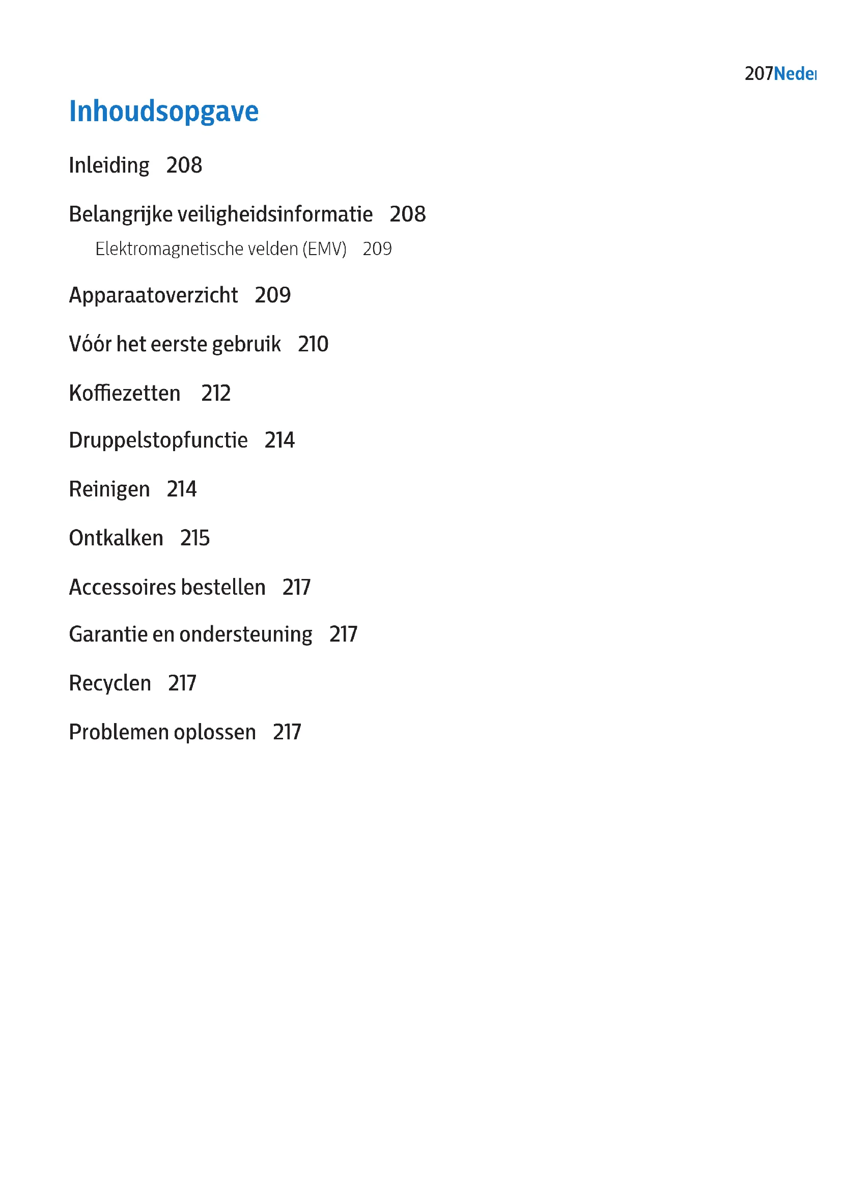 - Ако го отстраните садот од уредот повеќе од 20 секунди за време на подготвувањето, филтерот почнува да претекува. 206 МакедонскиInhoudsopgave Inleiding 208 Belangrijke veiligheidsinformatie 208 Elektromagnetische velden (EMV) 209 Apparaatoverzicht 209 Vóór het eerste gebruik 210 Koezetten 212 Druppelstopfunctie 214 Reinigen 214 Ontkalken 215 Accessoires bestellen 217 Garantie en ondersteuning 217 Recyclen 217 Problemen oplossen 217 207NederlandsInleiding Gefeliciteerd met uw aankoop en welkom bij Philips. Registreer uw product op www.philips.com/welcome en proteer optimaal van de ondersteuning die Philips biedt. Belangrijke veiligheidsinformatie Lees deze belangrijke informatie zorgvuldig door voordat u het apparaat gaat gebruiken en bewaar de informatie om de aanwijzingen later opnieuw te kunnen raadplegen. Gevaar - Dompel het apparaat nooit in water of een andere vloeistof. Waarschuwing - Controleer of het voltage dat wordt aangegeven op het apparaat, overeenkomt met de plaatselijke netspanning voordat u de stekker in het stopcontact steekt. - Sluit het apparaat uitsluitend aan op een geaard stopcontact. - Gebruik het apparaat niet als de stekker, het netsnoer of het apparaat zelf beschadigd is. - Indien het netsnoer beschadigd is, moet het worden vervangen door Philips, een door Philips erkend servicecentrum of personen met vergelijkbare kwalicaties om gevaar te voorkomen. - Dit apparaat kan worden gebruikt door kinderen vanaf 8 jaar en door personen met verminderde lichamelijke, zintuiglijke of geestelijke capaciteiten of weinig ervaring en kennis, mits zij onder toezicht staan of instructies hebben ontvangen aangaande veilig gebruik van het apparaat en zij de gevaren van het gebruik begrijpen. Reiniging en onderhoud mogen alleen door kinderen worden uitgevoerd die ouder zijn dan 8 en alleen onder toezicht. Houd het apparaat en het snoer buiten bereik van kinderen die jonger zijn dan 8 jaar oud. - Kinderen mogen niet met het apparaat spelen. - Laat het snoer niet over de rand van de tafel of het aanrecht hangen waarop het apparaat staat. - Gebruik dit apparaat alleen voor het beoogde doel, om eventuele gevaren of verwondingen te voorkomen. Let op - Spoel het apparaat altijd met vers water voordat u het voor het eerst gebruikt. - Plaats het apparaat niet op een heet oppervlak en voorkom dat het netsnoer in contact komt met hete oppervlakken. - Plaats het apparaat tijdens gebruik niet in een kast. - Haal de stekker uit het stopcontact voordat u het apparaat gaat reinigen en als er tijdens het koezetten problemen optreden. - De lterhouder, het onderste deel van het apparaat, de warmhoudplaat en de kan met koe zijn heet tijdens het koezetten en tot u het apparaat uitschakelt. - Plaats de kan niet op het fornuis of in de magnetron om de koe opnieuw op te warmen. - Dit apparaat is bedoeld voor huishoudelijk en soortgelijk gebruik zoals: in boerderijen; in Bed & Breakfast-achtige omgevingen; in keukens (voor personeel) in winkels, kantoren en andere werkomgevingen; door gasten in hotels, motels en andere verblijfsaccommodaties. - Breng het apparaat altijd naar een door Philips geautoriseerd servicecentrum voor onderzoek of reparatie. Open het apparaat niet of probeer het apparaat niet zelf te repareren. 208 NederlandsElektromagnetische velden (EMV) Dit Philips-apparaat voldoet aan alle toepasselijke richtlijnen en voorschriften met betrekking tot blootstelling aan elektromagnetische velden. Apparaatoverzicht 1 Filter 2 Filtergedeelte 3 Deksel voor de kan 4 Glazen kan 5 Warmhoudplaat 6 Aan-uitschakelaar 7 Waterreservoir 8 Filterdeksel 9 Deksel van waterreservoir