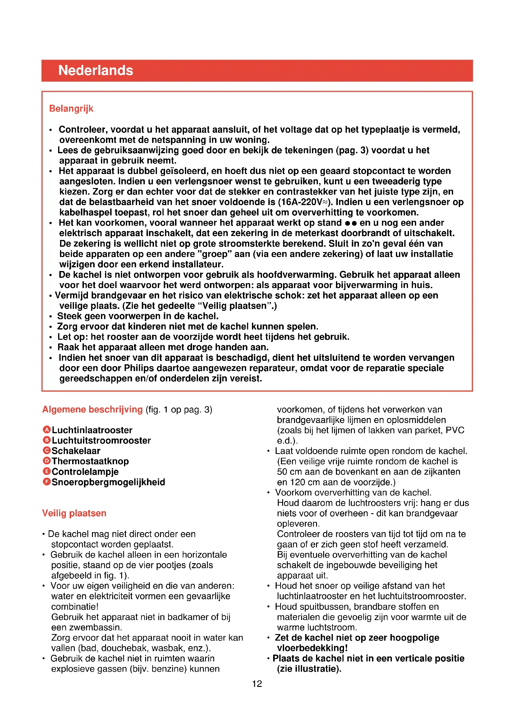 Schoonmaken - Zet de keuzeschakelaar (C) in stand O om het apparaat uit te schakelen. - Neem de stekker uit het stopcontact. - Wacht totdat de kachel voldoende is afgekoeld. - U kunt de buitenkant van de kachel schoonmaken met een vochtige doek. Zorg ervoor dat er geen water in het apparaat komt. - Met behulp van de stofzuiger (kleine zuigmond met langharige borstel) kunt u het luchtinlaat- rooster en het luchtuitstroomrooster schoonmaken. Wij raden u aan dit minstens twee keer per jaar te doen.15 Descrizione generale (vedere fig. 1 a pag. 3) A Griglia entrata aria B Griglia uscita aria C Selettore D Termostato E Spia F Scomparto cavo Come posizionare l’apparecchio in modo sicuro