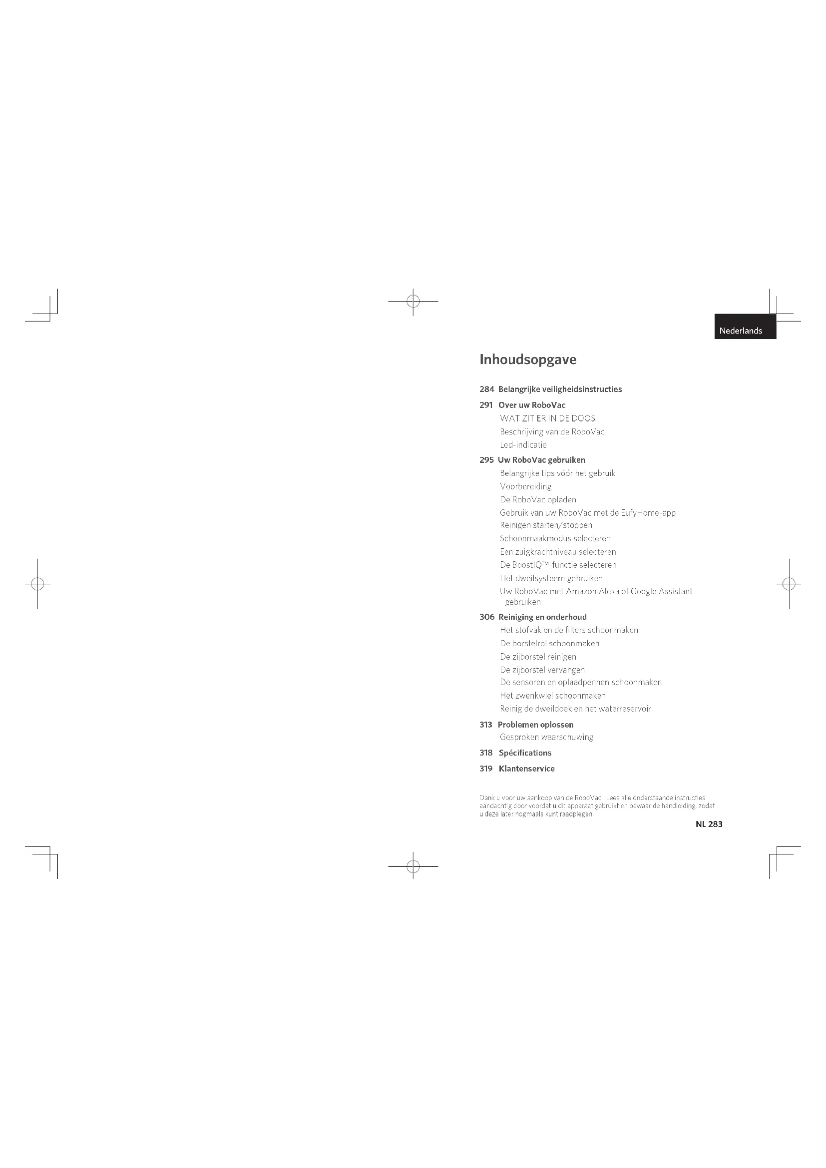Beschrijving van de RoboVac Led-indicatie 295 Uw RoboVac gebruiken Belangrijke tips vóór het gebruik Voorbereiding De RoboVac opladen Gebruik van uw RoboVac met de EufyHome-app Reinigen starten/stoppen Schoonmaakmodus selecteren Een zuigkrachtniveau selecteren De BoostIQ™-functie selecteren Het dweilsysteem gebruiken Uw RoboVac met Amazon Alexa of Google Assistant gebruiken 306 Reiniging en onderhoud Het stofvak en de filters schoonmaken De borstelrol schoonmaken De zijborstel reinigen De zijborstel vervangen De sensoren en oplaadpennen schoonmaken Het zwenkwiel schoonmaken Reinig de dweildoek en het waterreservoir 313 Problemen oplossen Gesproken waarschuwing 318 Spécifications 319 KlantenserviceNederlands Nederlands 284 NL NL 285 Belangrijke veiligheidsinstructies Houd deze instructies bij de hand tijdens het instellen, gebruiken en onderhouden van dit apparaat om het risico op letsel en schade te beperken. GEBRUIKTE WAARSCHUWINGSSYMBOLEN Dit is het symbool voor een veiligheidswaarschuwing. Met dit symbool wordt u gewezen op mogelijke gevaren die kunnen leiden tot schade en/of ernstig lichamelijk letsel of de dood.