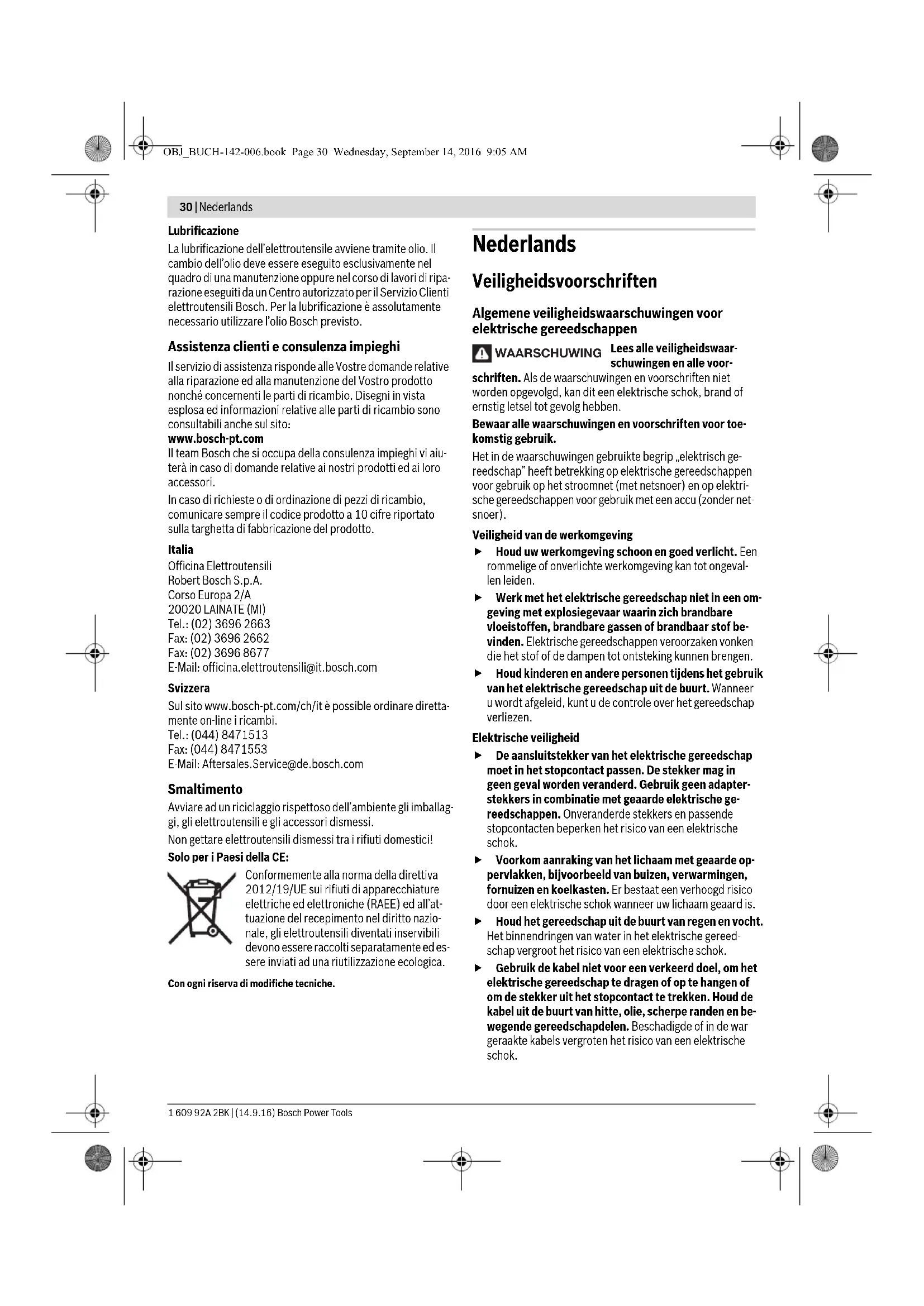 Mandrino portautensile SDS-max Peso in funzione della EPTA-Procedure 01:2014 kg 4,9 Classe di sicurezza /II I dati sono validi per una tensione nominale [U] di 230 V. In caso di ten-sioni differenti e di modelli specifici dei paesi di impiego, questi dati possono variare. OBJ_BUCH-142-006.book Page 28 Wednesday, September 14, 2016 9:05 AMItaliano | 29 Bosch Power Tools 1 609 92A 2BK | (14.9.16) Una protezione antipolvere danneggiata deve essere sostituita immediatamente. Si consiglia di affidare l’operazione ad un Centro di Assistenza Clienti. Montaggio dell’utensile accessorio (vedi figura A) – Pulire il gambo dell’utensile accessorio ed applicarvi un leggero strato di grasso. – Spingere il mandrino di serraggio 2 all’indietro ed inserire l’utensile accessorio ruotandolo nel mandrino portautensi- le. Rilasciare il mandrino di serraggio 2 per bloccare l’uten- sile accessorio. – Controllare il bloccaggio tirando l’accessorio. Smontaggio dell’utensile accessorio (vedi figura B) – Spingere il mandrino di serraggio 2 all’indietro ed estrarre l’accessorio. Aspirazione polvere/aspirazione trucioli Polveri e materiali come vernici contenenti piombo, alcuni tipi di legname, minerali e metalli possono essere dannosi per la salute. Il contatto oppure l’inalazione delle polveri possono causare reazioni allergiche e/o malattie delle vie respiratorie dell’operatore oppure delle persone che si tro- vano nelle vicinanze. Determinate polveri come polvere da legname di faggio o di quercia sono considerate cancerogene, in modo parti- colare insieme ad additivi per il trattamento del legname (cromato, protezione per legno). Materiale contenente amianto deve essere lavorato esclusivamente da persona- le specializzato. – Provvedere per una buona aerazione del posto di lavoro. – Si consiglia di portare una mascherina protettiva con classe di filtraggio P2. Osservare le norme in vigore nel Vostro paese per i mate- riali da lavorare. Uso Messa in funzione Osservare la tensione di rete! La tensione della rete de- ve corrispondere a quella indicata sulla targhetta dell’elettroutensile. Gli elettroutensili con l’indicazio- ne di 230 V possono essere collegati anche alla rete di 220 V. Accendere/spegnere –Per accendere l’elettroutensile premere l’interruttore di avvio/arresto 5 e tenerlo premuto. –Per fissare in posizione l’interruttore di avvio/arresto pre- muto 5 spingere verso l’alto il tasto di bloccaggio 4. –Per spegnere l’elettroutensile rilasciare di nuovo l’interrut- tore di avvio/arresto 5 oppure se è bloccato con il tasto di bloccaggio 4, premere brevemente l’interruttore di av- vio/arresto 5 e rilasciarlo di nuovo. In caso di temperature basse l’elettroutensile raggiunge la propria completa potenza del colpo soltanto dopo un certo periodo di tempo. Tale periodo di avviamento può essere ridotto battendo una volta sul pavimento l’utensile accessorio inserito nell’elettro- utensile. Per risparmiare energia accendere l’elettroutensile solo se lo stesso viene utilizzato. Cambio della posizione scalpellatura (Vario-Lock) Si ha la possibilità di bloccare lo scalpello in 12 posizioni. In questo modo è possibile prendere rispettivamente la posizio- ne di lavoro ottimale. – Applicare lo scalpello nel mandrino portautensile. – Spingere in avanti l’anello di regolazione dello scalpello 3 e ruotare con l’anello di regolazione dello scalpello 3 lo scal- pello portandolo alla posizione richiesta. – Rilasciare l’anello di regolazione dello scalpello 3 e ruotare lo scalpello fino allo scatto in posizione dello stesso. Indicazioni operative Prima di qualunque intervento sull’elettroutensile estrarre la spina di rete dalla presa. Affilare gli scalpelli (vedi figura C) Solo con attrezzi di scalpellatura bene affilati si possono rag- giungere buoni risultati. Provvedere dunque ad affilarli sem- pre a tempo debito. In questo modo si garantisce una lunga durata degli attrezzi e buoni risultati delle operazioni. Riaffilatura Smerigliare gli attrezzi di scalpellatura utilizzando mole abra- sive, p. es. corindone prezioso, mantenendo sempre costan- te l’aggiunta di acqua. Nella figura si trovano valori indicativi per questa operazione. Accertarsi che sui taglienti non si arri- vi alla presenza di colore di rinvenimento; ciò compromette- rebbe la durezza degli attrezzi di scalpellatura. Per operazioni di fucinatura surriscaldare lo scalpello fino a 850–1050 °C (rosso chiaro fino a giallo). Per operazioni di tempratura surriscaldare lo scalpello fino a circa 900 °C e temprare in bagno d’olio. Al termine dell’ope- razione, lasciarlo nel forno per ca. un’ora a 320 °C (colore di rinvenimento blu chiaro). Manutenzione ed assistenza Manutenzione e pulizia Prima di qualunque intervento sull’elettroutensile estrarre la spina di rete dalla presa. Per poter garantire buone e sicure operazioni di lavoro, tenere sempre puliti l’elettroutensile e le prese di ven- tilazione. Una protezione antipolvere danneggiata deve essere sostituita immediatamente. Si consiglia di affidare l’operazione ad un Centro di Assistenza Clienti. Qualora si rendesse necessaria una sostituzione del cavo di collegamento, la stessa deve essere effettuata dalla Bosch oppure da un centro di assistenza clienti autorizzato per elet- troutensili Bosch per evitare pericoli per la sicurezza. OBJ_BUCH-142-006.book Page 29 Wednesday, September 14, 2016 9:05 AM30 | Nederlands 1 609 92A 2BK | (14.9.16) Bosch Power Tools Lubrificazione La lubrificazione dell’elettroutensile avviene tramite olio. Il cambio dell’olio deve essere eseguito esclusivamente nel quadro di una manutenzione oppure nel corso di lavori di ripa- razione eseguiti da un Centro autorizzato per il Servizio Clienti elettroutensili Bosch. Per la lubrificazione è assolutamente necessario utilizzare l’olio Bosch previsto. Assistenza clienti e consulenza impieghi Il servizio di assistenza risponde alle Vostre