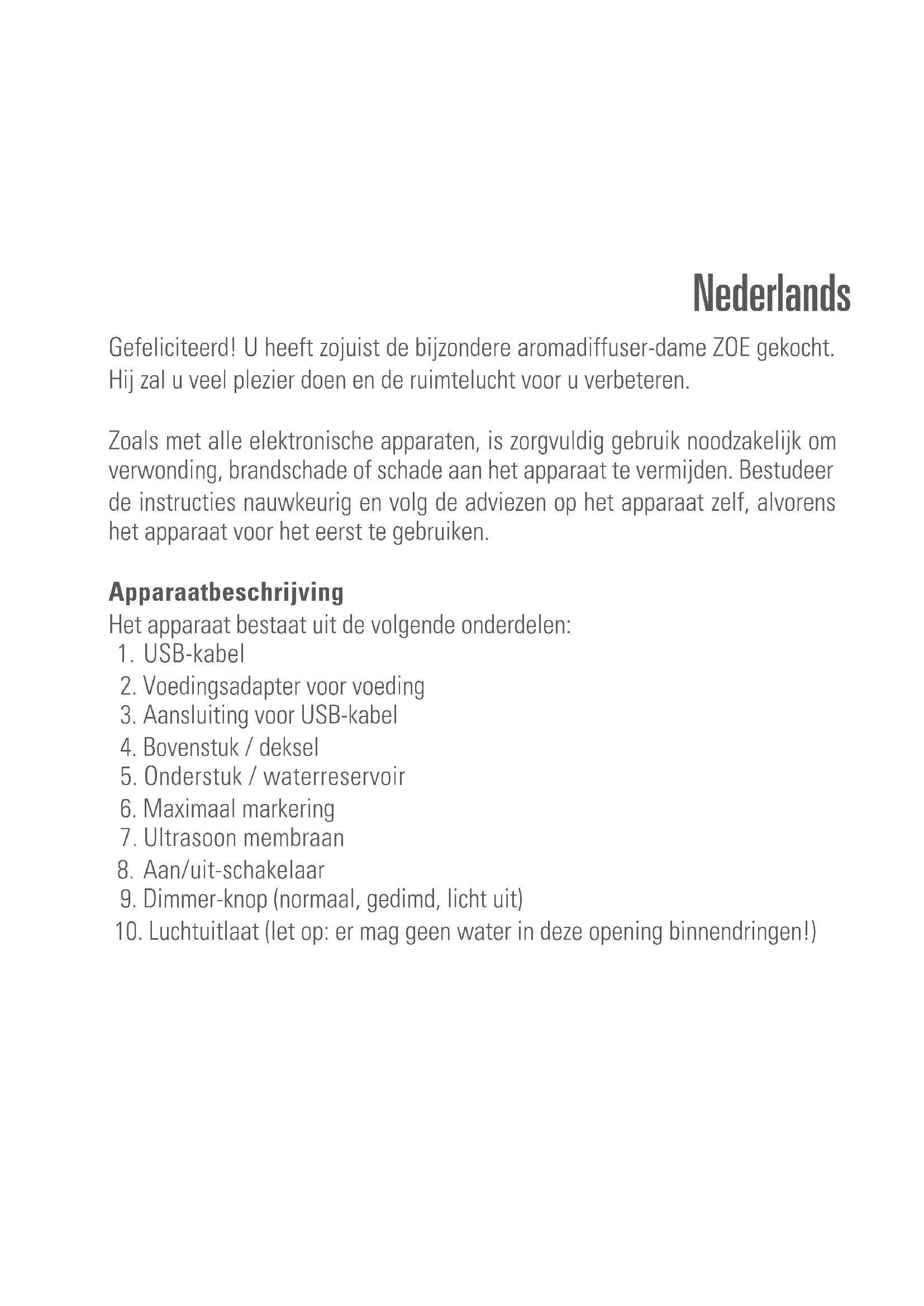 bel (1) aan op de voedingsadapter (2) en op het apparaat (3) en steek de adapter in een geschikt stopcontact. U kunt ook de USB-kabel aansluiten op een andere voedingsbron, zoals een pc of een externe batterij (batterij/ powerbank) met 2 A. 2. Neem het deksel eraf (4) om water en geurstoffen te vullen.3. Vul het waterreservoir (5) vervolgens tot de maximaal markering (MAX) (6) met water. Er mag geen water in de luchtuitlaat (10) terechtkomen. Hierdoor kan er schade aan het apparaat optreden en vervallen alle aanspraken op garantie. Belangrijk: Verplaats Zoe niet zolang deze gevuld is met water. Er zou water in de elektronica kunnen lopen.