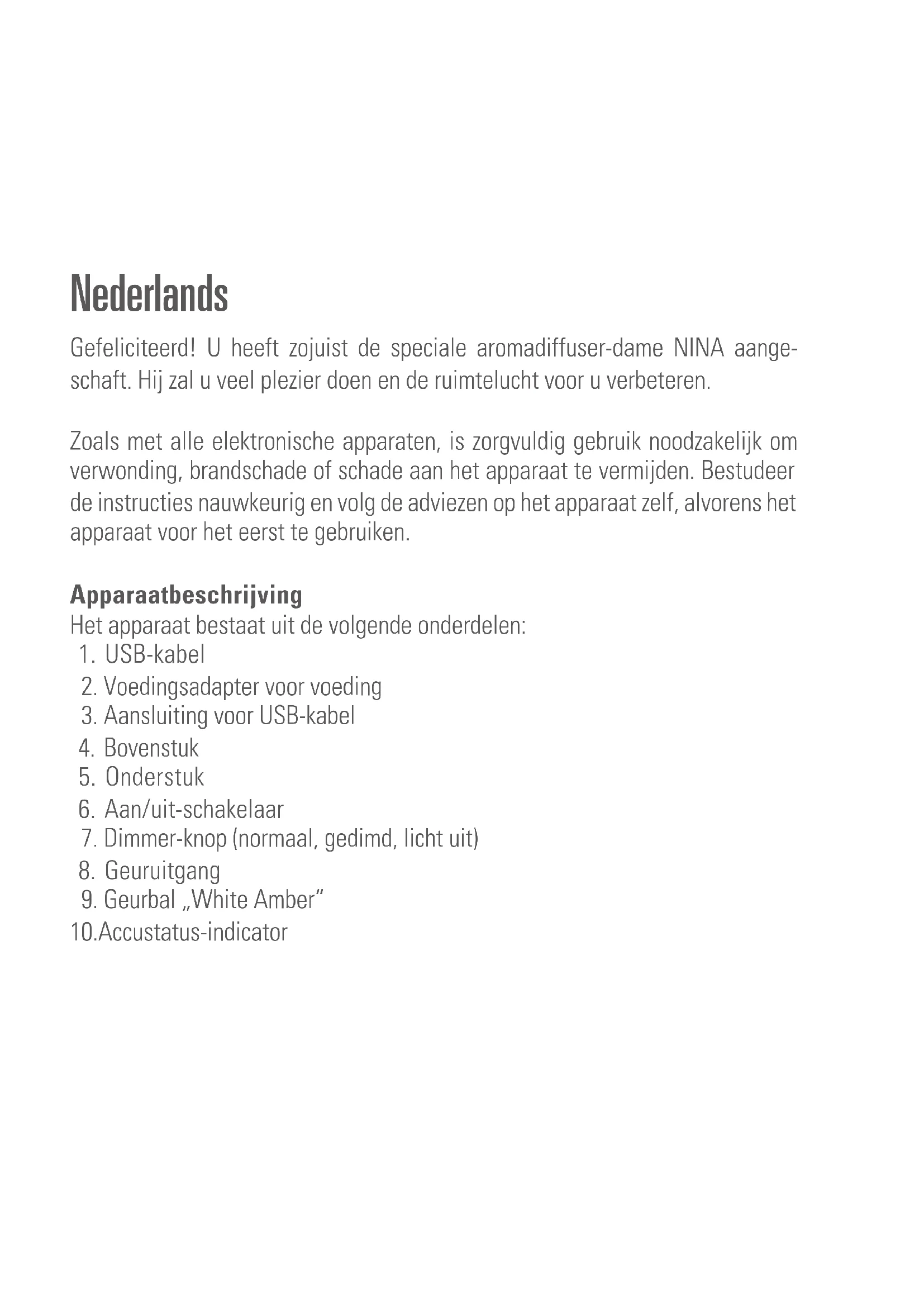 - Duw geen voorwerp in het toestel. Haal het zuiveringssysteem niet uit elkaar.• Als het toestel niet meer te repareren is, maak het dan onmiddellijk onbruik- baar en geef het af op het inzamelingspunt. Verwijdering De Europese richtlijn 2012 / 19 / EG inzake Afval van Elektrische en Elektro- nische Apparatuur (AEEA), vereist dat oude elektrische huishoudapparaten niet in de normale gemeentelijke ongesorteerde afvalstroom mogen worden weggegooid. Oude apparaten moeten apart worden ingezameld om recycling en hergebruik van de materialen daarin te optimaliseren en de gevolgen op het milieu en de volksgezondheid te verminderen. Het symbool met de doorgekruis- te “vuilnisbak op wieltjes” op het product, herinnert u aan uw verplichting, dat het toestel bij verwijdering gescheiden ingezameld moet worden. Consumenten moeten contact opnemen met hun lokale autoriteit of verkoper voor informatie betreffende de juiste verwijdering van hun oude toestel. De geurbal bestaat uit chloorvrij kunststof en kan via het huishoudelijk afval worden ver- wijderd. Afvalverwijdering accu: niet via het huisafval verwijderen. De elektrode is verpakt in isolerend papier, kan worden gerecycled en hergebruikt.Specificaties Nominale spanning 100–240 V / 50/60 Hz Nominale vermogen 3.5 W Looptijd tot 50 h Afmetingen 100 x 160 mm (diameter x hoogte) Gewicht 360 g Geluidsdrempel < 26 dB(A) Temperatuurbereik oplading accu 0–45 °C Accumodel PN103040 EU-verordening CE / RoHS / EAC De inhoud van deze gebruiksaanwijzing kan zonder voorafgaand bericht worden gewijzigdDansk Tillykke! Du har netop anskaffet dig den usædvanlige aroma diffuser-dame NINA.Den vil bringe dig megen glæde og forbedre dit indeklima. Som med alle elektriske husholdningsapparater er særlig pleje en nødvendighed også med dette produkt, for at undgå fysisk skade, brandskade eller beskadi- gelse af produktet. Læs venligst denne brugsanvisning grundigt før produktet tages i brug, og følg sikkerhedsanvisningerne på selve produktet. Beskrivelse af apparatet Apparatet består af følgende hoveddele: