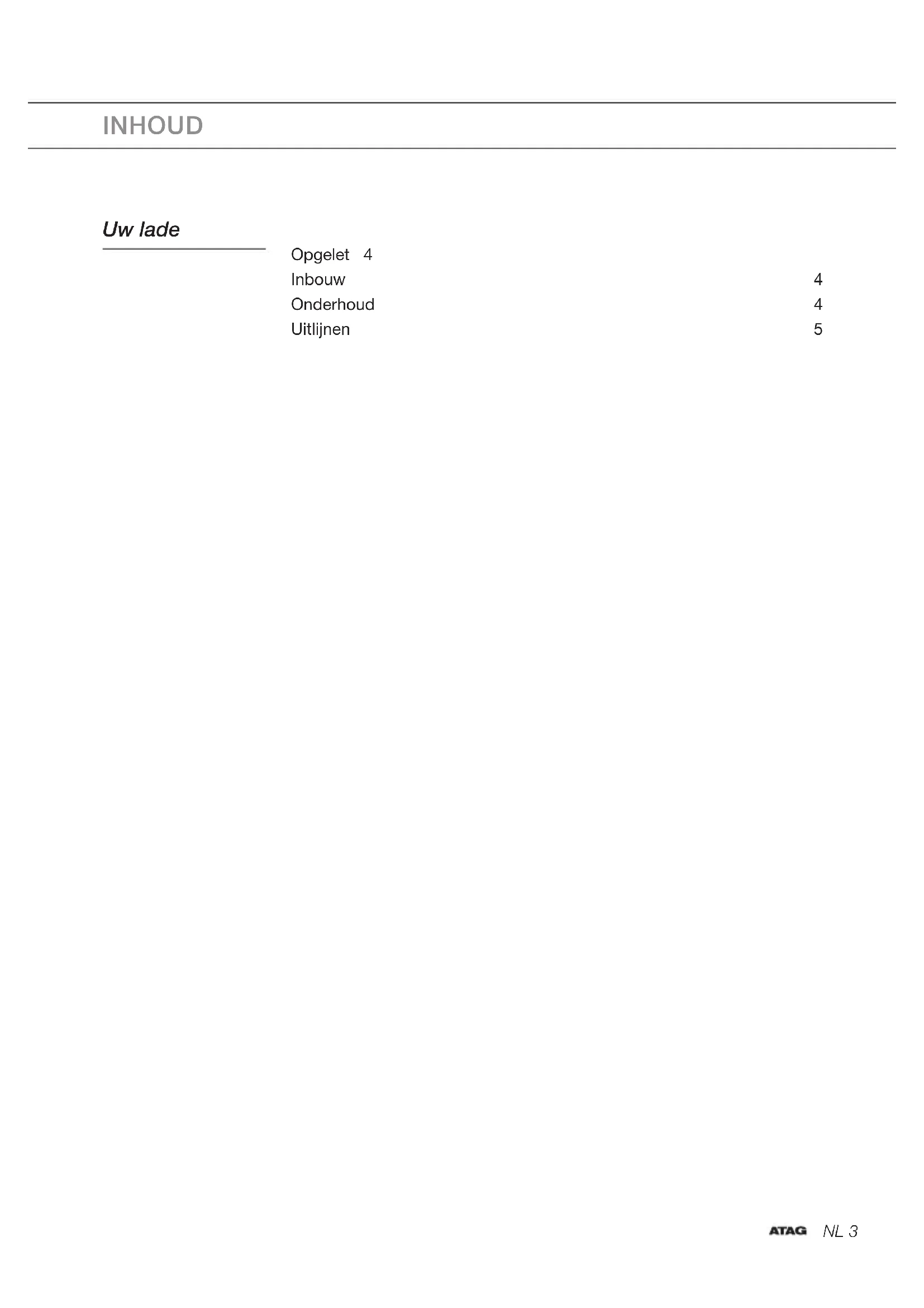 Manual EN 3 - EN 6 Gebruikte pictogrammen - Pictogrammes utilisés Benutzte Piktogramme - Pictograms used Belangrijk om te weten - Important à savoir Wissenswertes - Important information Tip - Conseil - Tipp - TipNL 3 INHOUD Uw lade Opgelet 4 Inbouw 4 Onderhoud 4 Uitlijnen 5NL 4 Opgelet Klim niet of zit niet op de open lade. De schuifrails zouden beschadigd worden. De lade mag met max. 25 kg belast worden. Inbouw