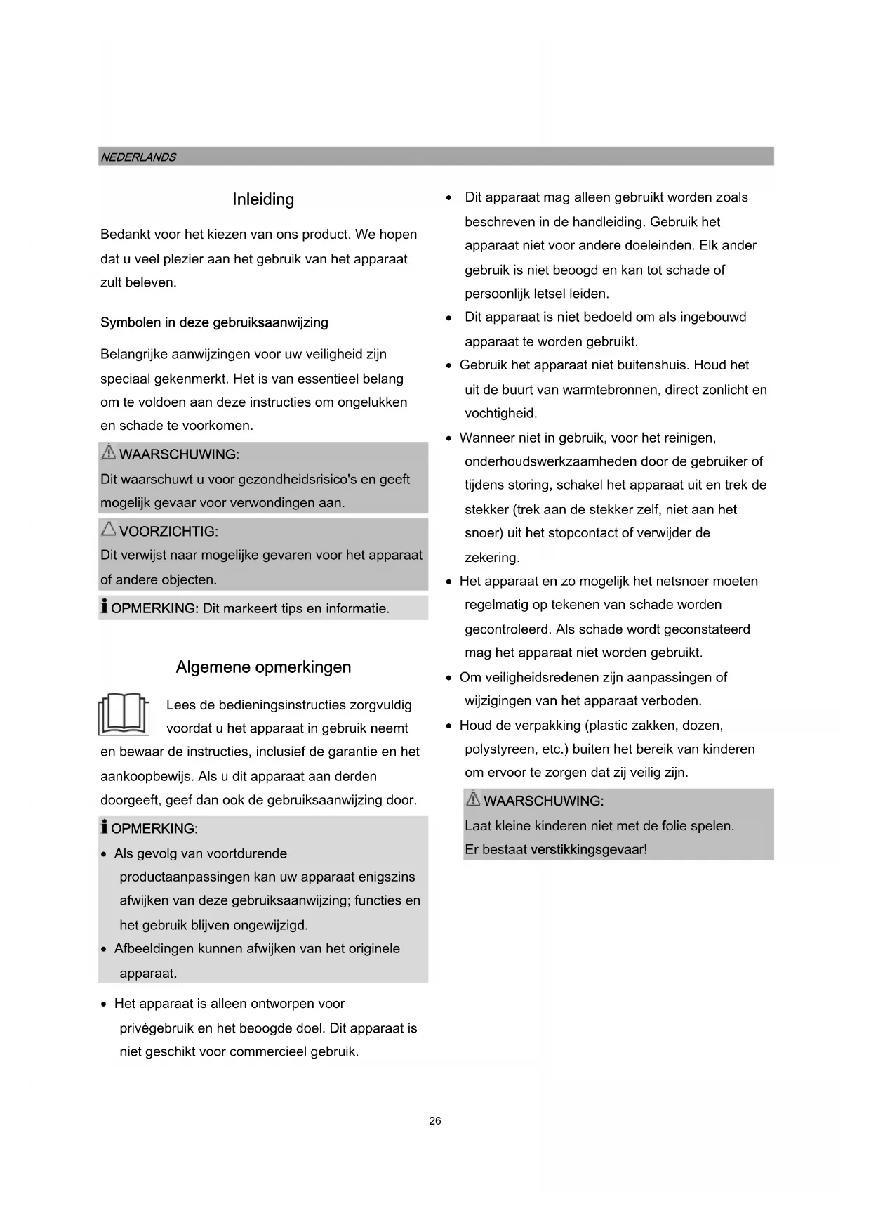 NEDERLANDS Inleiding Bedankt voor het kiezen van ons product. We hopen dat u veel plezier aan het gebruik van het apparaat zult beleven. Symbolen in deze gebruiksaanwijzing Belangrijke aanwijzingen voor uw veiligheid zijn speciaal gekenmerkt. Het is van essentieel belang om te voldoen aan deze instructies om ongelukken en schade te voorkomen. WAARSCHUWING: Dit waarschuwt u voor gezondheidsrisico's en geeft mogelijk gevaar voor verwondingen aan. VOORZICHTIG: Dit verwijst naar mogelijke gevaren voor het apparaat of andere objecten. OPMERKING: Dit markeert tips en informatie. Algemene opmerkingen