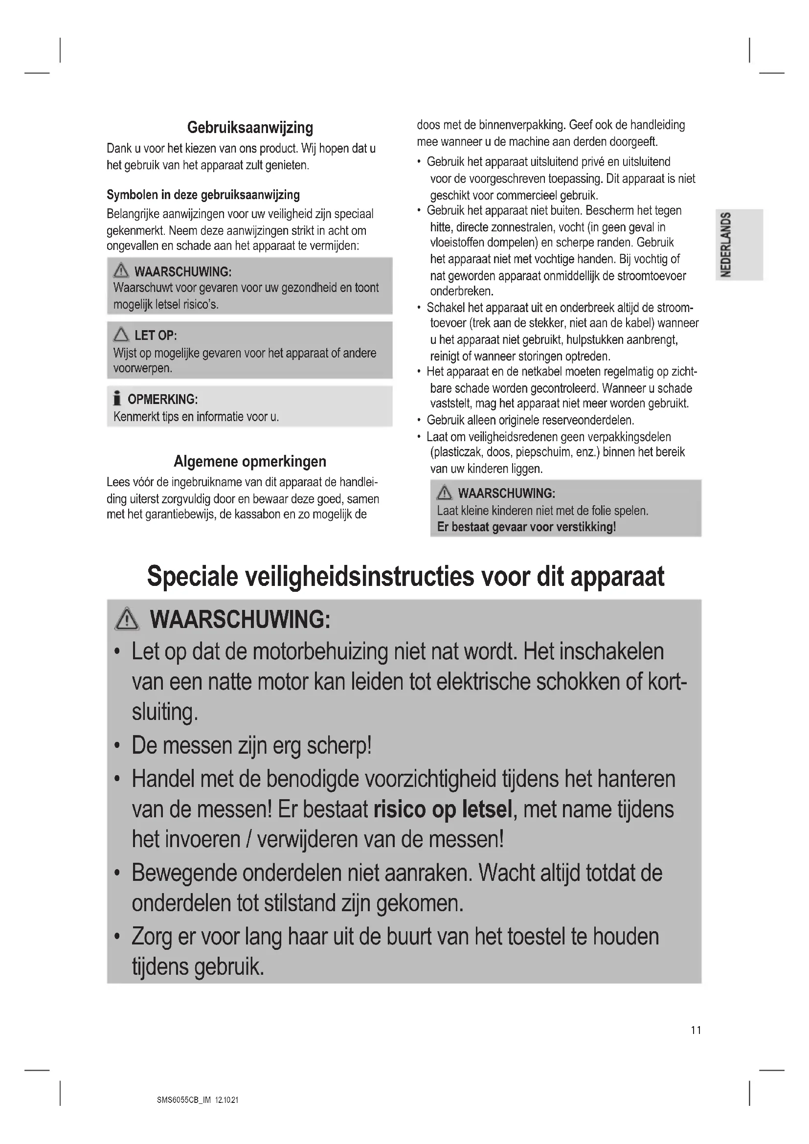 - Zorg er voor lang haar uit de buurt van het toestel te houden tijdens gebruik.SMS6055CB_IM 12.10.21