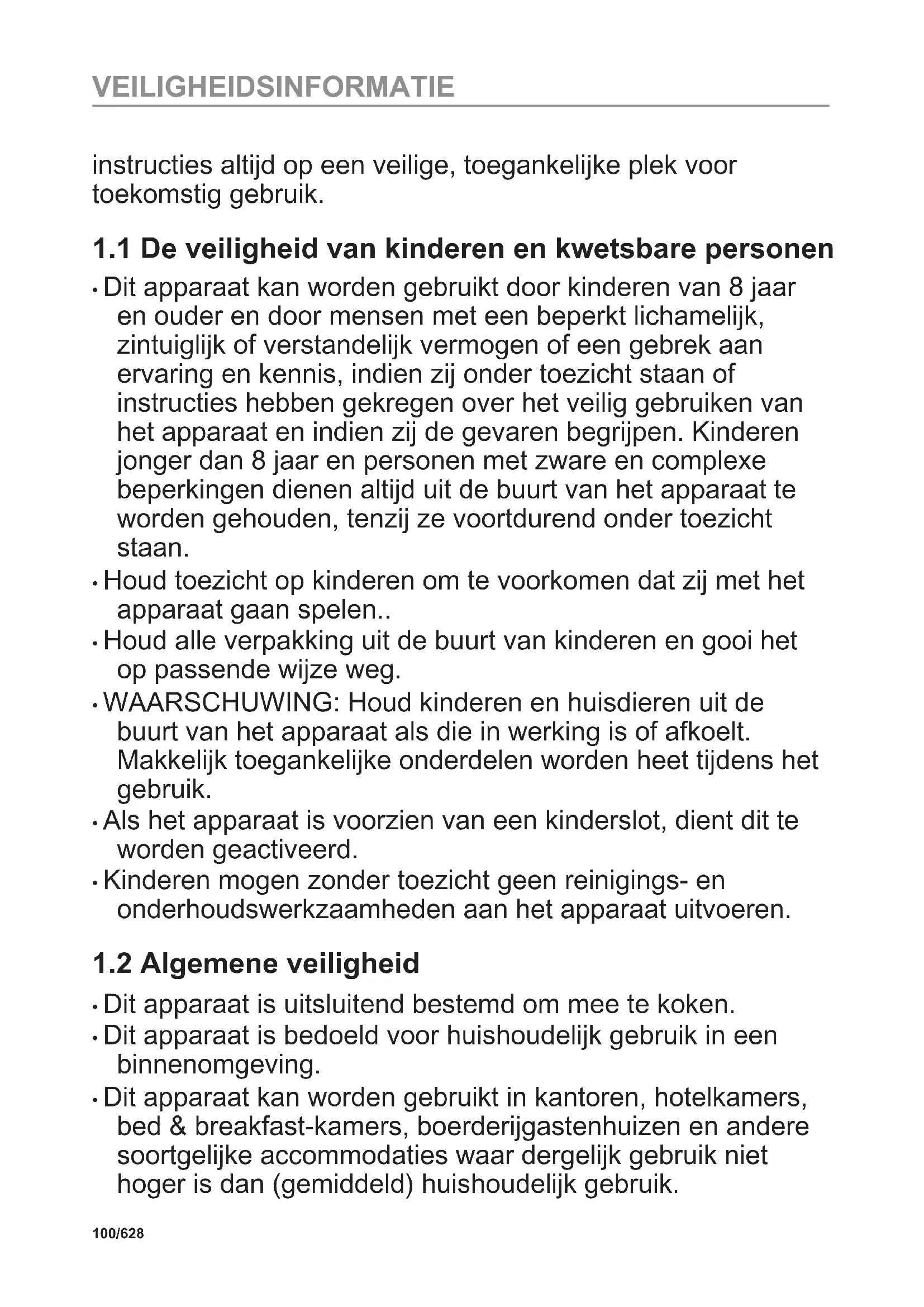 Lees zorgvuldig de meegeleverde instructies voor installatie en gebruik van het apparaat. De fabrikant is niet verantwoordelijk voor verwondingen of schade die voortvloeit uit de onjuiste installatie of het onjuiste gebruik. Bewaar de 99/628 VEILIGHEIDSINFORMATIEinstructies altijd op een veilige, toegankelijke plek voor toekomstig gebruik.