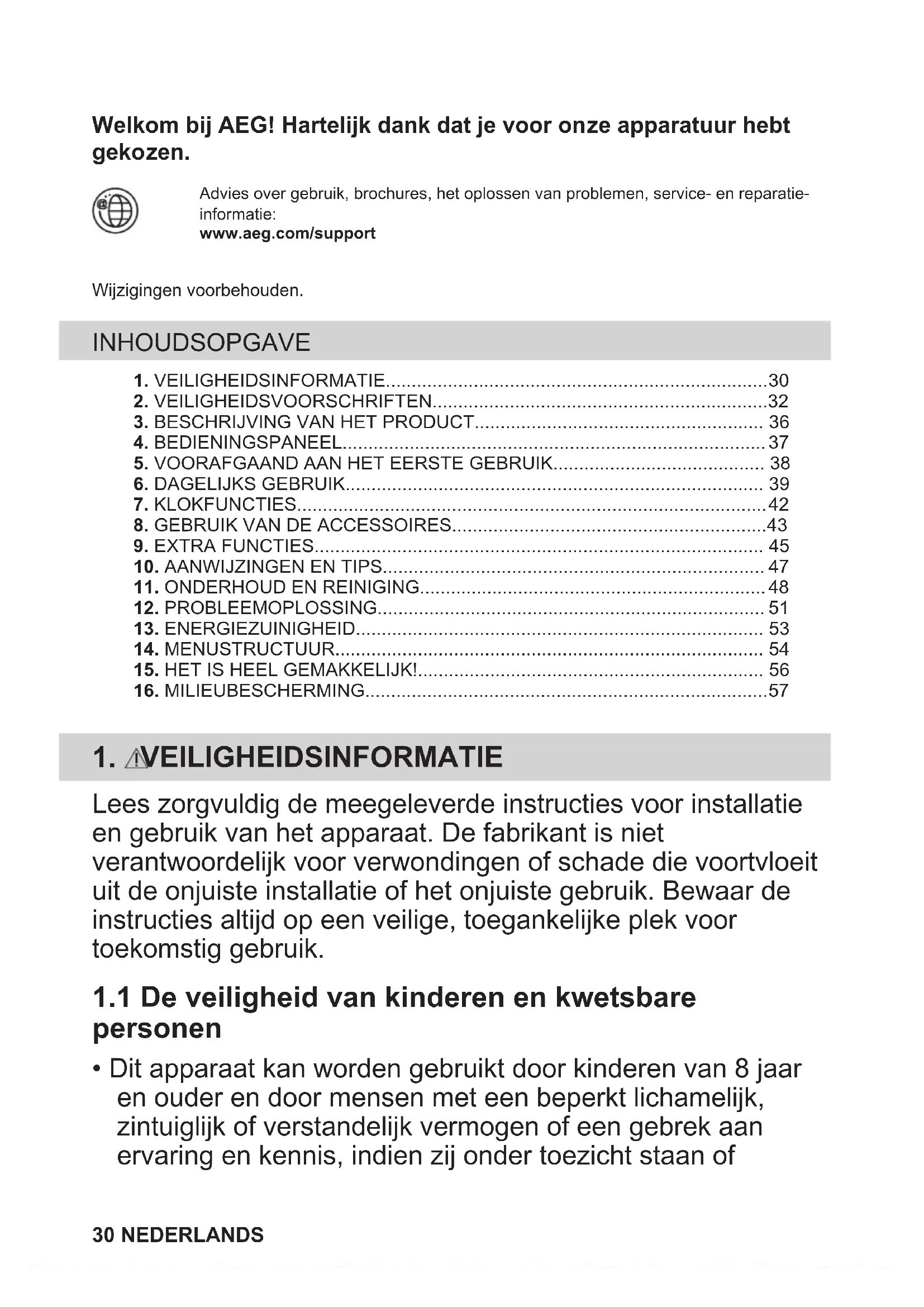 - selecteer de gewenste functie. Druk op: . Snel uit Schakel het appa‐ raat op elk gewenst moment uit, vanuit elk scherm of bij elk bericht. - ingedrukt houden tot het apparaat uitschakelt. Begin met koken Stap 1 Stap 2 Stap 3 Stap 4 Stap 5 - indrukken om het apparaat in te scha‐ kelen. - selecteer de ver‐ warmingsfunctie. Instellen: tempera‐ tuur. - druk hierop om te bevestigen. - druk hierop om te beginnen met koken. Leer snel koken Gebruik de automatische programma’s om snel een gerecht te koken met de standaardinstellingen: Kook- En Bakas‐ sistent Stap 1 Stap 2 Stap 3 Stap 4 Druk op: . Druk op: . Druk op: Kook- En Bakassistent. Kies het gerecht. Gebruik snelle functies om de kooktijd in te stellen 10% Finish assist Gebruik 10% Finish assist om extra tijd toe te voegen wanneer 10% van de bereidingstijd overblijft. Druk op +1min om de bereidingstijd te verlengen. 56 NEDERLANDS16. MILIEUBESCHERMING Recycleer de materialen met het symbool . Gooi de verpakking in een geschikte afvalcontainer om het te recycleren. Bescherm het milieu en de volksgezondheid en recycleer op een correcte manier het afval van elektrische en elektronische apparaten. Gooi apparaten gemarkeerd met het symbool niet weg met het huishoudelijk afval. Breng het product naar het milieustation bij u in de buurt of neem contact op met de gemeente. NEDERLANDS 57Welcome to AEG! Thank you for choosing our appliance. Get usage advice, brochures, trouble shooter, service and repair information:www.aeg.com/supportSubject to change without notice. CONTENTS