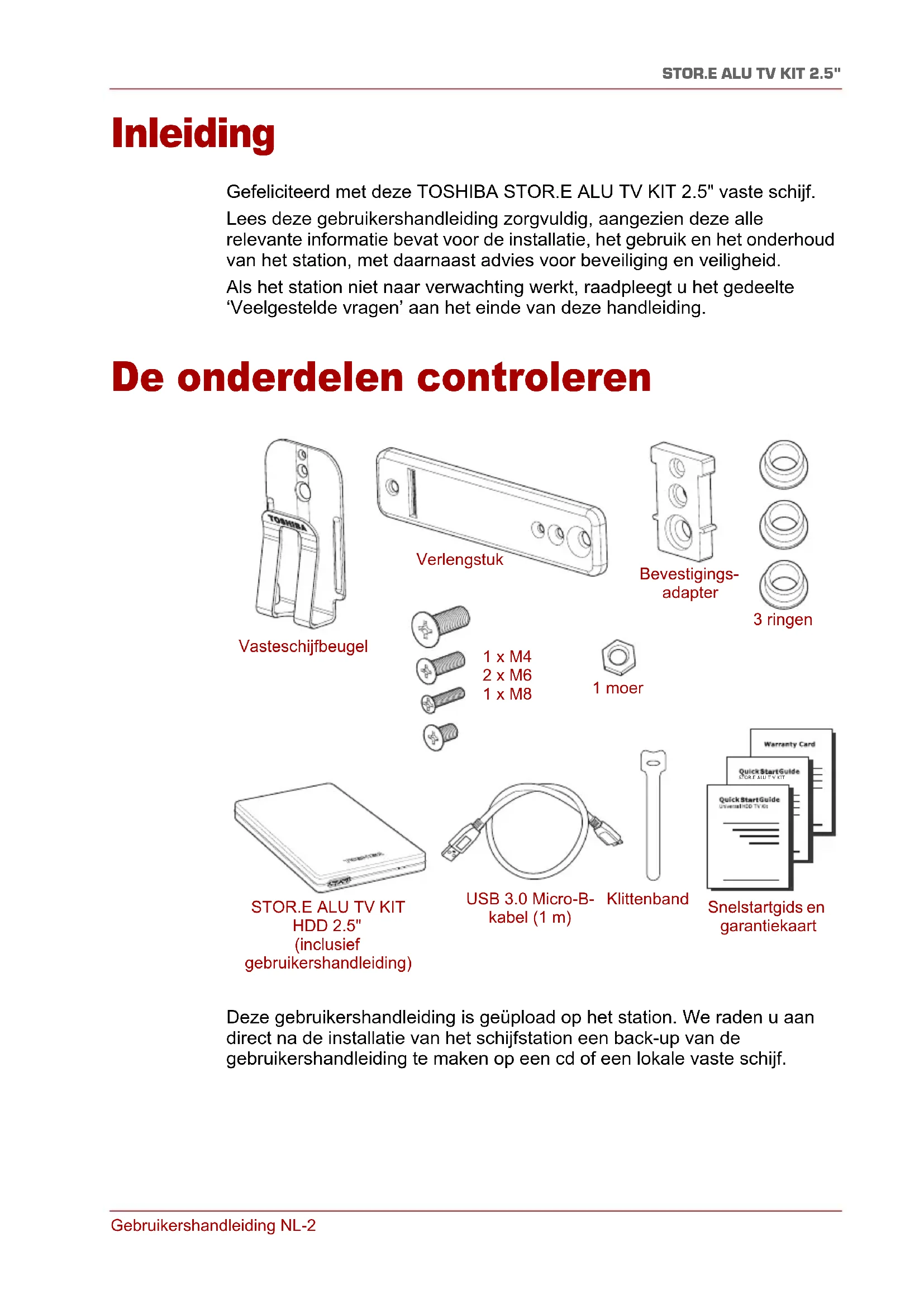 Inleiding Gefeliciteerd met deze TOSHIBA STOR.E ALU TV KIT 2.5" vaste schijf. Lees deze gebruikershandleiding zorgvuldig, aangezien deze alle relevante informatie bevat voor de installatie, het gebruik en het onderhoud van het station, met daarnaast advies voor beveiliging en veiligheid. Als het station niet naar verwachting werkt, raadpleegt u het gedeelte ‘Veelgestelde vragen’ aan het einde van deze handleiding. De onderdelen controleren Deze gebruikershandleiding is geüpload op het station. We raden u aan direct na de installatie van het schijfstation een back-up van de gebruikershandleiding te maken op een cd of een lokale vaste schijf.