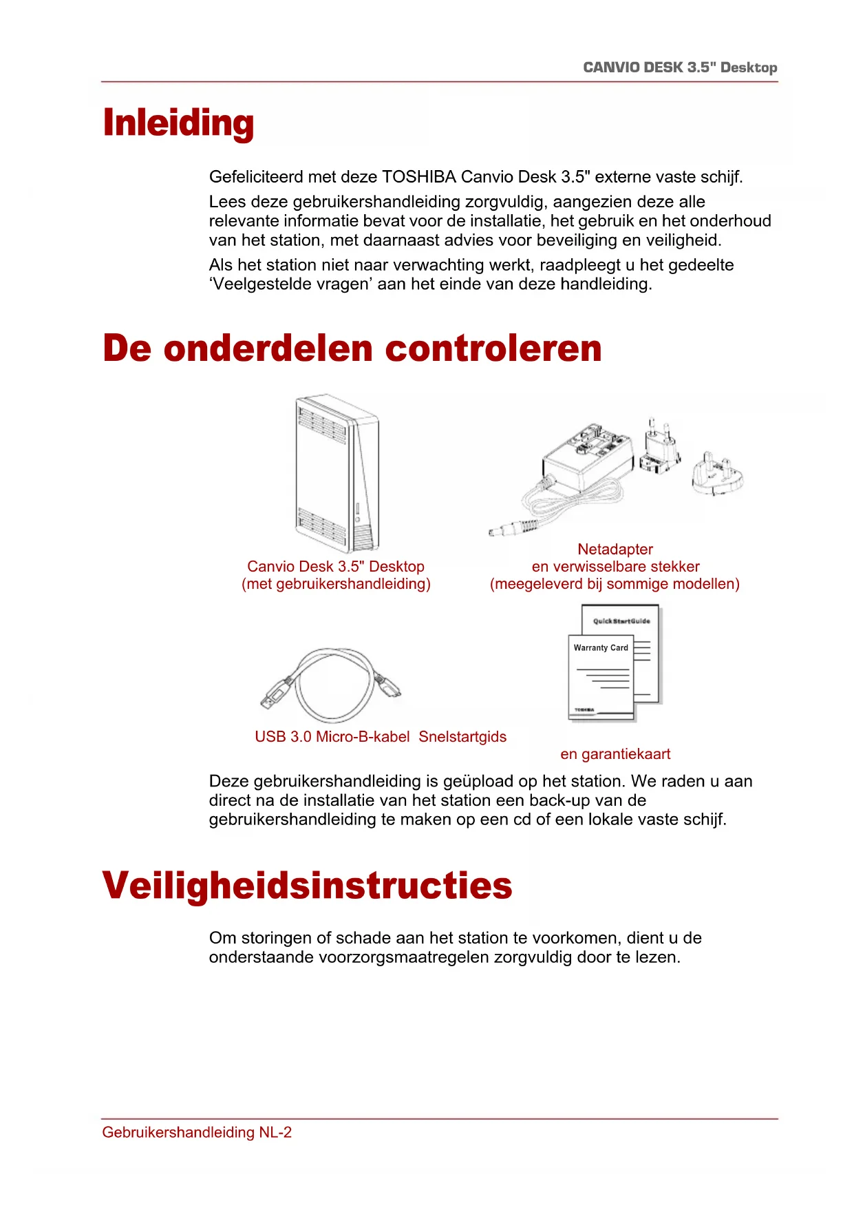 - CANVIO DESK 3.5" Desktop Als ik probeer het station te formatteren, verschijnt het bericht dat de formattering niet kan worden voltooid. A: Dit kan worden veroorzaakt doordat u het station formatteert met het bestandssysteem FAT. Probeer het bestandssysteem NTFS. Hiermee zou u het probleem moeten oplossen. TOSHIBA-ondersteuning Hebt u hulp nodig? Raadpleeg de ondersteuningspagina van TOSHIBA voor vaste schijven en opslagapparaten: www.toshiba.eu/externalstorage/support Voor garantieclaims raadpleegt u: computers.toshiba.eu/options-warranty Voorschriften Overeenstemming met CE-richtlijnen Werkomgeving De elektromagnetische compatibiliteit (EMC) van dit product is gecontroleerd en is standaard voor deze productcategorie voor zogeheten commerciële, lichtindustriële en woonomgevingen. Andere gebruiksomgevingen zijn niet door Toshiba gecontroleerd en het gebruik van dit product in deze gebruiksomgevingen kan beperkt zijn of niet worden aanbevolen. Mogelijke gevolgen van het gebruik van dit product in een niet gecontroleerde gebruiksomgeving zijn: storing van andere producten of van dit product in de nabije omgeving met als gevolg tijdelijke defecten of verlies/beschadiging van gegevens. Voorbeelden van niet gecontroleerde gebruiksomgevingen en bijbehorende adviezen: ■ Industriële omgeving (bijvoorbeeld waar krachtstroom van 380 V (drie fasen) wordt gebruikt): risico van storing van dit product door mogelijke sterke elektromagnetische velden, met name in de buurt van zware machines of elektriciteitsinstallaties. Dit product is voorzien van het CE-keurmerk, in overeenstemming met de vereisten van de toepasselijke EU-richtlijnen. De verantwoording voor de toewijzing van CE-keurmerken ligt bij Toshiba Europe GmbH, Hammfelddamm 8, 41460 Neuss, Duitsland. Een kopie van de officiële verklaring van overeenstemming is verkrijgbaar op de volgende website: http://epps.toshiba-teg.com.Gebruikershandleiding NL-10 CANVIO DESK 3.5" Desktop ■ Medische omgeving: de naleving van de richtlijnen voor medische producten is niet gecontroleerd door Toshiba. Daarom mag dit product zonder verdere controle niet worden gebruikt als medisch product. Het gebruik in normale kantooromgevingen, zoals in ziekenhuizen, mag geen probleem zijn als er geen beperkingen zijn voorgeschreven door de verantwoordelijke leiding. ■ In een voertuig: raadpleeg de instructies van het betreffende voertuig voor advies met betrekking tot het gebruik van dit product (of deze productcategorie). ■ In een vliegtuig: volg de aanwijzingen van het vliegtuigpersoneel voor beperkingen in gebruik. Andere omgevingen zonder EMC ■ Gebruik buitenshuis: aangezien dit een normaal thuis-/kantoorapparaat is, is dit product niet bestand tegen vocht en is het niet schokbestendig. ■ Explosieve omgeving: het gebruik van dit product in een dergelijke speciale werkomgeving (Ex) is niet toegestaan. De volgende informatie is alleen van toepassing voor lidstaten van de EU: REACH - Verklaring van overeenstemming De nieuwe verordening van de Europese Unie (EU) met betrekking tot chemische stoffen, REACH (Registration, Evaluation, Authorization and Restriction of Chemicals ofwel registratie, beoordeling, autorisatie en beperkingen van chemische stoffen), is vanaf 1 juni 2007 van kracht. Toshiba voldoet aan alle REACH-vereisten en verplicht zich klanten informatie te geven over de chemische stoffen in onze producten in overeenstemming met de REACH-verordening. Afvalverwerking van producten Dit symbool geeft aan dat dit product niet als huishoudelijk afval mag worden behandeld. Door ervoor te zorgen dat dit product op de juiste wijze als afval wordt verwerkt, helpt u mogelijke schadelijke gevolgen voor het milieu en de menselijke gezondheid voorkomen. Deze gevolgen kunnen voortvloeien uit een onjuiste afvalverwerking van dit product. Neem voor meer informatie over recycling van dit product contact op met het gemeentekantoor, de afvalverwerkende instantie of de winkel waar u het product hebt gekocht.Gebruikershandleiding NL-11 CANVIO DESK 3.5" Desktop Kennisgevingen ©2014 TOSHIBA Europe GmbH. Alle rechten voorbehouden. TOSHIBA behoudt zich het recht voor om technische wijzigingen aan te brengen. TOSHIBA aanvaardt geen enkele aansprakelijkheid voor schade die direct of indirect voortvloeit uit fouten, weglatingen of afwijkingen tussen het product en de documentatie. De naam Toshiba en de Toshiba-logo’s zijn gedeponeerde handelsmerken van Toshiba. Andere handelsmerken in dit document zijn eigendom van de respectieve eigenaren. Fouten en omissies uitgesloten.Brukerhåndbok NO-1 CANVIO DESK 3.5" Desktop Brukerhåndbok Innhold Innledning p. 2