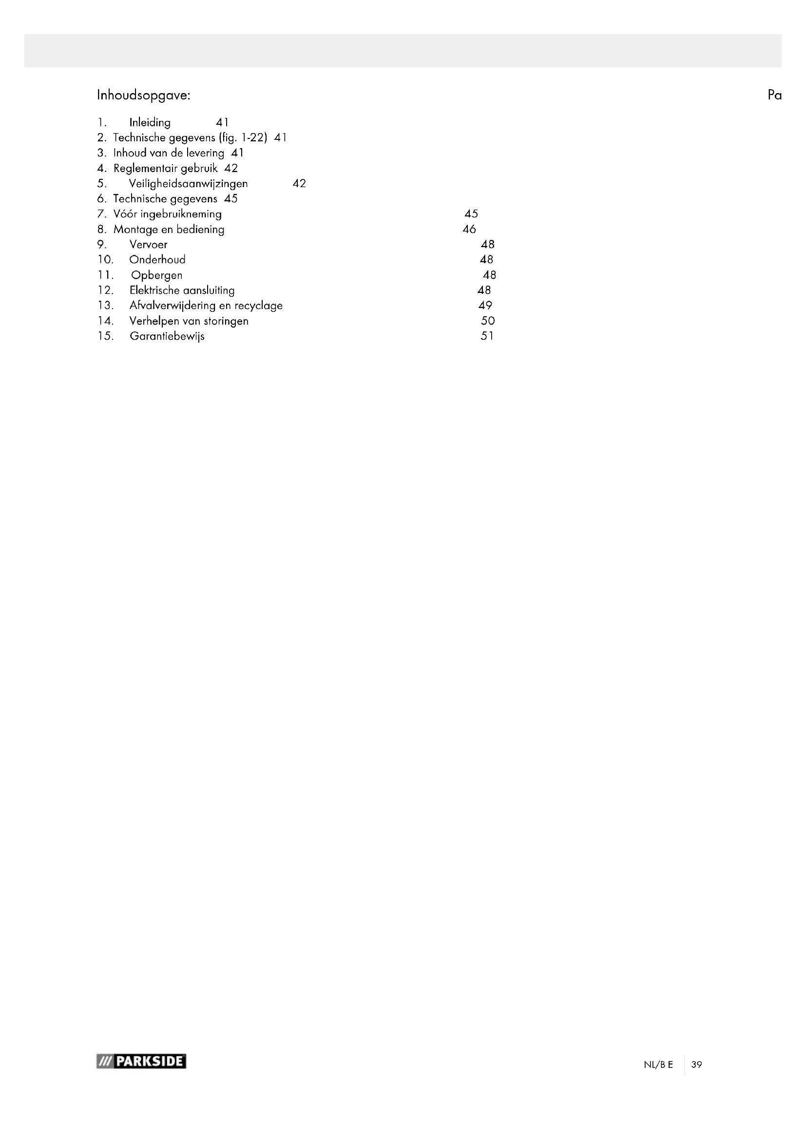 - De garantieprestatie heeft uitsluitend betrekking op gebreken die te wijten zijn aan materiaal- of fabricagefouten en is beperkt tot het verhelpen van deze gebr eken of het vervangen van het apparaat. Wij wijzen erop dat onze apparaten over eenkomstig hun bestem- ming niet geconstrueerd zijn voor commercieel, ambachtelijk of industrieel gebruik. Een garantieover eenkomst komt daarom niet tot stand als het apparaat in ambachtelijke of industriële bedrijven alsmede b ij gelijk te stellen activiteiten wordt gebruikt. Uitgesloten van onze garantie zijn verder schadeloosstellingen voor transportschade, scha de door nietnaleving van de montage-instructies of op gr ond van ondeskundige installatie, niet-naleving van de handleiding (zoals door b.v. aansluiting op een verkeer de netspanning of strooms- oort), oneigenlijke of onoordeelkundige toepassingen (zoals b.v. overbelasting van het apparaat of gebruik van niet toegestane inzetge- reedschappen of toebehor en), niet-naleving van de onderhouds- en veiligh eidsbepalingen, binnendringen van vr eemde voorwerpen in het apparaat (zoals b.v. zand, stenen of stof), gebruikmaking van geweld of invloeden van buitenaf (zoals b.v . schade door neervallen) alsmede door normale slijtage die zich bij het doelmatig gebruik van het ap paraat voordoet. Er kan geen aanspraak op garantie wor den gemaakt als op het apparaat r eeds ingrepen werden uitgevoerd.