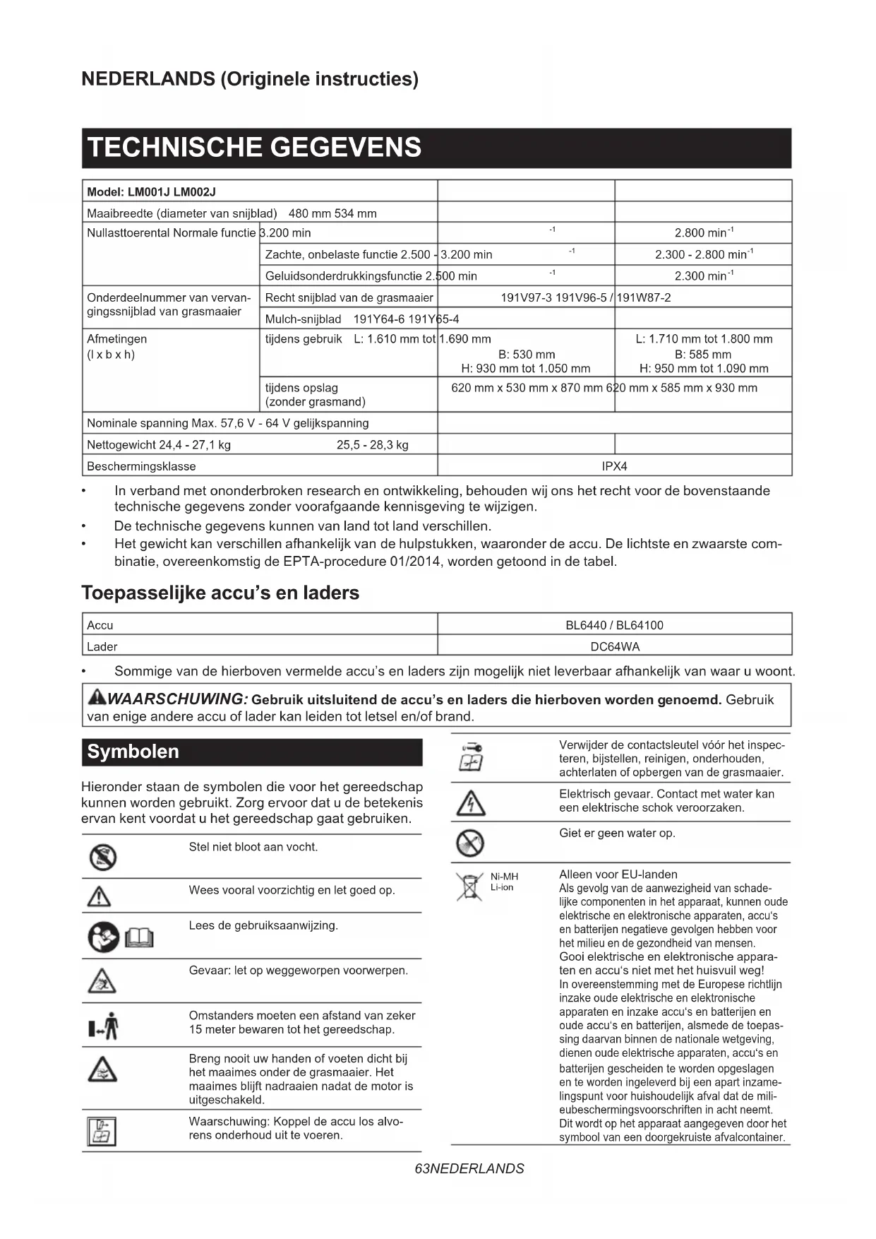 Onderdeelnummer van vervan- gingssnijbladvangrasmaaier Rechtsnijbladvandegrasmaaier 191V97-3 191V96-5 / 191W87-2 Mulch-snijblad 191Y64-6 191Y65-4 Afmetingen (l x b x h) tijdensgebruik L: 1.610 mm tot 1.690 mm B: 530 mm H: 930 mm tot 1.050 mm L: 1.710 mm tot 1.800 mm B: 585 mm H: 950 mm tot 1.090 mm tijdensopslag (zonder grasmand) 620 mm x 530 mm x 870 mm 620 mm x 585 mm x 930 mm Nominale spanning Max.57,6V-64Vgelijkspanning Nettogewicht 24,4 - 27,1 kg 25,5 - 28,3 kg Beschermingsklasse IPX4