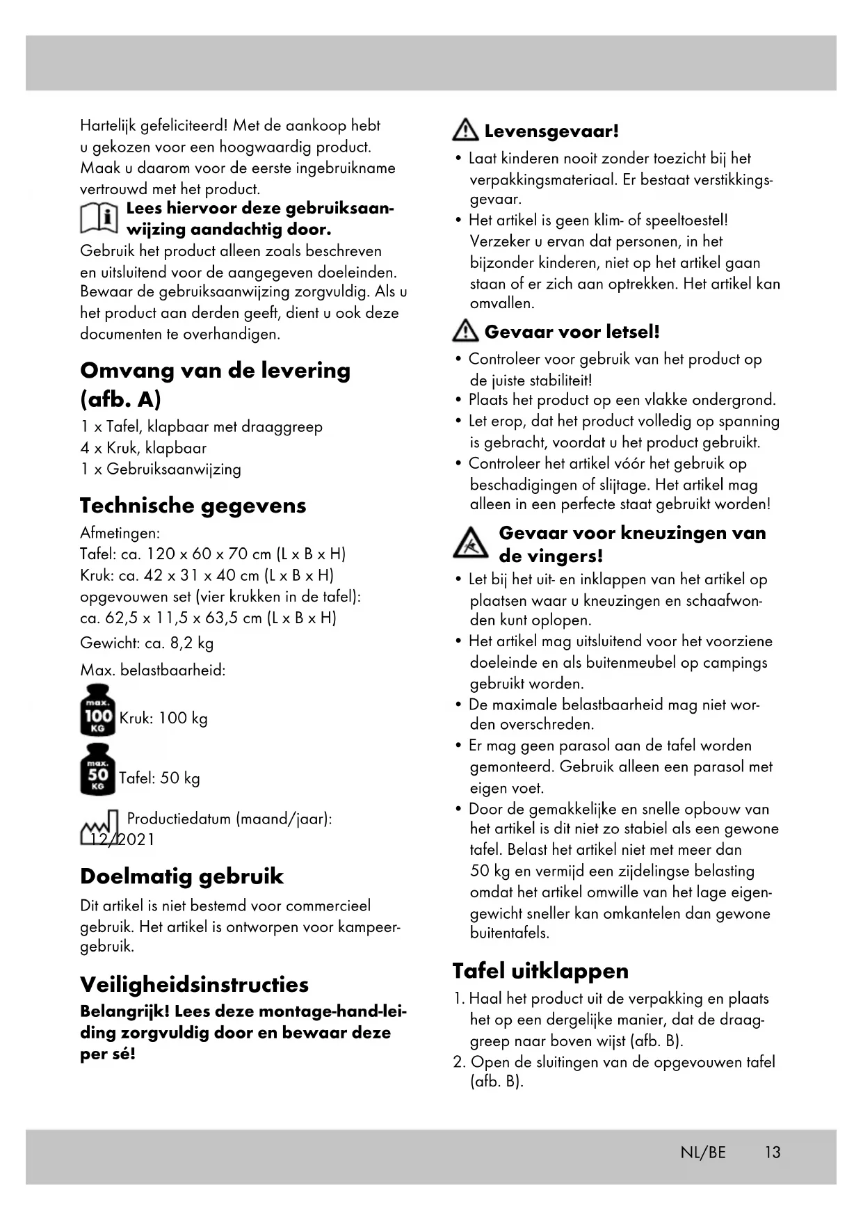 - Het artikel mag uitsluitend voor het voorziene doeleinde en als buitenmeubel op campings gebruikt worden.