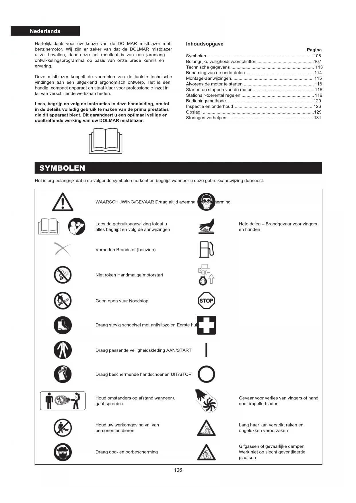 - Hartelijk dank voor uw keuze van de DOLMAR mistblazer met benzinemotor. Wij zijn er zeker van dat de DOLMAR mistblazer u zal bevallen, daar deze het resultaat is van een jarenlang ontwikkelingsprogramma op basis van onze brede kennis en ervaring. Deze mistblazer koppelt de voordelen van de laatste technische vindingen aan een uitgekiend ergonomisch ontwerp. Het is een handig, compact apparaat en staat klaar voor professionele inzet in tal van verschillende werkzaamheden. Lees, begrijp en volg de instructies in deze handleiding, om tot in de details volledig gebruik te maken van de prima prestaties die dit apparaat biedt. Dit garandeert u een optimaal veilige en doeltreffende werking van uw DOLMAR mistblazer. Nederlands SYMBOLEN Het is erg belangrijk dat u de volgende symbolen herkent en begrijpt wanneer u deze gebruiksaanwijzing doorleest. WAARSCHUWING/GEVAAR Draag altijd ademhalingsbescherming Lees de gebruiksaanwijzing totdat u alles begrijpt en volg de aanwijzingen Hete delen – Brandgevaar voor vingers en handen Verboden Brandstof (benzine) Niet roken Handmatige motorstart Geen open vuur Noodstop Draag stevig schoeisel met antislipzolen Eerste hulp Draag passende veiligheidskleding AAN/START Draag beschermende handschoenen UIT/STOP Houd omstanders op afstand wanneer u gaat sproeien Gevaar voor verlies van vingers of hand, door impellerbladen Houd uw werkomgeving vrij van personen en dieren Lang haar kan verstrikt raken en ongelukken veroorzaken Draag oog- en oorbescherming Gifgassen of gevaarlijke dampen Werk niet op slecht geventileerde plaatsen Inhoudsopgave Pagina Symbolen p. 106