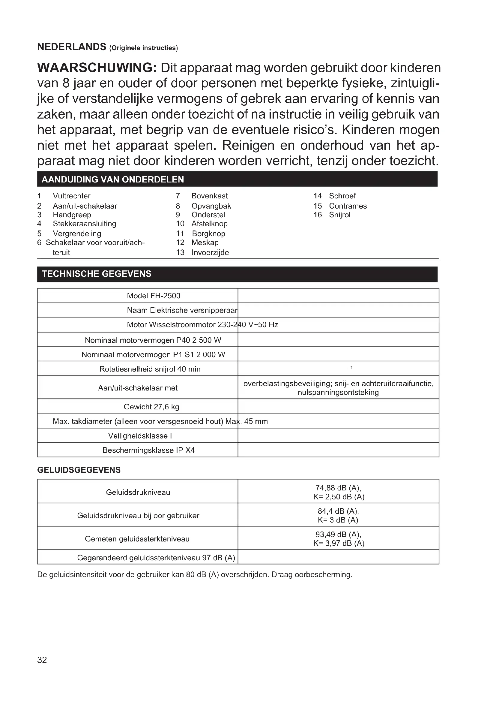 1 Vultrechter 2 Aan/uit-schakelaar 3 Handgreep 4 Stekkeraansluiting 5 Vergrendeling 6 Schakelaar voor vooruit/ach- teruit 7 Bovenkast 8 Opvangbak 9 Onderstel 10 Afstelknop 11 Borgknop 12 Meskap 13 Invoerzijde 14 Schroef 15 Contrames 16 Snijrol TECHNISCHE GEGEVENS Model FH-2500 Naam Elektrische versnipperaar Motor Wisselstroommotor 230-240 V~50 Hz Nominaal motorvermogen P40 2 500 W Nominaal motorvermogen P1 S1 2 000 W Rotatiesnelheid snijrol 40 min