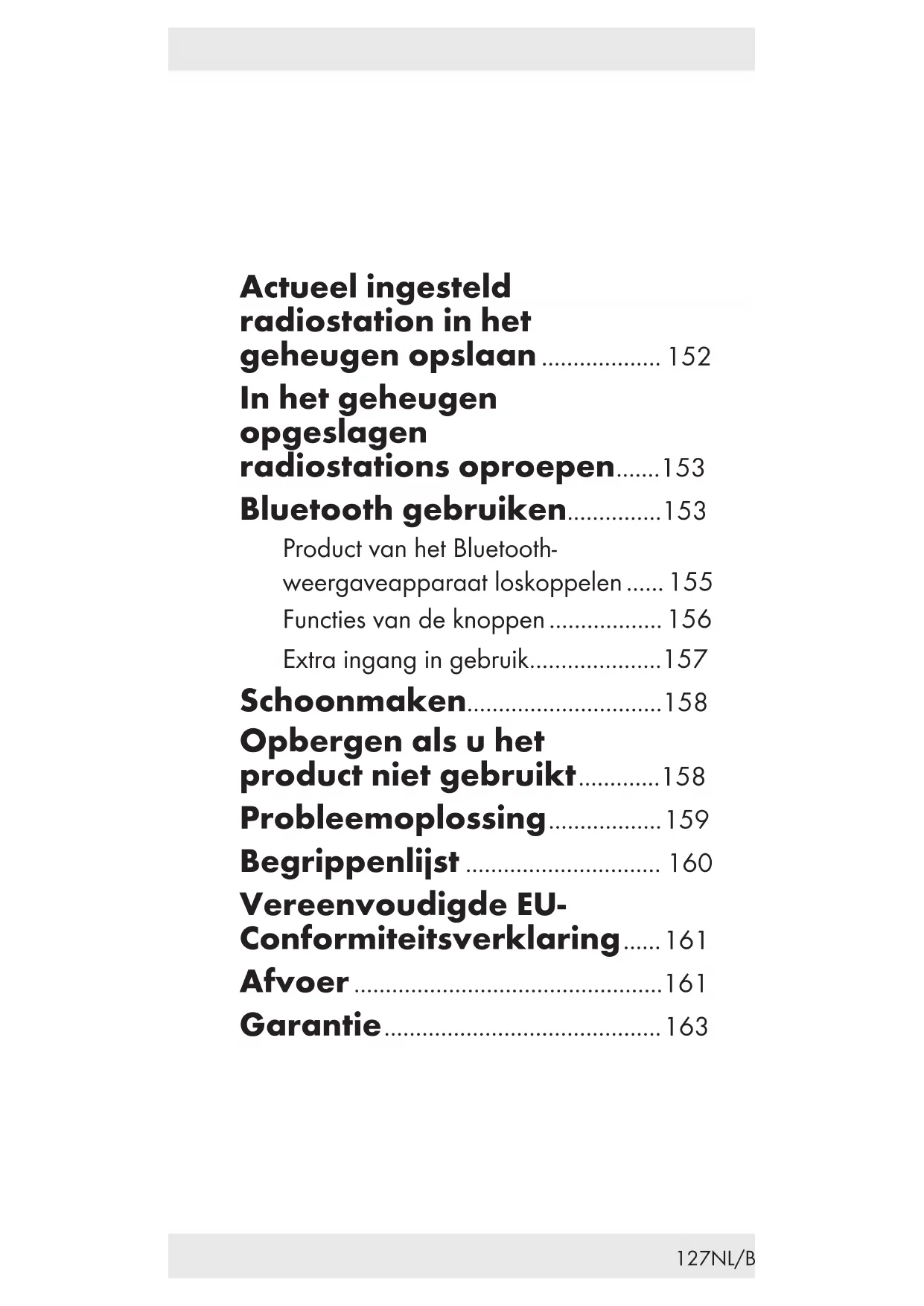 OPGELET! Dompel het product nooit onder in water of andere vloeistoffen. Houd het product nooit onder stromend water. Laat geen water of andere vloeistoffen in het inwendige van het product binnendringen. Gebruik voor het schoonmaken geen schoonmaakmiddelen die oplosmiddelen bevatten, schuurmiddelen, scherpe schoonmaakmiddelen of harde borstels. Maak het product schoon met een enigszins vochtig doekje. Laat het product drogen. Opbergen als u het product niet gebruikt Bewaar het product in zijn originele verpakking. Bewaar het product op een droge, veilige plaats op, buiten het bereik van kinderen. De accu moet regelmatig worden opgeladen.159NL/BE Probleemoplossing = Fout = Mogelijke oorzaak = Oplossing = Werkt niet = Accu leeg = Accu opladen (zie "Accu opladen"). = Geen Bluetooth-verbinding = Productfout = Product uit- en dan weer inschakelen. = Fout weergaveapparaat = Controleer of het product door het weergaveapparaat herkend wordt. = Controleer of het weergave andere apparaten met de Bluetooth-standaard