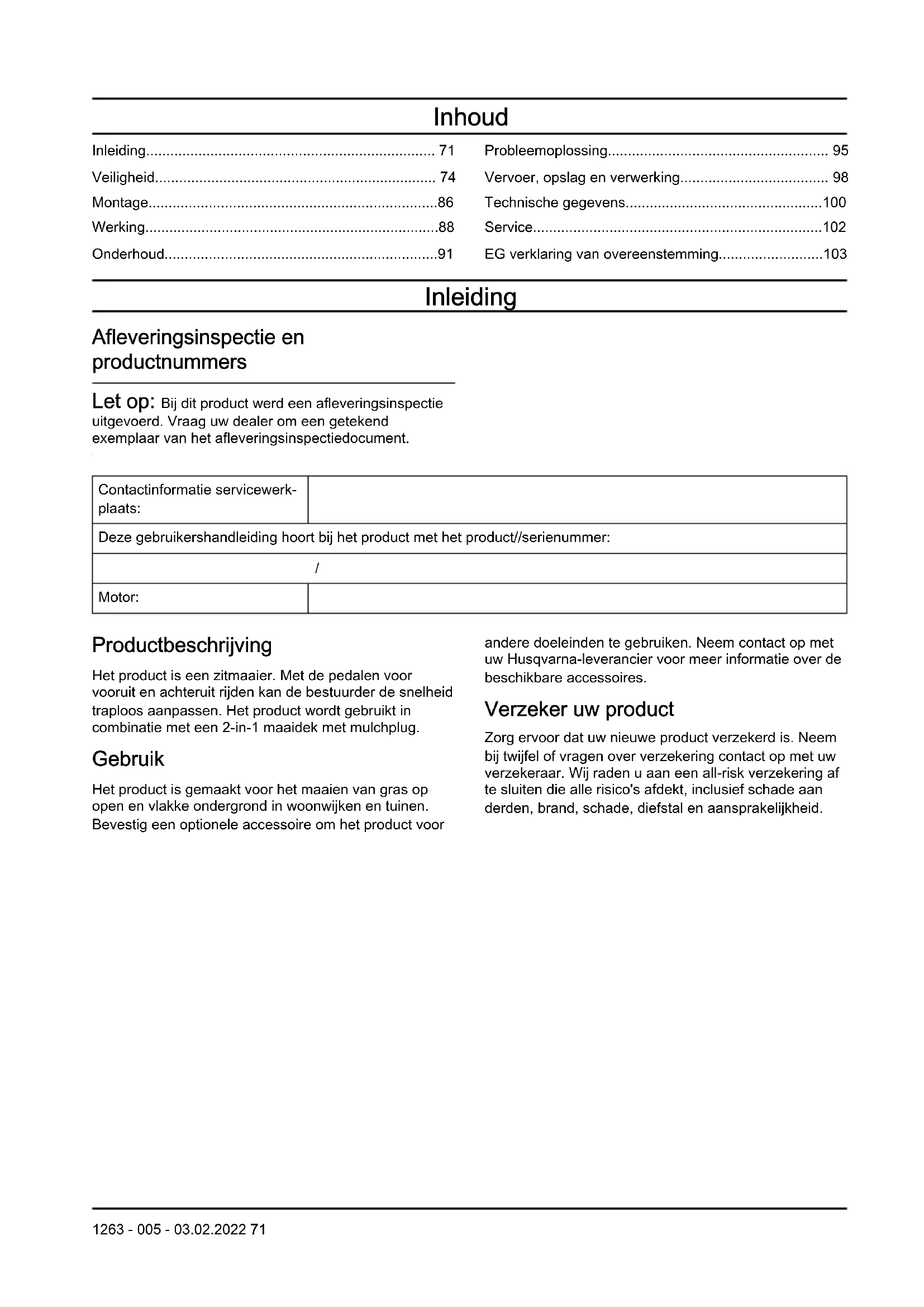 Motor: Productbeschrijving Het product is een zitmaaier. Met de pedalen voor vooruit en achteruit rijden kan de bestuurder de snelheid traploos aanpassen. Het product wordt gebruikt in combinatie met een 2-in-1 maaidek met mulchplug. Gebruik Het product is gemaakt voor het maaien van gras op open en vlakke ondergrond in woonwijken en tuinen. Bevestig een optionele accessoire om het product voor andere doeleinden te gebruiken. Neem contact op met uw Husqvarna-leverancier voor meer informatie over de beschikbare accessoires. Verzeker uw product Zorg ervoor dat uw nieuwe product verzekerd is. Neem bij twijfel of vragen over verzekering contact op met uw verzekeraar. Wij raden u aan een all-risk verzekering af te sluiten die alle risico's afdekt, inclusief schade aan derden, brand, schade, diefstal en aansprakelijkheid. 1263 - 005 - 03.02.2022 71Productoverzicht