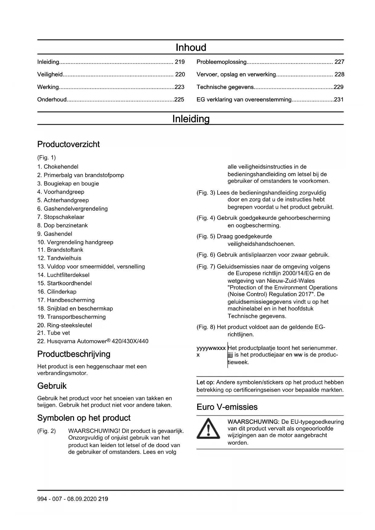 420/430X/440 Productbeschrijving Het product is een heggenschaar met een verbrandingsmotor. Gebruik Gebruik het product voor het snoeien van takken en twijgen. Gebruik het product niet voor andere taken. Symbolen op het product (Fig. 2) WAARSCHUWING! Dit product is gevaarlijk. Onzorgvuldig of onjuist gebruik van het product kan leiden tot letsel of de dood van de gebruiker of omstanders. Lees en volg alle veiligheidsinstructies in de bedieningshandleiding om letsel bij de gebruiker of omstanders te voorkomen. (Fig. 3) Lees de bedieningshandleiding zorgvuldig door en zorg dat u de instructies hebt begrepen voordat u het product gebruikt. (Fig. 4) Gebruik goedgekeurde gehoorbescherming en oogbescherming. (Fig. 5) Draag goedgekeurde veiligheidshandschoenen. (Fig. 6) Gebruik antisliplaarzen voor zwaar gebruik. (Fig. 7) Geluidsemissies naar de omgeving volgens de Europese richtlijn 2000/14/EG en de wetgeving van Nieuw-Zuid-Wales "Protection of the Environment Operations (Noise Control) Regulation 2017". De geluidsemissiegegevens vindt u op het machinelabel en in het hoofdstuk Technische gegevens. (Fig. 8) Het product voldoet aan de geldende EG- richtlijnen. yyyywwxxx