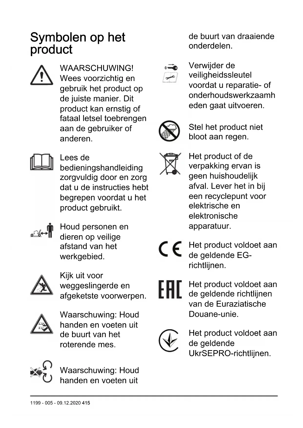 414 1199 - 005 - 09.12.2020Symbolen op het product WAARSCHUWING! Wees voorzichtig en gebruik het product op de juiste manier. Dit product kan ernstig of fataal letsel toebrengen aan de gebruiker of anderen. Lees de bedieningshandleiding zorgvuldig door en zorg dat u de instructies hebt begrepen voordat u het product gebruikt. Houd personen en dieren op veilige afstand van het werkgebied. Kijk uit voor weggeslingerde en afgeketste voorwerpen. Waarschuwing: Houd handen en voeten uit de buurt van het roterende mes. Waarschuwing: Houd handen en voeten uit de buurt van draaiende onderdelen. Verwijder de veiligheidssleutel voordat u reparatie- of onderhoudswerkzaamh eden gaat uitvoeren. Stel het product niet bloot aan regen. Het product of de verpakking ervan is geen huishoudelijk afval. Lever het in bij een recyclepunt voor elektrische en elektronische apparatuur. Het product voldoet aan de geldende EG- richtlijnen. Het product voldoet aan de geldende richtlijnen van de Euraziatische Douane-unie. Het product voldoet aan de geldende UkrSEPRO-richtlijnen. 1199 - 005 - 09.12.2020 415Het product voldoet aan de geldende RCM- richtlijnen. Alleen van toepassing op AU/NZ Geluidsemissies naar de omgeving volgens de Europese richtlijn 2000/14/EG en de wetgeving van Nieuw- Zuid-Wales "Protection of the Environment Operations (Noise Control) Regulation 2017". De geluidsemissiegegeven s vindt u op het machinelabel en in het hoofdstuk Technische gegevens. Het product is druppeldicht. Startprocedure: druk op de AAN/UIT- knop, maak de startvergrendeling los, druk de remhendel van de motor om- laag. Laat de remhendel van de motor los om te stoppen. Langzaam Snel Scanbare code Let op: Andere symbolen/stickers op het product hebben betrekking op certificeringseisen voor bepaalde markten. Label op het product Houd handen en voeten uit de buurt van roterende messen. Productaansprakelijkheid Zoals uiteengezet in de wet voor productaansprakelijkheid zijn wij niet aansprakelijk voor schade die door ons product wordt veroorzaakt, indien: