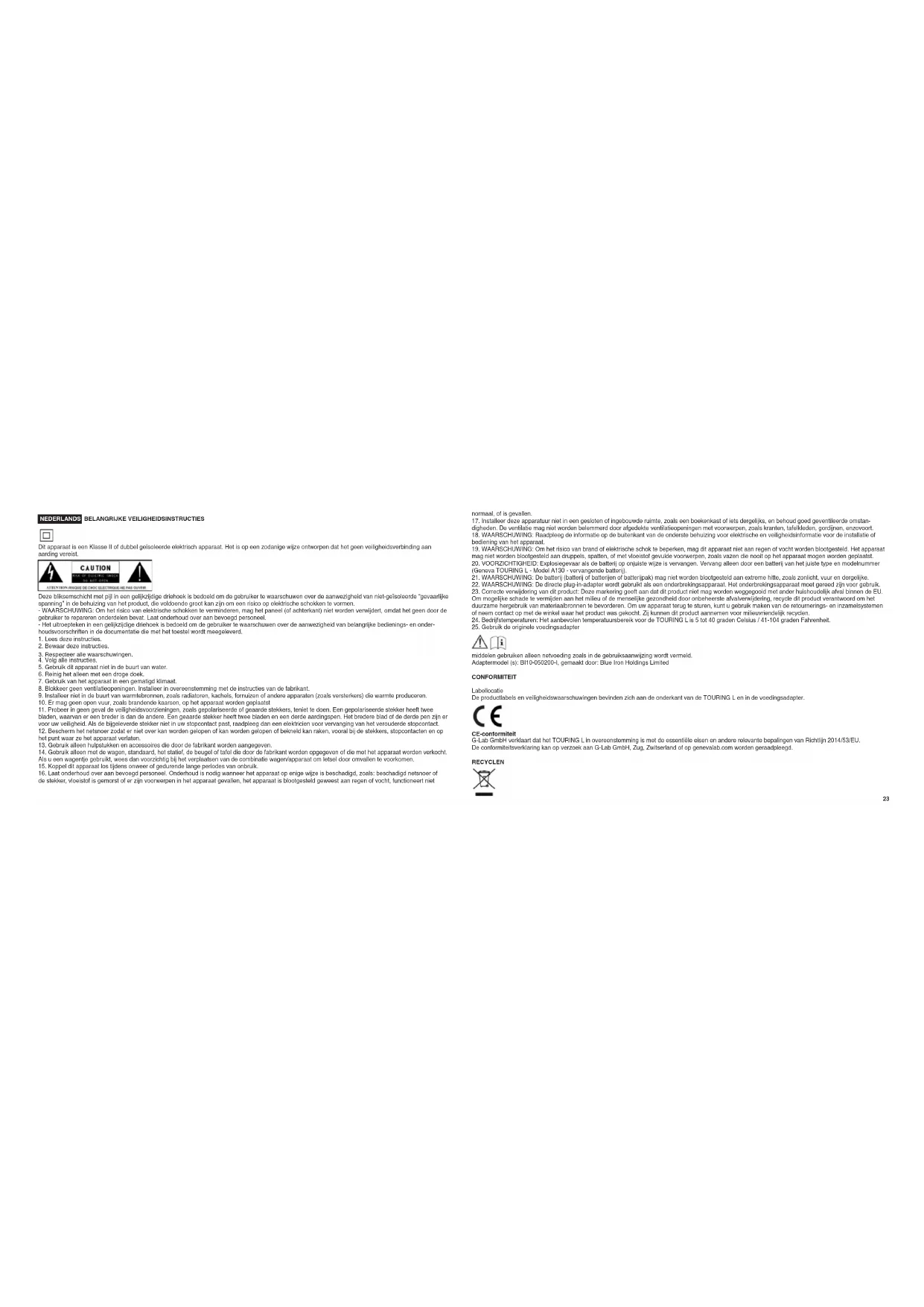 CE-conformiteit G-Lab GmbH verklaart dat het TOURING L in overeenstemming is met de essentiële eisen en andere relevante bepalingen van Richtlijn 2014/53/EU. De conformiteitsverklaring kan op verzoek aan G-Lab GmbH, Zug, Zwitserland of op genevalab.com worden geraadpleegd. RECYCLEN