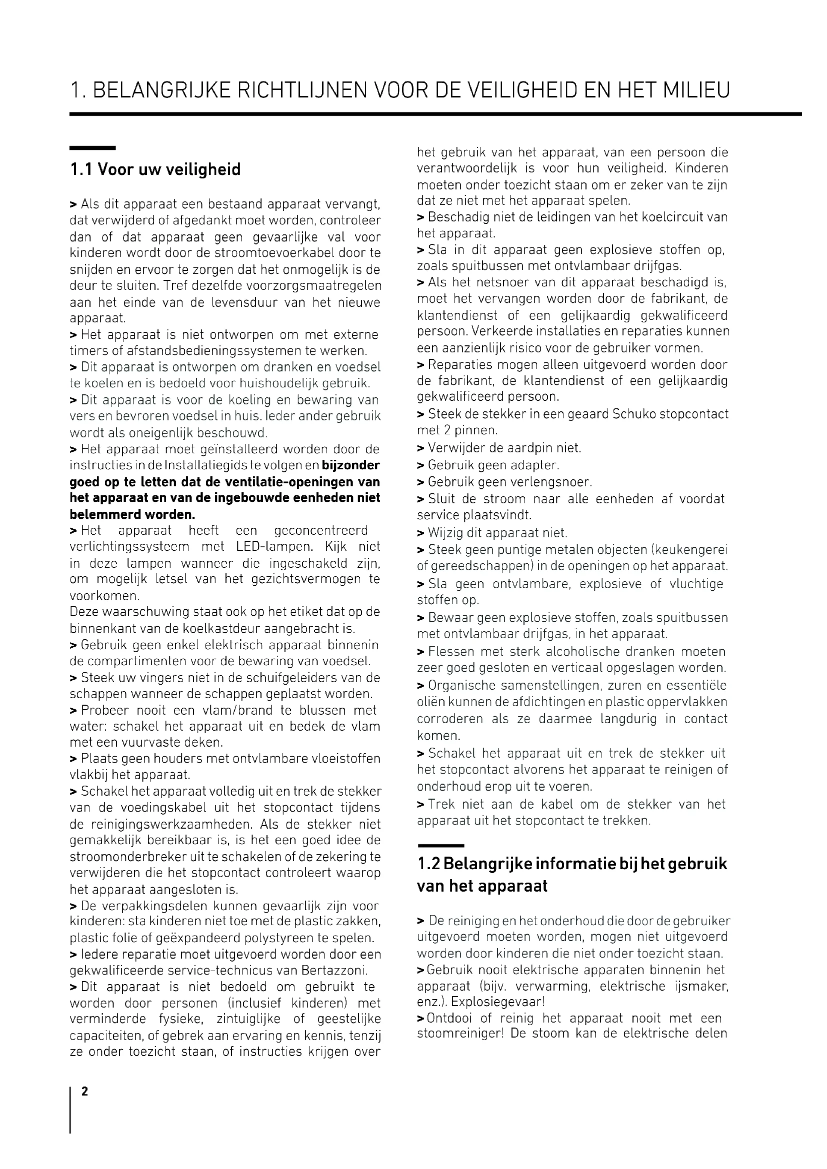 > Als dit apparaat een bestaand apparaat vervangt, dat verwijderd of afgedankt moet worden, controleer dan of dat apparaat geen gevaarlijke val voor kinderen wordt door de stroomtoevoerkabel door te snijden en ervoor te zorgen dat het onmogelijk is de deur te sluiten. Tref dezelfde voorzorgsmaatregelen aan het einde van de levensduur van het nieuwe apparaat. > Het apparaat is niet ontworpen om met externe timers of afstandsbedieningssystemen te werken. > Dit apparaat is ontworpen om dranken en voedsel te koelen en is bedoeld voor huishoudelijk gebruik. > Dit apparaat is voor de koeling en bewaring van vers en bevroren voedsel in huis. Ieder ander gebruik wordt als oneigenlijk beschouwd. > Het apparaat moet geïnstalleerd worden door de instructies in de Installatiegids te volgen en bijzonder goed op te letten dat de ventilatie-openingen van het apparaat en van de ingebouwde eenheden niet belemmerd worden. > Het apparaat heeft een geconcentreerd verlichtingssysteem met LED-lampen. Kijk niet in deze lampen wanneer die ingeschakeld zijn, om mogelijk letsel van het gezichtsvermogen te voorkomen. Deze waarschuwing staat ook op het etiket dat op de binnenkant van de koelkastdeur aangebracht is. > Gebruik geen enkel elektrisch apparaat binnenin de compartimenten voor de bewaring van voedsel. > Steek uw vingers niet in de schuifgeleiders van de schappen wanneer de schappen geplaatst worden. > Probeer nooit een vlam/brand te blussen met water: schakel het apparaat uit en bedek de vlam met een vuurvaste deken. > Plaats geen houders met ontvlambare vloeistoen vlakbij het apparaat. > Schakel het apparaat volledig uit en trek de stekker van de voedingskabel uit het stopcontact tijdens de reinigingswerkzaamheden. Als de stekker niet gemakkelijk bereikbaar is, is het een goed idee de stroomonderbreker uit te schakelen of de zekering te verwijderen die het stopcontact controleert waarop het apparaat aangesloten is. > De verpakkingsdelen kunnen gevaarlijk zijn voor kinderen: sta kinderen niet toe met de plastic zakken, plastic folie of geëxpandeerd polystyreen te spelen. > Iedere reparatie moet uitgevoerd worden door een gekwalificeerde service-technicus van Bertazzoni. > Dit apparaat is niet bedoeld om gebruikt te worden door personen (inclusief kinderen) met verminderde fysieke, zintuiglijke of geestelijke capaciteiten, of gebrek aan ervaring en kennis, tenzij ze onder toezicht staan, of instructies krijgen over het gebruik van het apparaat, van een persoon die verantwoordelijk is voor hun veiligheid. Kinderen moeten onder toezicht staan om er zeker van te zijn dat ze niet met het apparaat spelen. > Beschadig niet de leidingen van het koelcircuit van het apparaat. > Sla in dit apparaat geen explosieve stoen op, zoals spuitbussen met ontvlambaar drijfgas. > Als het netsnoer van dit apparaat beschadigd is, moet het vervangen worden door de fabrikant, de klantendienst of een gelijkaardig gekwalificeerd persoon. Verkeerde installaties en reparaties kunnen een aanzienlijk risico voor de gebruiker vormen. > Reparaties mogen alleen uitgevoerd worden door de fabrikant, de klantendienst of een gelijkaardig gekwalificeerd persoon. > Steek de stekker in een geaard Schuko stopcontact met 2 pinnen. > Verwijder de aardpin niet. > Gebruik geen adapter. > Gebruik geen verlengsnoer. > Sluit de stroom naar alle eenheden af voordat service plaatsvindt. > Wijzig dit apparaat niet. > Steek geen puntige metalen objecten (keukengerei of gereedschappen) in de openingen op het apparaat. > Sla geen ontvlambare, explosieve of vluchtige stoen op. > Bewaar geen explosieve stoen, zoals spuitbussen met ontvlambaar drijfgas, in het apparaat. > Flessen met sterk alcoholische dranken moeten zeer goed gesloten en verticaal opgeslagen worden. > Organische samenstellingen, zuren en essentiële oliën kunnen de afdichtingen en plastic oppervlakken corroderen als ze daarmee langdurig in contact komen. > Schakel het apparaat uit en trek de stekker uit het stopcontact alvorens het apparaat te reinigen of onderhoud erop uit te voeren. > Trek niet aan de kabel om de stekker van het apparaat uit het stopcontact te trekken.