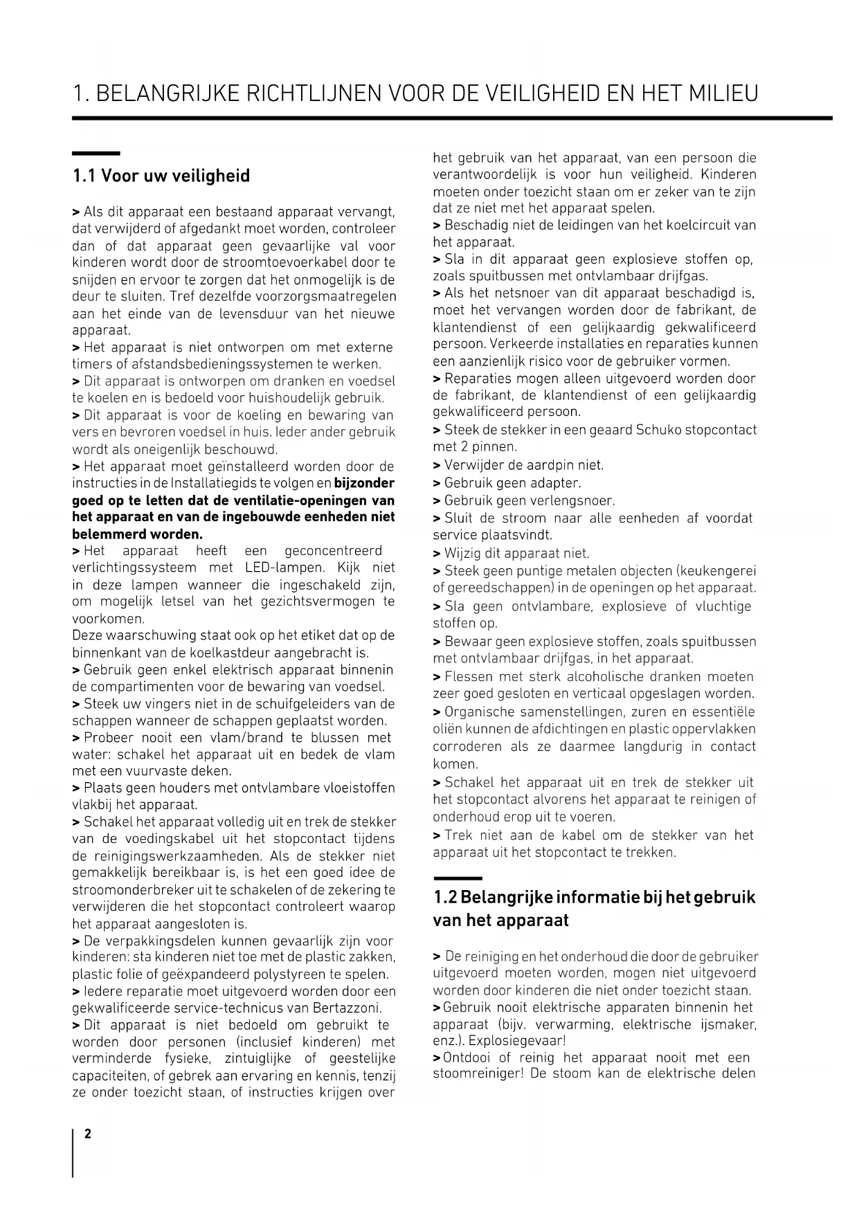 > Als dit apparaat een bestaand apparaat vervangt, dat verwijderd of afgedankt moet worden, controleer dan of dat apparaat geen gevaarlijke val voor kinderen wordt door de stroomtoevoerkabel door te snijden en ervoor te zorgen dat het onmogelijk is de deur te sluiten. Tref dezelfde voorzorgsmaatregelen aan het einde van de levensduur van het nieuwe apparaat. > Het apparaat is niet ontworpen om met externe timers of afstandsbedieningssystemen te werken. > Dit apparaat is ontworpen om dranken en voedsel te koelen en is bedoeld voor huishoudelijk gebruik. > Dit apparaat is voor de koeling en bewaring van vers en bevroren voedsel in huis. Ieder ander gebruik wordt als oneigenlijk beschouwd. > Het apparaat moet geïnstalleerd worden door de instructies in de Installatiegids te volgen en bijzonder goed op te letten dat de ventilatie-openingen van het apparaat en van de ingebouwde eenheden niet belemmerd worden. > Het apparaat heeft een geconcentreerd verlichtingssysteem met LED-lampen. Kijk niet in deze lampen wanneer die ingeschakeld zijn, om mogelijk letsel van het gezichtsvermogen te voorkomen. Deze waarschuwing staat ook op het etiket dat op de binnenkant van de koelkastdeur aangebracht is. > Gebruik geen enkel elektrisch apparaat binnenin de compartimenten voor de bewaring van voedsel. > Steek uw vingers niet in de schuifgeleiders van de schappen wanneer de schappen geplaatst worden. > Probeer nooit een vlam/brand te blussen met water: schakel het apparaat uit en bedek de vlam met een vuurvaste deken. > Plaats geen houders met ontvlambare vloeistoen vlakbij het apparaat. > Schakel het apparaat volledig uit en trek de stekker van de voedingskabel uit het stopcontact tijdens de reinigingswerkzaamheden. Als de stekker niet gemakkelijk bereikbaar is, is het een goed idee de stroomonderbreker uit te schakelen of de zekering te verwijderen die het stopcontact controleert waarop het apparaat aangesloten is. > De verpakkingsdelen kunnen gevaarlijk zijn voor kinderen: sta kinderen niet toe met de plastic zakken, plastic folie of geëxpandeerd polystyreen te spelen. > Iedere reparatie moet uitgevoerd worden door een gekwalificeerde service-technicus van Bertazzoni. > Dit apparaat is niet bedoeld om gebruikt te worden door personen (inclusief kinderen) met verminderde fysieke, zintuiglijke of geestelijke capaciteiten, of gebrek aan ervaring en kennis, tenzij ze onder toezicht staan, of instructies krijgen over het gebruik van het apparaat, van een persoon die verantwoordelijk is voor hun veiligheid. Kinderen moeten onder toezicht staan om er zeker van te zijn dat ze niet met het apparaat spelen. > Beschadig niet de leidingen van het koelcircuit van het apparaat. > Sla in dit apparaat geen explosieve stoen op, zoals spuitbussen met ontvlambaar drijfgas. > Als het netsnoer van dit apparaat beschadigd is, moet het vervangen worden door de fabrikant, de klantendienst of een gelijkaardig gekwalificeerd persoon. Verkeerde installaties en reparaties kunnen een aanzienlijk risico voor de gebruiker vormen. > Reparaties mogen alleen uitgevoerd worden door de fabrikant, de klantendienst of een gelijkaardig gekwalificeerd persoon. > Steek de stekker in een geaard Schuko stopcontact met 2 pinnen. > Verwijder de aardpin niet. > Gebruik geen adapter. > Gebruik geen verlengsnoer. > Sluit de stroom naar alle eenheden af voordat service plaatsvindt. > Wijzig dit apparaat niet. > Steek geen puntige metalen objecten (keukengerei of gereedschappen) in de openingen op het apparaat. > Sla geen ontvlambare, explosieve of vluchtige stoen op. > Bewaar geen explosieve stoen, zoals spuitbussen met ontvlambaar drijfgas, in het apparaat. > Flessen met sterk alcoholische dranken moeten zeer goed gesloten en verticaal opgeslagen worden. > Organische samenstellingen, zuren en essentiële oliën kunnen de afdichtingen en plastic oppervlakken corroderen als ze daarmee langdurig in contact komen. > Schakel het apparaat uit en trek de stekker uit het stopcontact alvorens het apparaat te reinigen of onderhoud erop uit te voeren. > Trek niet aan de kabel om de stekker van het apparaat uit het stopcontact te trekken.