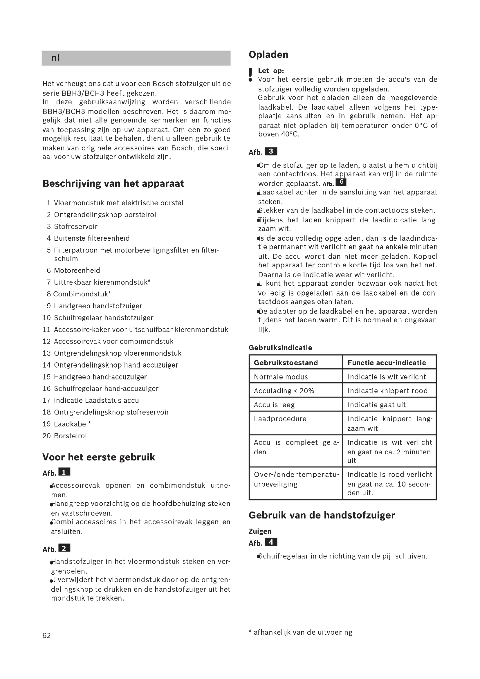 Het verheugt ons dat u voor een Bosch stofzuiger uit de serie BBH3/BCH3 heeft gekozen. In deze gebruiksaanwijzing worden verschillende BBH3/BCH3 modellen beschreven. Het is daarom mo- gelijk dat niet alle genoemde kenmerken en functies van toepassing zijn op uw apparaat. Om een zo goed mogelijk resultaat te behalen, dient u alleen gebruik te maken van originele accessoires van Bosch, die speci- aal voor uw stofzuiger ontwikkeld zijn. Beschrijving van het apparaat 1 Vloermondstuk met elektrische borstel 2 Ontgrendelingsknop borstelrol 3 Stofreservoir 4 Buitenste filtereenheid 5 Filterpatroon met motorbeveiligingsfilter en filter- schuim 6 Motoreenheid 7 Uittrekbaar kierenmondstuk* 8 Combimondstuk* 9 Handgreep handstofzuiger 10 Schuifregelaar handstofzuiger 11 Accessoire-koker voor uitschuifbaar kie renmondstuk 12 Accessoirevak voor combimondstuk 13 Ontgrendelingsknop vloerenmondstuk 14 Ontgrendelingsknop hand-accuzuiger 15 Handgreep hand-accuzuiger 16 Schuifregelaar hand-accuzuiger 17 Indicatie Laadstatus accu 18 Ontrgrendelingsknop stofreservoir 19 Laadkabel* 20 Borstelrol Voor het eerste gebruik Afb.