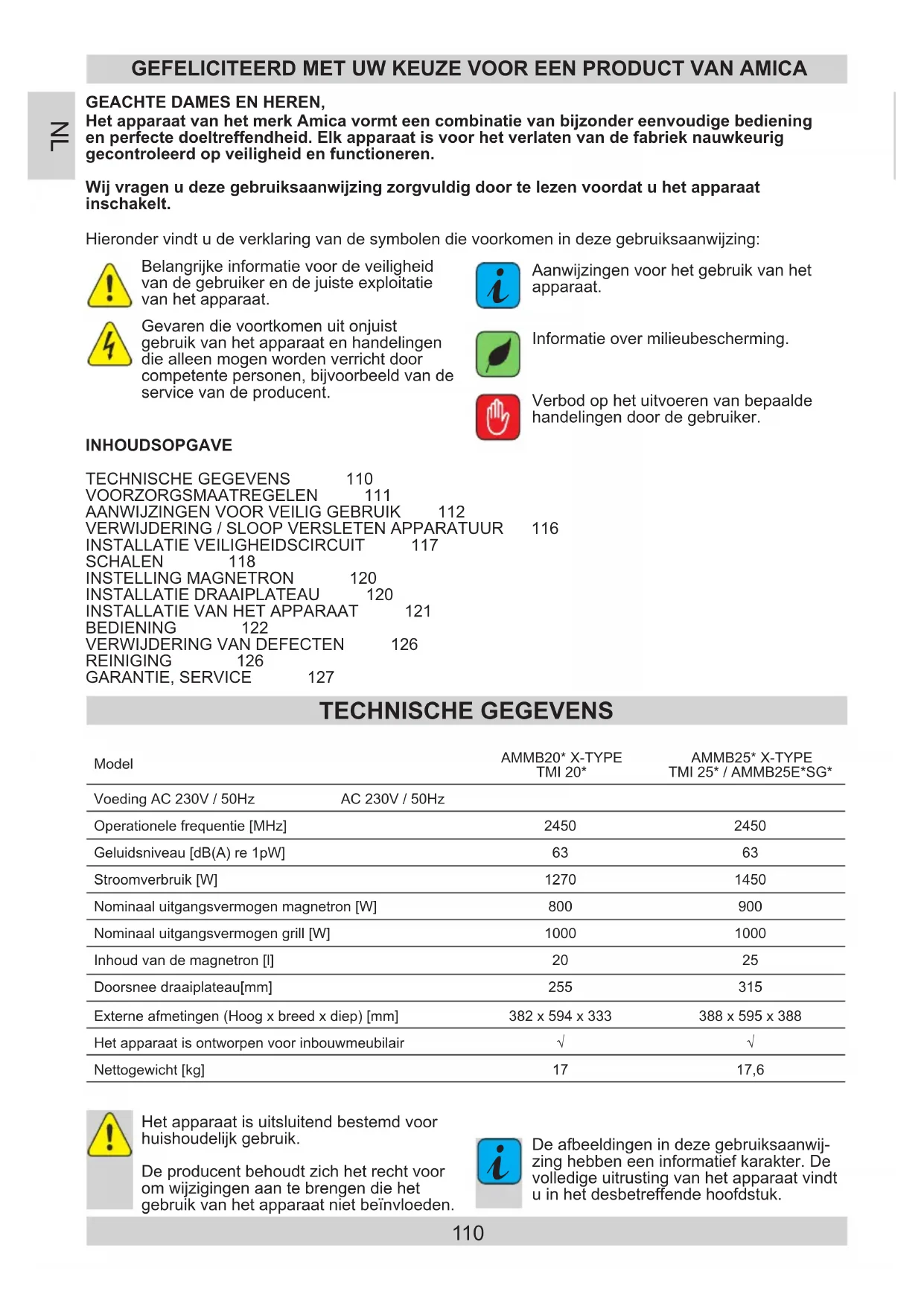 - directive RoHS 2011/65/CE et c’est le pourquoi le produit est désigné par le symbol ainsi qu’une déclaration de la conformité accessible aux organes chargés de la surveillance du marché a été délivrée.110 HetapparaatvanhetmerkAmicavormteencombinatievanbijzondereenvoudigebediening enperfectedoeltreffendheid.Elkapparaatisvoorhetverlatenvandefabrieknauwkeurig gecontroleerdopveiligheidenfunctioneren. Wijvragenudezegebruiksaanwijzingzorgvuldigdoortelezenvoordatuhetapparaat inschakelt. GEACHTEDAMESENHEREN, GEFELICITEERD MET UW KEUZE VOOR EEN PRODUCT VAN AMICA Hieronder vindt u de verklaring van de symbolen die voorkomen in deze gebruiksaanwijzing: Verbod op het uitvoeren van bepaalde handelingen door de gebruiker. Gevaren die voortkomen uit onjuist gebruik van het apparaat en handelingen die alleen mogen worden verricht door competente personen, bijvoorbeeld van de service van de producent. Het apparaat is uitsluitend bestemd voor huishoudelijk gebruik. De producent behoudt zich het recht voor om wijzigingen aan te brengen die het gebruik van het apparaat niet beïnvloeden. Belangrijke informatie voor de veiligheid van de gebruiker en de juiste exploitatie van het apparaat. Aanwijzingen voor het gebruik van het apparaat.