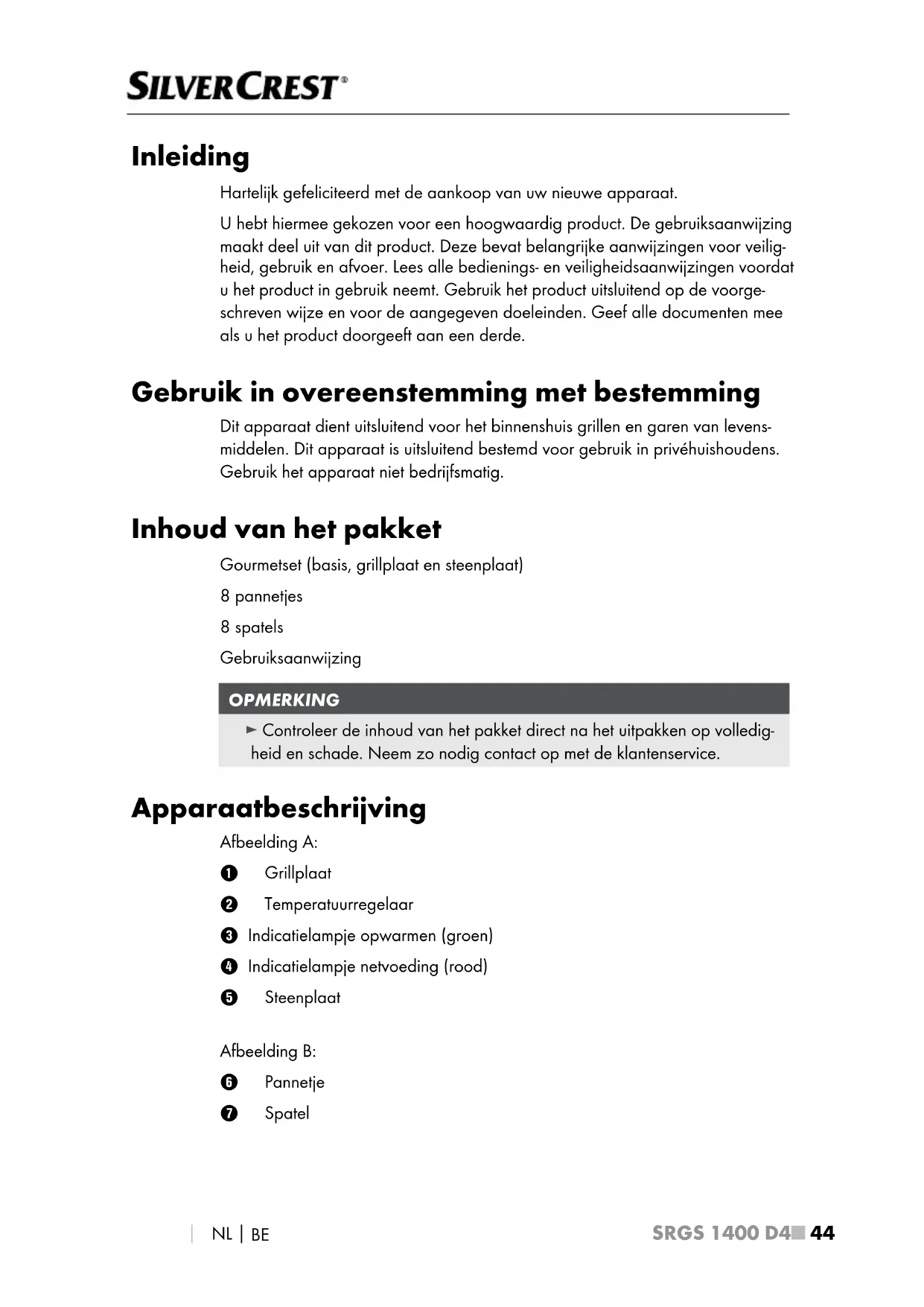 Inleiding Hartelijk gefeliciteerd met de aankoop van uw nieuwe apparaat. U hebt hiermee gekozen voor een hoogwaardig product. De gebruiksaanwijzing maakt deel uit van dit product. Deze bevat belangrijke aanwijzingen voor veilig- heid, gebruik en afvoer. Lees alle bedienings- en veiligheidsaanwijzingen voordat u het product in gebruik neemt. Gebruik het product uitsluitend op de voorge- schreven wijze en voor de aangegeven doeleinden. Geef alle documenten mee als u het product doorgeeft aan een derde. Gebruik in overeenstemming met bestemming Dit apparaat dient uitsluitend voor het binnenshuis grillen en garen van levens- middelen. Dit apparaat is uitsluitend bestemd voor gebruik in privéhuishoudens. Gebruik het apparaat niet bedrijfsmatig. Inhoud van het pakket Gourmetset (basis, grillplaat en steenplaat) 8 pannetjes 8 spatels Gebruiksaanwijzing OPMERKING ► Controleer de inhoud van het pakket direct na het uitpakken op volledig- heid en schade. Neem zo nodig contact op met de klantenservice. Apparaatbeschrijving Afbeelding A: 1 Grillplaat 2 Temperatuurregelaar 3 Indicatielampje opwarmen (groen) 4 Indicatielampje netvoeding (rood) 5 Steenplaat Afbeelding B: 6 Pannetje 7 SpatelSRGS 1400 D4 NL