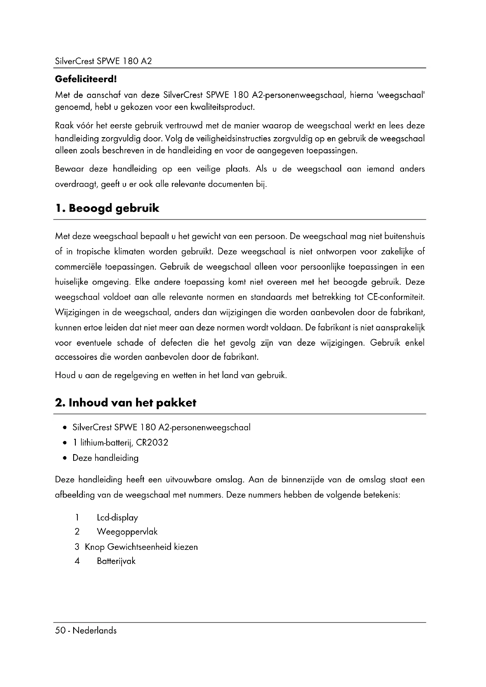 - Deze handleiding Deze handleiding heeft een uitvouwbare omslag. Aan de binnenzijde van de omslag staat een afbeelding van de weegschaal met nummers. Deze nummers hebben de volgende betekenis: 1 Lcd-display 2 Weegoppervlak 3 Knop Gewichtseenheid kiezen 4 BatterijvakSilverCrest SPWE 180 A2 Nederlands - 51