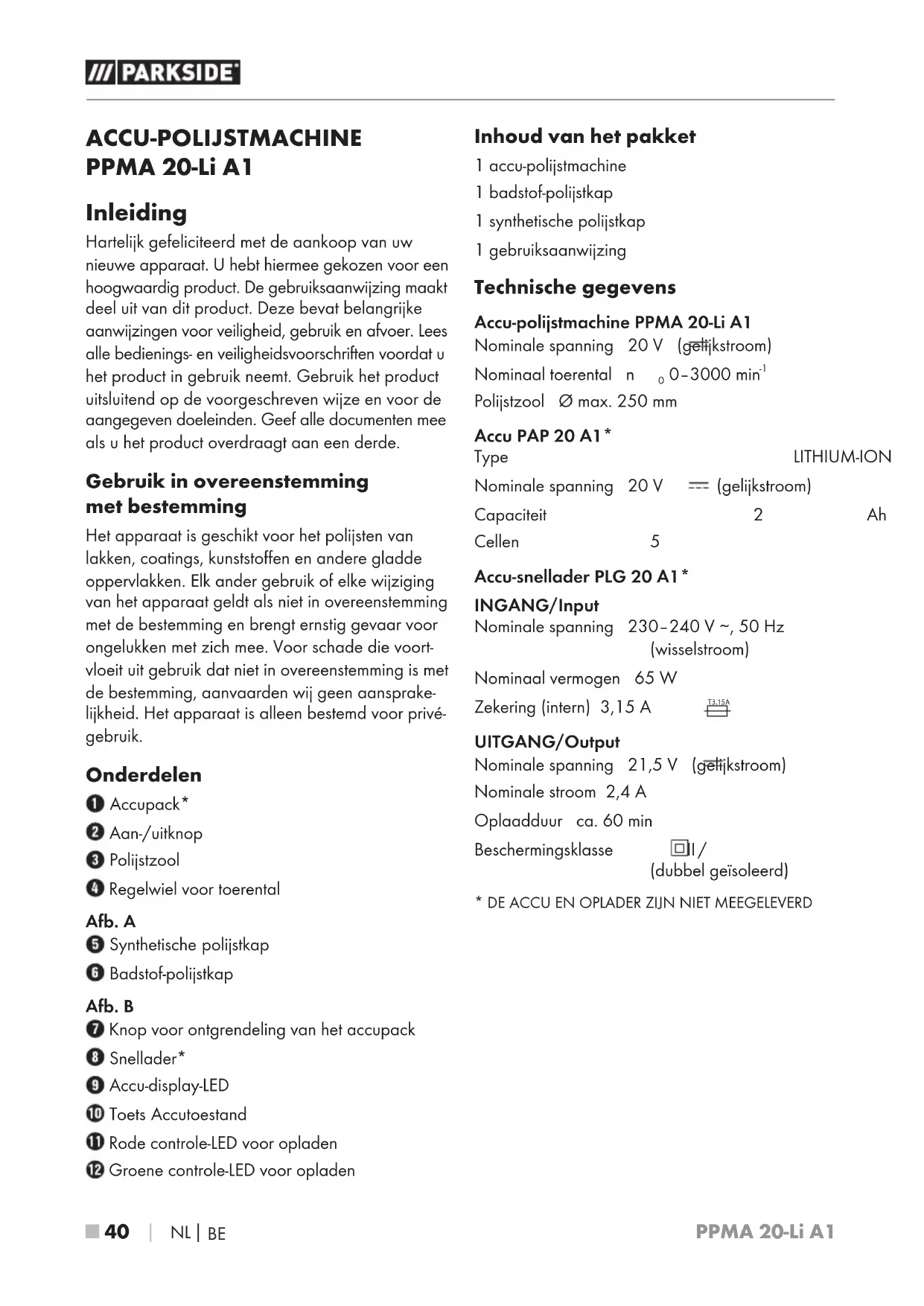GEBRUIKSAANWIJZING PPMA 20Li A1 PARKSIDE