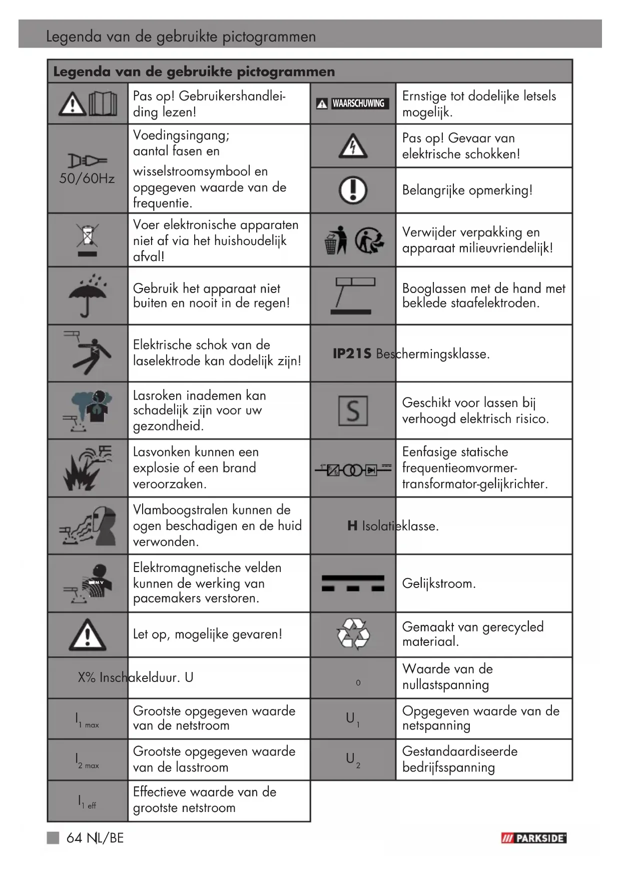 WAARSCHUWING Vermijd elk direct contact met het elektri- sche lascircuit. De nullastspan- ning tussen elektrodentang en massaklem kan gevaarlijk zijn, er bestaat het gevaar van een elektrische schok. Berg het apparaat niet op of gebruik het niet in een vochtige of natte omgeving of in de regen. Hier geldt de beschermingsklasse IP21S. Bescherm de ogen met de daarvoor bedoelde bescher- mende glazen (DIN graad 9–10), die u op het meege- leverde lasscherm bevestigt. Draag handschoenen en droge beschermende kleding, die vrij is van olie en vet, om de huid te beschermen tegen de ultraviolette straling van de vlamboog.