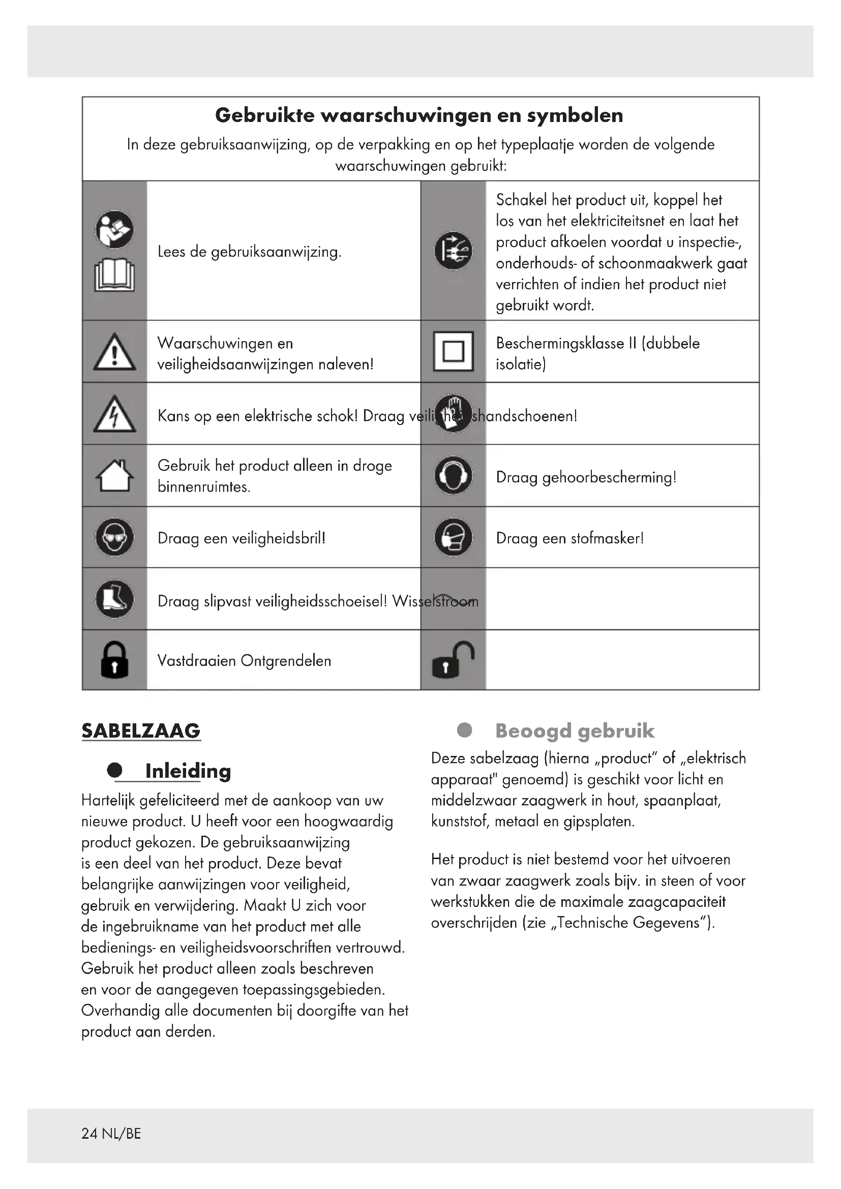 Draag slipvast veiligheidsschoeisel! Wisselstroom Vastdraaien Ontgrendelen SABELZAAG Inleiding Hartelijk gefeliciteerd met de aankoop van uw nieuwe product. U heeft voor een hoogwaardig product gekozen. De gebruiksaanwijzing is een deel van het product. Deze bevat belangrijke aanwijzingen voor veiligheid, gebruik en verwijdering. Maakt U zich voor de ingebruikname van het product met alle bedienings- en veiligheidsvoorschriften vertrouwd. Gebruik het product alleen zoals beschreven en voor de aangegeven toepassingsgebieden. Overhandig alle documenten bij doorgifte van het product aan derden. Beoogd gebruik Deze sabelzaag (hierna „product“ of „elektrisch apparaat" genoemd) is geschikt voor licht en middelzwaar zaagwerk in hout, spaanplaat, kunststof, metaal en gipsplaten. Het product is niet bestemd voor het uitvoeren van zwaar zaagwerk zoals bijv. in steen of voor werkstukken die de maximale zaagcapaciteit overschrijden (zie „Technische Gegevens“).25 NL/BE Gebruik zaagbladen altijd zoals voorgeschreven! Houd bij de koop en het gebruik van zaagbladen de hand aan de technische vereisten van het product (zie „Technische gegevens”). De LED-werklamp