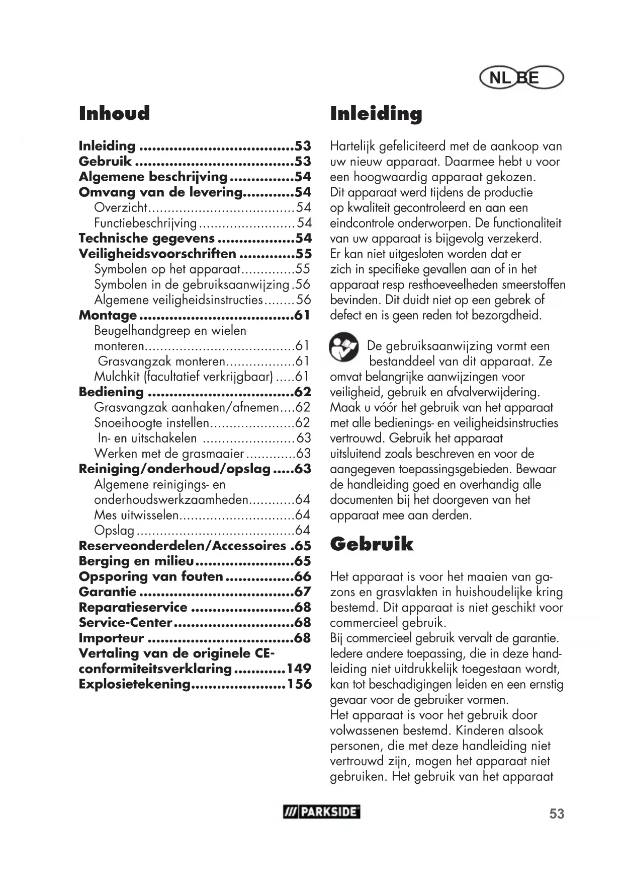 - Inleiding Hartelijk gefeliciteerd met de aankoop van uw nieuw apparaat. Daarmee hebt u voor een hoogwaardig apparaat gekozen. Dit apparaat werd tijdens de productie op kwaliteit gecontroleerd en aan een eindcontrole onderworpen. De functionaliteit van uw apparaat is bijgevolg verzekerd. Er kan niet uitgesloten worden dat er zich in specieke gevallen aan of in het apparaat resp resthoeveelheden smeerstoffen bevinden. Dit duidt niet op een gebrek of defect en is geen reden tot bezorgdheid. De gebruiksaanwijzing vormt een bestanddeel van dit apparaat. Ze omvat belangrijke aanwijzingen voor veiligheid, gebruik en afvalverwijdering. Maak u vóór het gebruik van het apparaat met alle bedienings- en veiligheidsinstructies vertrouwd. Gebruik het apparaat uitsluitend zoals beschreven en voor de aangegeven toepassingsgebieden. Bewaar de handleiding goed en overhandig alle documenten bij het doorgeven van het apparaat mee aan derden. Gebruik Het apparaat is voor het maaien van ga- zons en grasvlakten in huishoudelke kring bestemd. Dit apparaat is niet geschikt voor commercieel gebruik. B commercieel gebruik vervalt de garantie. Iedere andere toepassing, die in deze hand- leiding niet uitdrukkelk toegestaan wordt, kan tot beschadigingen leiden en een ernstig gevaar voor de gebruiker vormen. Het apparaat is voor het gebruik door volwassenen bestemd. Kinderen alsook personen, die met deze handleiding niet vertrouwd zn, mogen het apparaat niet gebruiken. Het gebruik van het apparaat Vertaling van de originele CE- conformiteitsverklaring p. 149