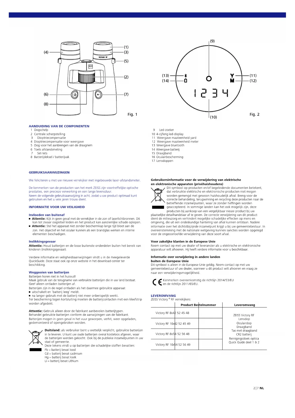 1 Oogschelp 2 Centrale scherpstelling 3 Dioptriecompensatie 4 Dioptriecompensatie voor weergave 5 Oog voor het aanbrengen van de draagriem 6 Toets afstandsmeting 7 Set-tets 8 Batterijdeksel / batterijvak Gebruikersinformatie voor de verwijdering van elektrische en elektronische apparaten (privéhuishoudens) Dit symbool op producten en/of begeleidende documenten betekent, dat verbruikte elektrische en elektronische producten niet mogen worden gemengd met gewoon huishoudelijk afval. Breng voor de correcte behandeling, terugwinning en recycling deze producten naar de betreffende inzamelpunten, waar ze zonder heffingen worden geaccepteerd. In sommige landen kan het ook mogelijk zijn, deze producten bij aankoop van een vergelijkbaar nieuw product bij uw plaatselijke detailhandelaar af te geven. De correcte verwijdering van dit product dient de milieuzorg en verhindert mogelijke schadelijke effecten op mens en omgeving, die uit een ondeskundige hantering van afval kunnen ontstaan. Nadere informatie over het dichtstbijzijnde inzamelpunt krijgt u bij uw gemeentebestuur. In overeenstemming met de nationale wetgeving kunnen sancties worden opgelegd voor de ongeoorloofde verwijdering van deze soort afval. Voor zakelijke klanten in de Europese Unie Neem contact op met uw dealer of leverancier als u elektrische en elektronische apparatuur wilt afvoeren. Hij heeft verdere informatie voor u beschikbaar. Informatie over verwijdering in andere landen buiten de Europese Unie Dit symbool is alleen in de Europese Unie geldig. Neem contact op met uw gemeentebestuur of uw dealer, wanneer u dit product wilt afvoeren en vraag ze naar een verwijderingsmogelijkheid. Kenmerken overeenkomstig de richtlijn 2014/53/EU en de richtlijn 2011/65/EU. LEVEROMVANG ZEISS Victory
