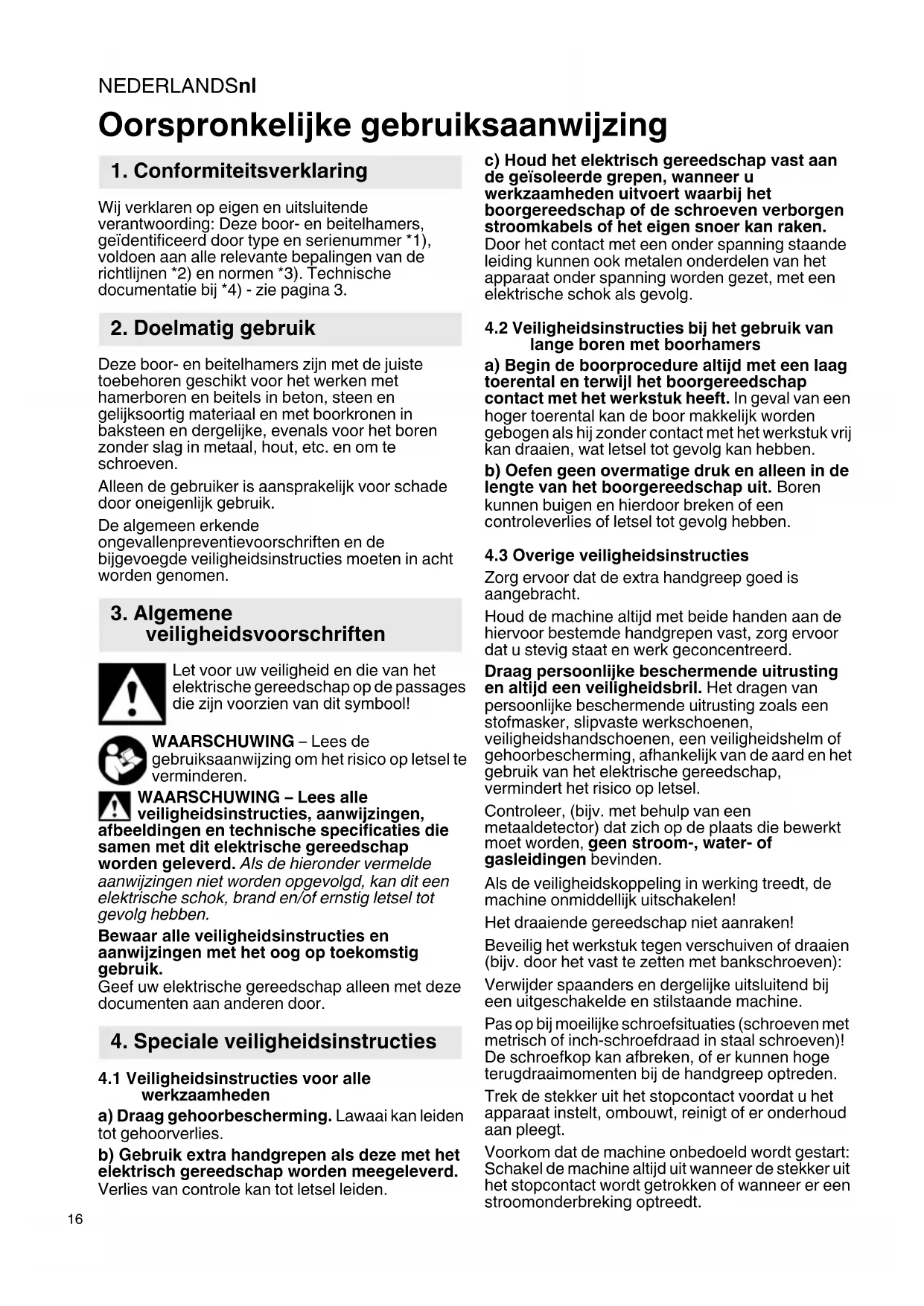 Wij verklaren op eigen en uitsluitende verantwoording: Deze boor- en beitelhamers, geïdentificeerd door type en serienummer *1), voldoen aan alle relevante bepalingen van de richtlijnen *2) en normen *3). Technische documentatie bij *4) - zie pagina 3. Deze boor- en beitelhamers zijn met de juiste toebehoren geschikt voor het werken met hamerboren en beitels in beton, steen en gelijksoortig materiaal en met boorkronen in baksteen en dergelijke, evenals voor het boren zonder slag in metaal, hout, etc. en om te schroeven. Alleen de gebruiker is aansprakelijk voor schade door oneigenlijk gebruik. De algemeen erkende ongevallenpreventievoorschriften en de bijgevoegde veiligheidsinstructies moeten in acht worden genomen. Let voor uw veiligheid en die van het elektrische gereedschap op de passages die zijn voorzien van dit symbool! WAARSCHUWING – Lees de gebruiksaanwijzing om het risico op letsel te verminderen. WAARSCHUWING – Lees alle veiligheidsinstructies, aanwijzingen, afbeeldingen en technische specificaties die samen met dit elektrische gereedschap worden geleverd. Als de hieronder vermelde aanwijzingen niet worden opgevolgd, kan dit een elektrische schok, brand en/of ernstig letsel tot gevolg hebben. Bewaar alle veiligheidsinstructies en aanwijzingen met het oog op toekomstig gebruik. Geef uw elektrische gereedschap alleen met deze documenten aan anderen door.