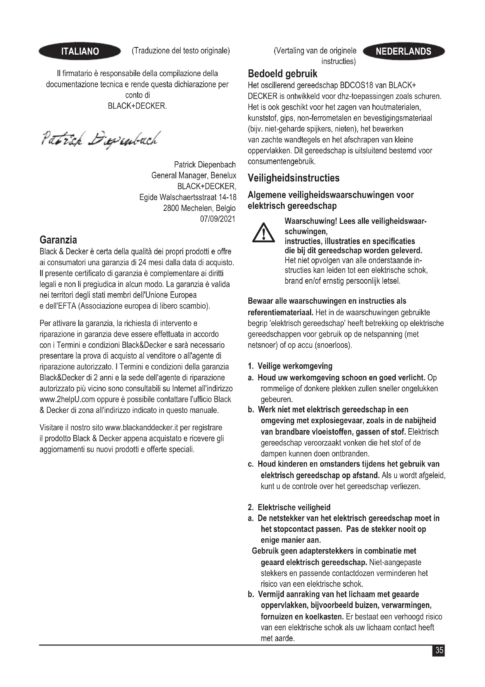 Draadloos oscillerend gereedschap - BDCOS18 BLACK+DECKER verklaart dat de producten die worden beschreven onder "technische gegevens", voldoen aan: 2006/42/EC, EN 62841-1:2015, EN 62841-2-4:2014 Deze producten voldoen ook aan richtlijn 2014/30/EU en 2011/65/EU. Neem voor meer informatie contact op met BLACK+DECKER op het volgende adres, of kijk op de achterkant van deze handleiding.43 (Vertaling van de originele instructies) NEDERLANDS (Traducción de las instrucciones originales) ESPAÑOL Ondergetekende is verantwoordelijk voor de samenstelling van het technische bestand en legt deze verklaring af namens BLACK+DECKER. Patrick Diepenbach General Manager, Benelux BLACK+DECKER, Egide Walschaertsstraat 14 - 18 2800 Mechelen, België 07/09/2021 Garantie Black & Decker heeft vertrouwen in zijn producten en biedt consumenten een garantie van 24 maanden vanaf de aankoopdatum. Deze garantie vormt een aanvulling op uw wettelijke rechten en beperken deze niet. De garantie is geldig op het grondgebied van de Lidstaten van de Europese Unie en de Europese Vrijhandelszone. Voor een garantie-aanspraak moet uw aanspraak in overeenstemming zijn met de Voorwaarden en Condities van Black & Decker en moet u een bewijs van aankoop overleggen aan de verkoper of aan een geautoriseerde reparatiemonteur. Voorwaarden en condities van de 2-jarige garantie van Black & Decker en het adres van de vestiging van het geautoriseerde reparatiecentrum bij u in de buurt, kunt u vinden op internet op www.2helpU.com, of door contact op te nemen met het Black & Decker-kantoor ter plaatse, op het adres dat in deze handleiding wordt vermeld. Bezoek onze website www.blackanddecker.nl, waar u uw nieuwe Black & Decker-product kunt registreren en informatie kunt verkrijgen over nieuwe producten en speciale aanbiedingen. Uso previsto La herramienta oscilante BDCOS18 de BLACK+DECKER ha sido diseñada para aplicaciones de bricolaje, como las operaciones de lijado. También es apropiada para cortar materiales de madera, plástico, yeso, metales no ferrosos y elementos de jación (p. ej. clavos no endurecidos, grapas); para trabajar con azulejos blandos, y para raspar pequeñas supercies. Esta herramienta ha sido concebida únicamente para uso doméstico. Instrucciones de seguridad Advertencias de seguridad para herramientas eléctricas en general