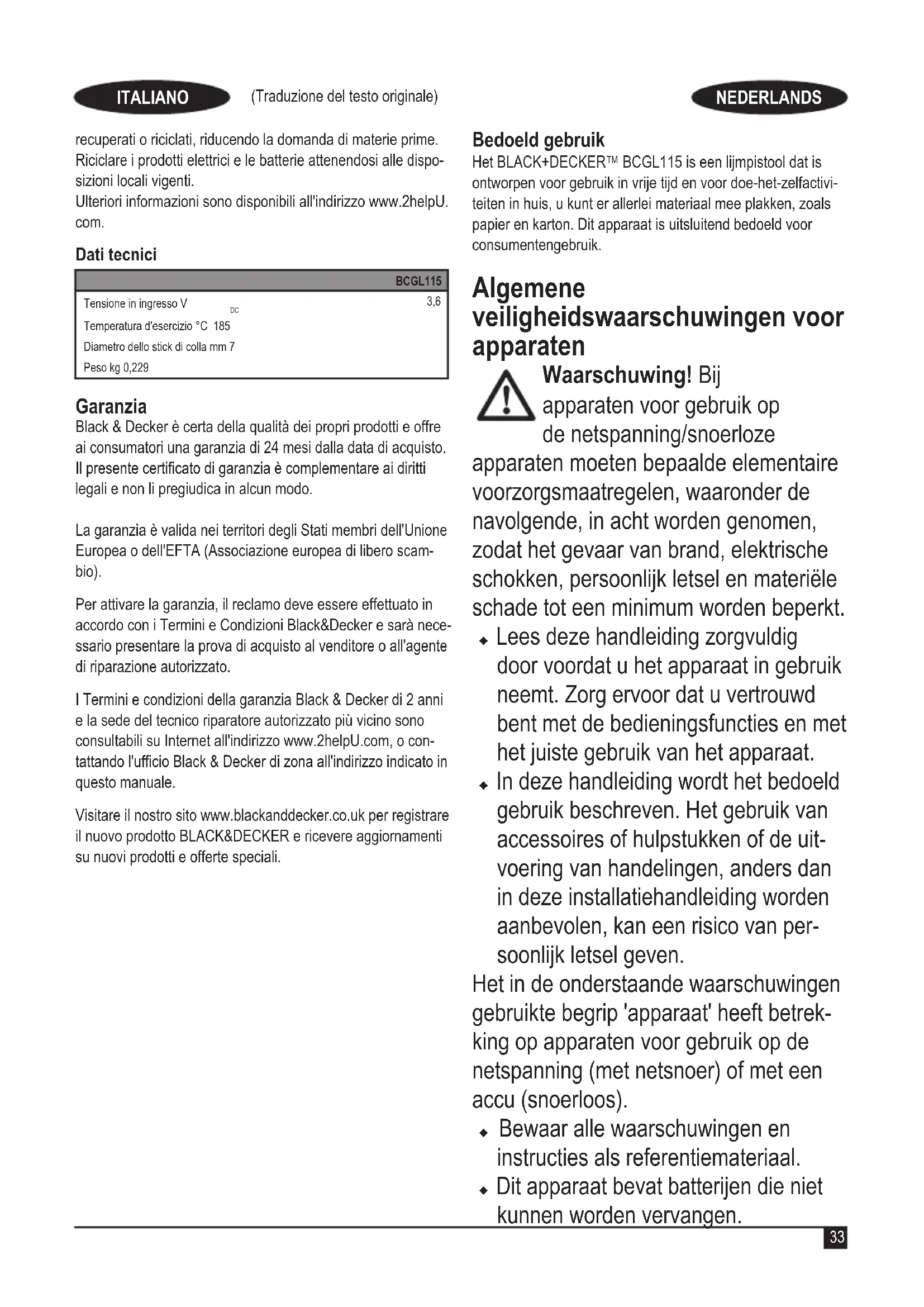 3,6 Bedrijfstemperatuur °C 185Doorsnede lijmstiften mm 7Gewicht kg 0,229 Garantie Black & Decker heeft vertrouwen in zijn producten en biedt consumenten een garantie van 24 maanden vanaf de aankoo- pdatum. Deze garantie vormt een aanvulling op uw wettelijke rechten en beperken deze niet. De garantie is geldig op het grondgebied van de Lidstaten van de Europese Unie en de Europese Vrijhandelszone. Voor een garantie‑aanspraak moet uw aanspraak in ove- reenstemming zijn met de Voorwaarden en Condities van Black&Decker en moet u een bewijs van aankoop overleggen aan de verkoper of aan een geautoriseerde reparatiemonteur. Voorwaarden en condities van de 2‑jarige garantie van Blac- k&Decker en het adres van de vestiging van het geautoriseer- de reparatiecentrum bij u in de buurt, kunt u vinden op internet op www.2helpU.com, of door contact op te nemen met het Black & Decker-kantoor ter plaatse, op het adres dat in deze handleiding wordt vermeld. Bezoek onze website www.blackanddecker.nl, waar u uw nieuwe BLACK+DECKER-product kunt registreren en informatie kunt verkrijgen over nieuwe producten en speciale aanbiedingen. Uso previsto La pistola de encolar BCGL115 de BLACK+DECKER