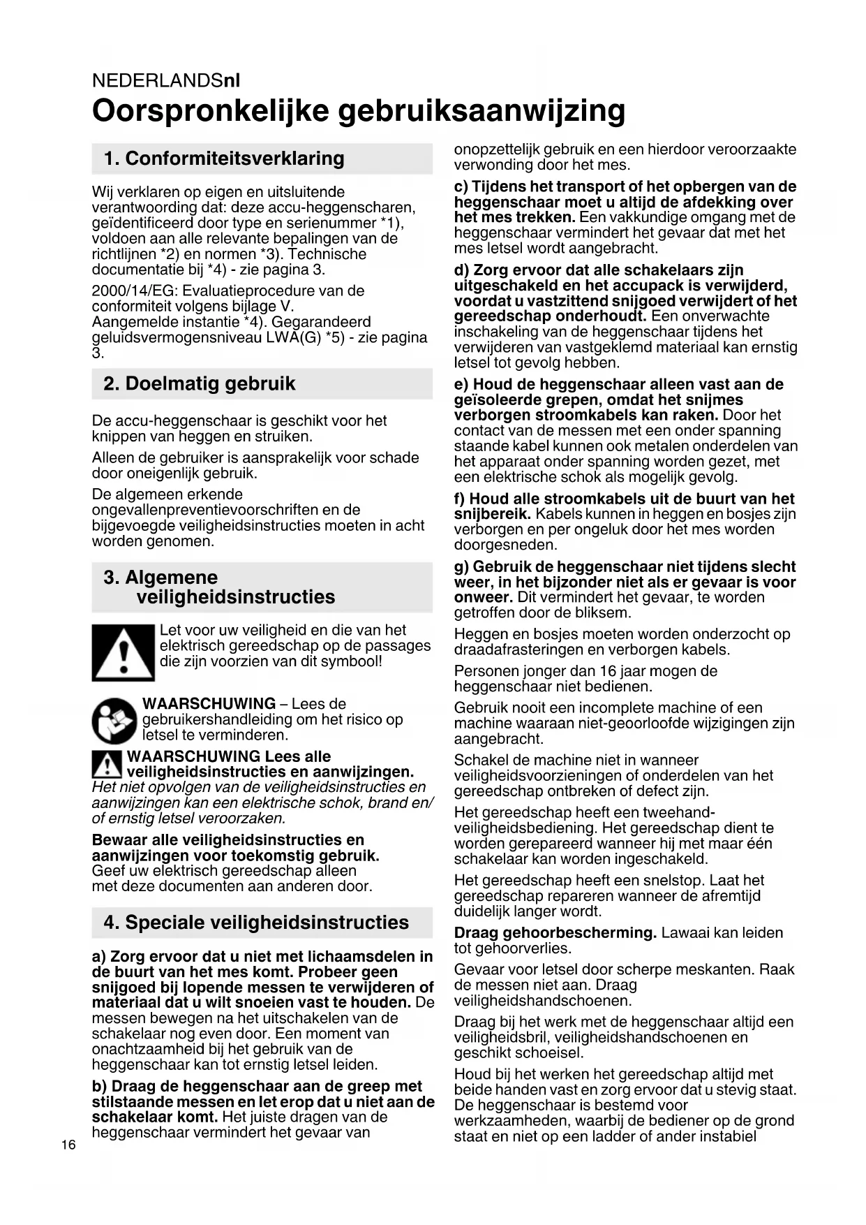 Oorspronkelijke gebruiksaanwijzing Wij verklaren op eigen en uitsluitende verantwoording dat: deze accu-heggenscharen, geïdentificeerd door type en serienummer *1), voldoen aan alle relevante bepalingen van de richtlijnen *2) en normen *3). Technische documentatie bij *4) - zie pagina 3. 2000/14/EG: Evaluatieprocedure van de conformiteit volgens bijlage V. Aangemelde instantie *4). Gegarandeerd geluidsvermogensniveau LWA(G) *5) - zie pagina