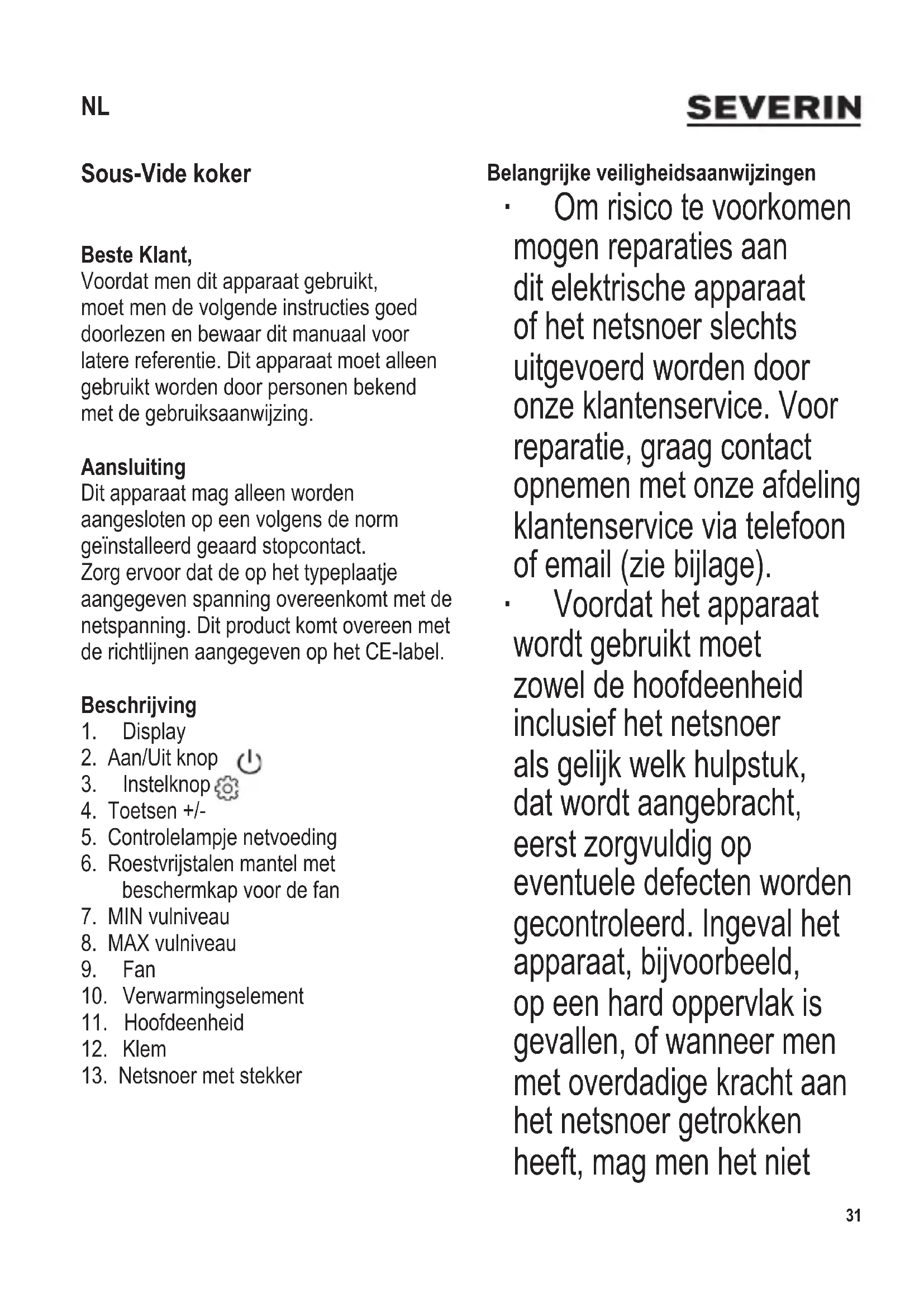 Sous-Vide koker Beste Klant, Voordat men dit apparaat gebruikt, moet men de volgende instructies goed doorlezen en bewaar dit manuaal voor latere referentie. Dit apparaat moet alleen gebruikt worden door personen bekend met de gebruiksaanwijzing. Aansluiting Dit apparaat mag alleen worden aangesloten op een volgens de norm geïnstalleerd geaard stopcontact. Zorg ervoor dat de op het typeplaatje aangegeven spanning overeenkomt met de netspanning. Dit product komt overeen met de richtlijnen aangegeven op het CE-label. Beschrijving
