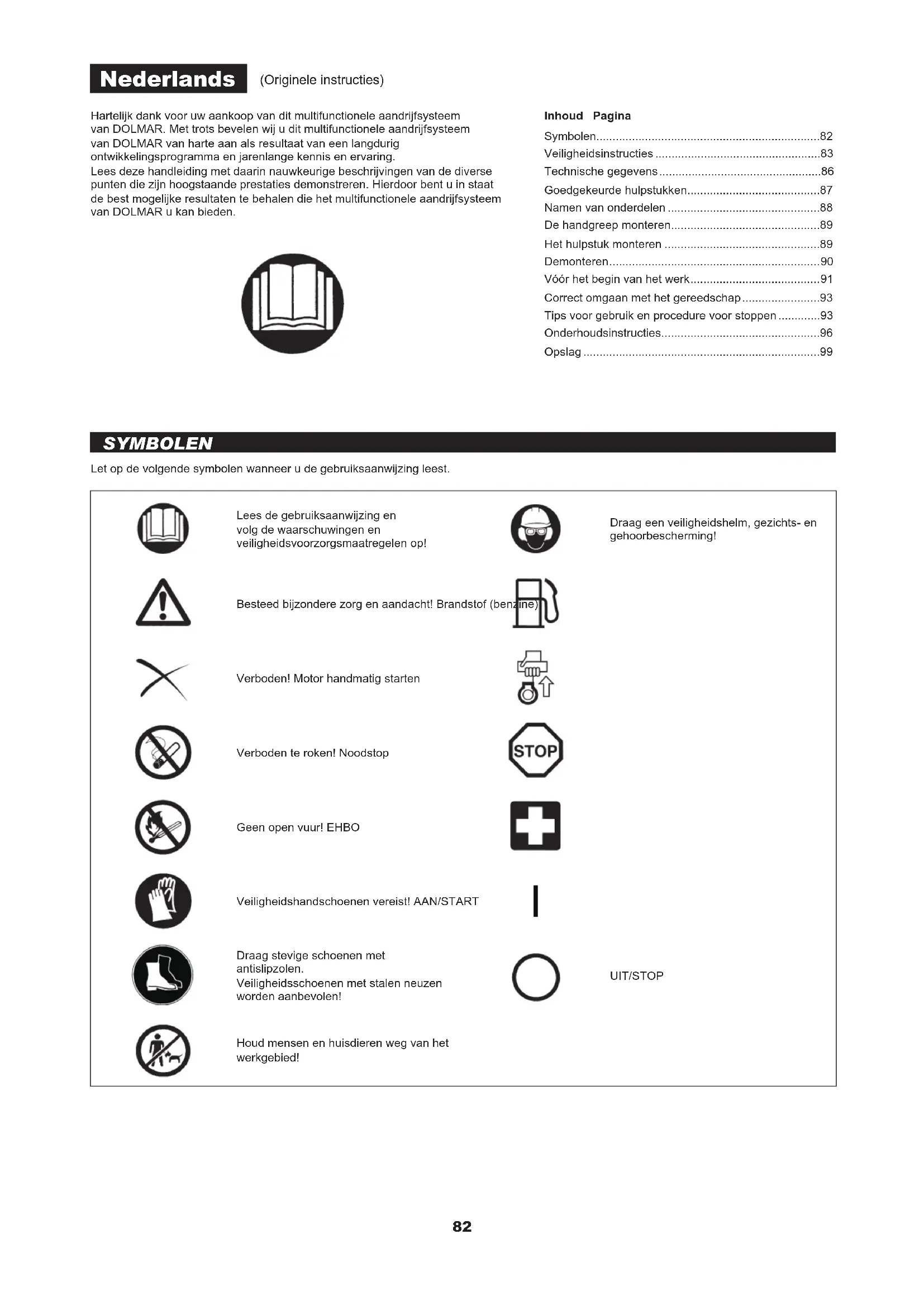 - Prima di richiedere una riparazione è opportuno individuare il problema autonomamente. Se viene rilevata un’anomalia, controllare la macchina secondo la descrizione nel presente manuale. Non smontare o manomettere le parti non indicate nella descrizione. Per le riparazioni rivolgersi all’agente autorizzato dell’assistenza o al rivenditore di zona. Anomalia Probabile causa (problema di funzionamento) Soluzione Il motore non si avvia Impossibile utilizzare la pompa del carburante Premere da 7 a 10 volte Velocità di tiraggio ridotta della corda di avviamento Tirare con forza Mancanza di carburante Rifornire di carburante Filtro del carburante intasato Pulire Tubo del carburante piegato Raddrizzare il tubo del carburante Carburante deteriorato Il carburante deteriorato rende difcoltoso l’avviamento. Sostituire con carburante nuovo. (Sostituzione consigliata: 1 mese) Aspirazione eccessiva di carburante Portare la leva dell’acceleratore dalla posizione di velocità media alla posizione di velocità alta e tirare l’impugnatura di avviamento no ad avviare il motore. L’accessorio inizia la rotazione o il movimento a seguito dell’avviamento del motore. Prestare la massima attenzione all’accessorio. Se il motore ancora non si avvia, staccare la candela, asciugare l’elettrodo e rimontarla come in origine. Procedere quindi all’avviamento come specicato. Tappo della candela staccato Attaccarlo saldamente Candela contaminata Pulire Distanza anomala della candela Regolare la distanza Altra anomalia della candela Sostituire Carburatore anomalo Richiedere l’ispezione e la manutenzione. Impossibile tirare la corda di avviamento Richiedere l’ispezione e la manutenzione. Sistema di guida anomalo Richiedere l’ispezione e la manutenzione. Il motore si arresta subito La velocità del motore non aumenta Riscaldamento insufciente Eseguire l’operazione di riscaldamento La leva del dispositivo di avviamento è nella posizione di chiusura anche se il motore è stato riscaldato. Portarla nella posizione di apertura Filtro del carburante intasato Pulizia o sostituzione Filtro dell’aria contaminato o intasato Pulire Carburatore anomalo Richiedere l’ispezione e la manutenzione. Sistema di guida anomalo Richiedere l’ispezione e la manutenzione. L’accessorio non ruota o non si muove L’accessorio non è stato inserito nel punto specicato. Effettuare l’inserimento secondo le istruzioni. Sistema di guida anomalo Richiedere l’ispezione e la manutenzione. L’unità principale vibra in modo anomalo L’accessorio non è stato inserito nel punto specicato. Effettuare l’inserimento secondo le istruzioni. Leva allentata Serrarla saldamente. Sistema di guida anomalo Richiedere l’ispezione e la manutenzione. L’accessorio non si ferma immediatamente Rotazione al minimo elevata Effettuare la regolazione Filo dell’acceleratore staccato Attaccarlo saldamente Sistema di guida anomalo Richiedere l’ispezione e la manutenzione. Il motore non si arresta Connettore staccato Attaccarlo saldamente Impianto elettrico anomalo Richiedere l’ispezione e la manutenzione. Se il motore non si avvia dopo l’operazione di riscaldamento: Se non vengono rilevate anomalie, aprire l’acceleratore di circa 1/3 e avviare il motore. Spegnere immediatamente il motore Spegnere immediatamente il motore Spegnere immediatamente il motore Avviare il motore al minimo e portare la leva del dispositivo di avviamento nella posizione di chiusura82 Hartelijk dank voor uw aankoop van dit multifunctionele aandrijfsysteem van DOLMAR. Met trots bevelen wij u dit multifunctionele aandrijfsysteem van DOLMAR van harte aan als resultaat van een langdurig ontwikkelingsprogramma en jarenlange kennis en ervaring.Lees deze handleiding met daarin nauwkeurige beschrijvingen van de diverse punten die zijn hoogstaande prestaties demonstreren. Hierdoor bent u in staat de best mogelijke resultaten te behalen die het multifunctionele aandrijfsysteem van DOLMAR u kan bieden.Let op de volgende symbolen wanneer u de gebruiksaanwijzing leest.Lees de gebruiksaanwijzing en volg de waarschuwingen en veiligheidsvoorzorgsmaatregelen op!Draag een veiligheidshelm, gezichts- en gehoorbescherming!Besteed bijzondere zorg en aandacht! Brandstof (benzine)Verboden! Motor handmatig startenVerboden te roken! NoodstopGeen open vuur! EHBOVeiligheidshandschoenen vereist! AAN/START Draag stevige schoenen met antislipzolen.Veiligheidsschoenen met stalen neuzen worden aanbevolen!UIT/STOPHoud mensen en huisdieren weg van het werkgebied! SYMBOLEN Nederlands (Originele instructies) Inhoud PaginaSymbolen p. 82