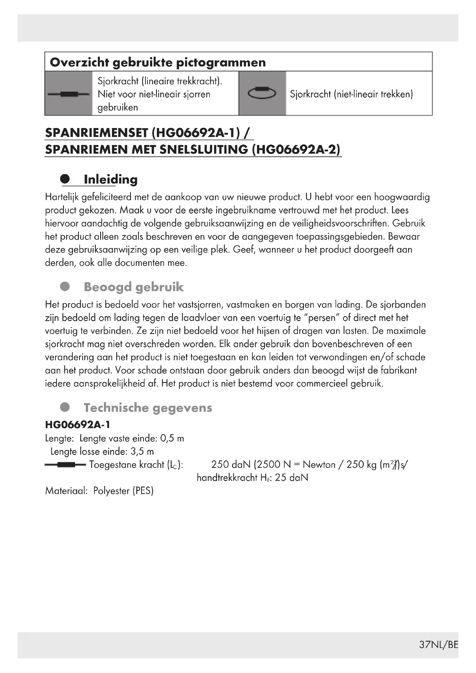 SPANRIEMEN MET SNELSLUITING (HG06692A-2) Inleiding Hartelijk gefeliciteerd met de aankoop van uw nieuwe product. U hebt voor een hoogwaardig product gekozen. Maak u voor de eerste ingebruikname vertrouwd met het product. Lees hiervoor aandachtig de volgende gebruiksaanwijzing en de veiligheidsvoorschriften. Gebruik het product alleen zoals beschreven en voor de aangegeven toepassingsgebieden. Bewaar deze gebruiksaanwijzing op een veilige plek. Geef, wanneer u het product doorgeeft aan derden, ook alle documenten mee. Beoogd gebruik Het product is bedoeld voor het vastsjorren, vastmaken en borgen van lading. De sjorbanden zijn bedoeld om lading tegen de laadvloer van een voertuig te “persen” of direct met het voertuig te verbinden. Ze zijn niet bedoeld voor het hijsen of dragen van lasten. De maximale sjorkracht mag niet overschreden worden. Elk ander gebruik dan bovenbeschreven of een verandering aan het product is niet toegestaan en kan leiden tot verwondingen en/of schade aan het product. Voor schade ontstaan door gebruik anders dan beoogd wijst de fabrikant iedere aansprakelijkheid af. Het product is niet bestemd voor commercieel gebruik. Technische gegevens HG06692A-1 Lengte: Lengte vaste einde: 0,5 m Lengte losse einde: 3,5 m Toegestane kracht (L