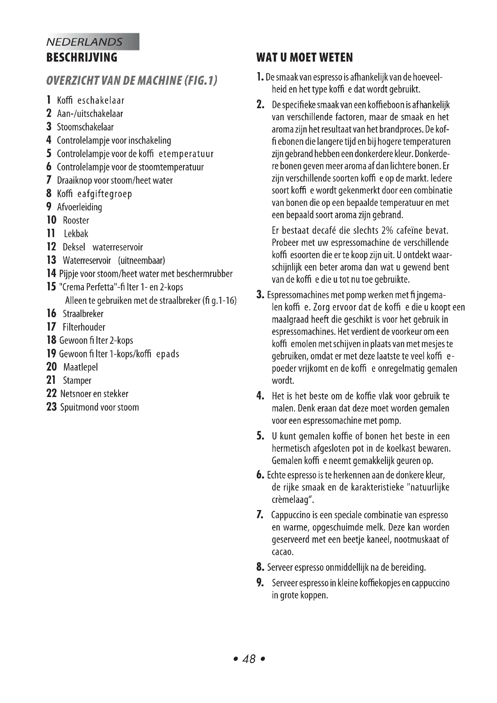 in grote koppen.• 49 • NEDERLANDS INLEIDING Lees het apart geleverde veiligheidsboekje zorgvuldig door voordat u de machine voor de eerste keer gebruikt, en bewaar dit voor toekomstig gebruik. BIJGELEVERDE FILTERS "Crema Perfetta"- lter 1- of 2-kops ( g. 5). Dit lter is al op de lterhouder gemonteerd en zorgt ervoor dat u vanaf het eerste gebruik van de machine een crèmige espresso krijgt. Let op. Dit filter mag alleen worden gebruikt in combinatie met de straalbreker ( g. 1-16). Gewoon lter 2-kops ( g. 7). Gewoon lter 1-kops/1 enkele ko epad ( g. 6). Deze lters zijn vergelijkbaar met die van professionele espressomachines en vereisen behendigheid en ervaring. Let op. Deze lters mogen niet worden gebruikt met de straalbreker ( g. 1-16). Wij adviseren u om te beginnen met het "Crema Per- fetta"- lter en als u daar handigheid in heeft gekregen, stap dan over op de gewone filters voor een echte barista-espresso. EERSTE INSTALLATIE