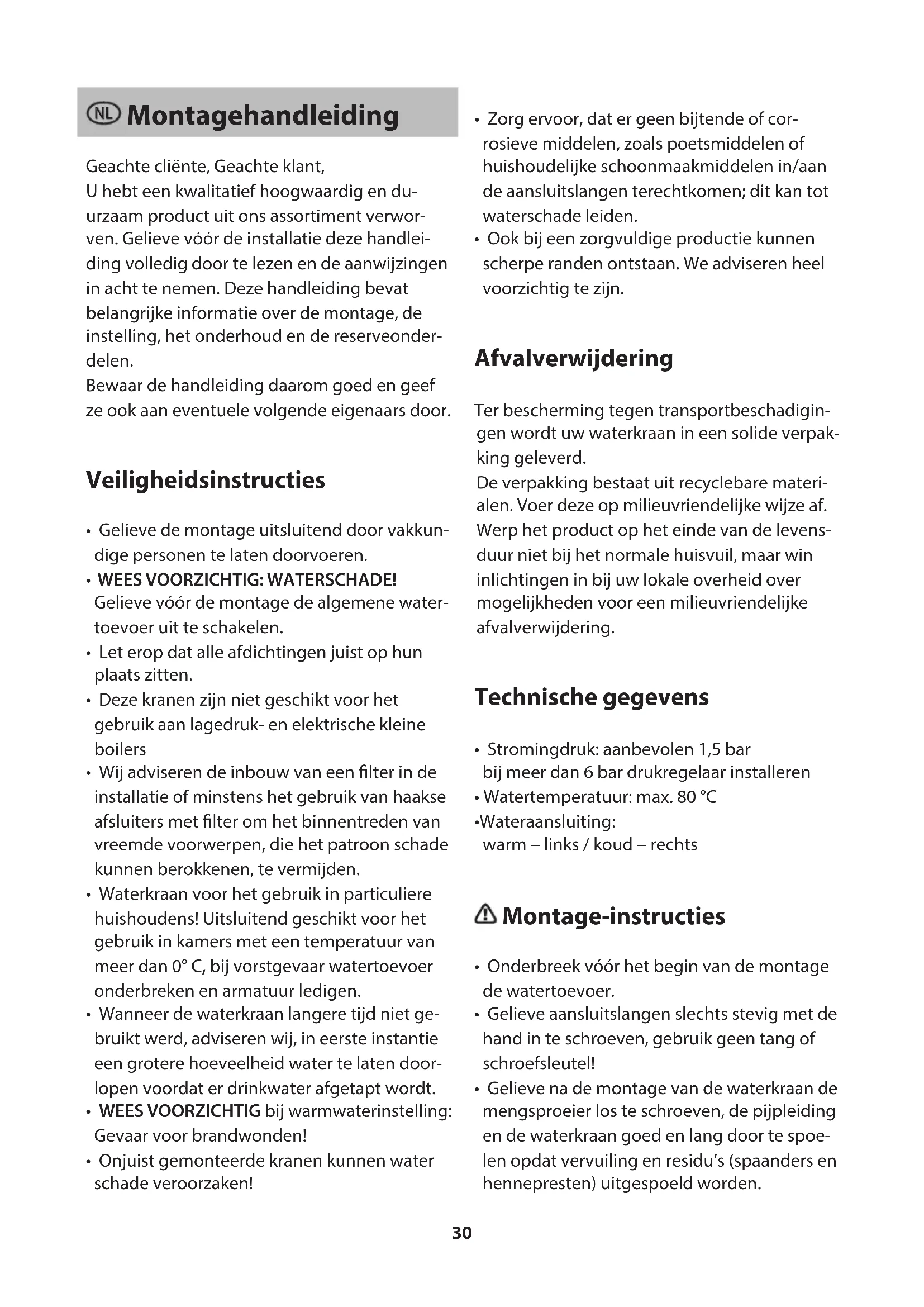 - Bij een verkeerde montage is de garantie – in het bijzonder voor gevolgschade – uitgesloten! Onderhoudshandleiding Sanitaire kranen vereisen een bijzonder onder- houd. Gelieve daarom volgende aanwijzingen in acht te nemen: