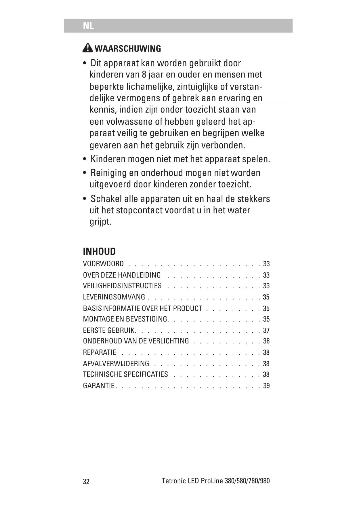 - Schakel alle apparaten uit en haal de stekkers uit het stopcontact voordat u in het water grijpt. INHOUD VOORWOORD . . . . . . . . . . . . . . . . . . . . . 33