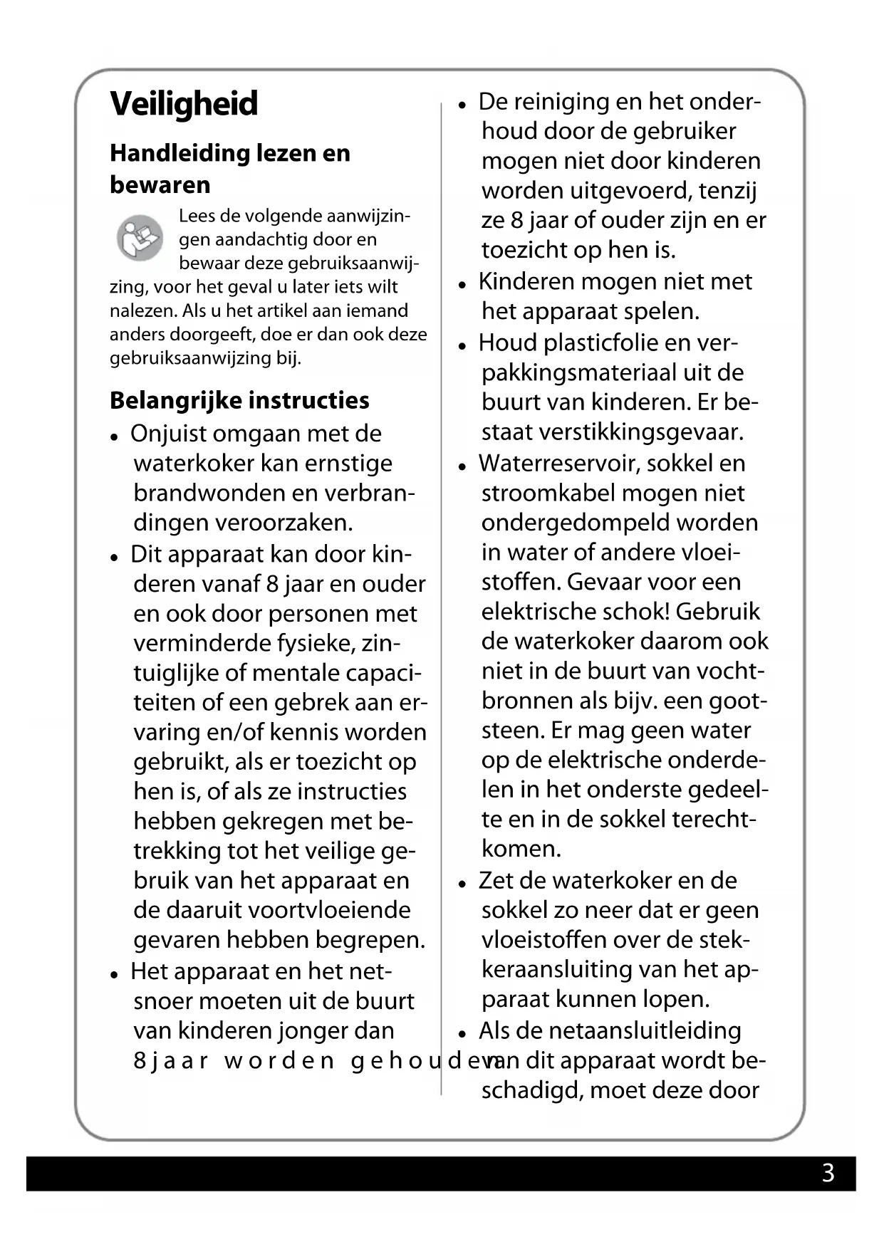 - Conformiteitsverklaring Veiligheid Handleiding lezen en bewaren Lees de volgende aanwijzin- gen aandachtig door en bewaar deze gebruiksaanwij- zing, voor het geval u later iets wilt nalezen. Als u het artikel aan iemand anders doorgeeft, doe er dan ook deze gebruiksaanwijzing bij. Belangrijke instructies z Onjuist omgaan met de waterkoker kan ernstige brandwonden en verbran- dingen veroorzaken. z Dit apparaat kan door kin- deren vanaf 8 jaar en ouder en ook door personen met verminderde fysieke, zin- tuiglijke of mentale capaci- teiten of een gebrek aan er- varing en/of kennis worden gebruikt, als er toezicht op hen is, of als ze instructies hebben gekregen met be- trekking tot het veilige ge- bruik van het apparaat en de daaruit voortvloeiende gevaren hebben begrepen. z Het apparaat en het net- snoer moeten uit de buurt van kinderen jonger dan 8jaar worden gehouden. z De reiniging en het onder- houd door de gebruiker mogen niet door kinderen worden uitgevoerd, tenzij ze 8 jaar of ouder zijn en er toezicht op hen is. z Kinderen mogen niet met het apparaat spelen. z Houd plasticfolie en ver- pakkingsmateriaal uit de buurt van kinderen. Er be- staat verstikkingsgevaar. z Waterreservoir, sokkel en stroomkabel mogen niet ondergedompeld worden in water of andere vloei- stoffen. Gevaar voor een elektrische schok! Gebruik de waterkoker daarom ook niet in de buurt van vocht- bronnen als bijv. een goot- steen. Er mag geen water op de elektrische onderde- len in het onderste gedeel- te en in de sokkel terecht- komen. z Zet de waterkoker en de sokkel zo neer dat er geen vloeistoffen over de stek- keraansluiting van het ap- paraat kunnen lopen. z Als de netaansluitleiding van dit apparaat wordt be- schadigd, moet deze door4 de fabrikant of zijn klanten- dienst of een soortgelijk gekwalificeerde klanten- service worden vervangen, om risico's te vermijden. z Het apparaat mag niet aan een tijdschakelklok, een schemeringsschakelaar of aan een ander op afstand werkend systeem worden aangesloten. z WAARSCHUWING: Open het deksel niet tijdens het koken en bij het uitgieten. Gevaar voor brandwonden door hete stoom! z Houd u aan de markering MIN en MAX voor de vul- hoeveelheid: -Als deze met te weinig water is gevuld (onder MIN), kan de waterkoker oververhitten. -Als deze met te veel water is gevuld (boven MAX), kan er heet water uit de kan naar buiten spuiten. Gevaar voor brandwon- den! z Gebruik de waterkoker uit- sluitend met de meegele- verde sokkel. Anders is er gevaar voor kortsluiting en elektrische schokken! z VOORZICHTIG: Zorg ervoor dat de waterkoker is uitge- schakeld voordat u de wa- terkoker van de sokkel neemt. z Het verwarmingselement in de waterkoker blijft ook na het uitschakelen van de waterkoker lang heet en er bestaat gevaar voor brand- wonden. z Als het oppervlak vervuild is, bijvoorbeeld door le- vensmiddelen, schakel dan de waterkoker uit en laat hem volledig afkoelen. Maak de oppervlakte schoon met een zachte, licht bevochtigde doek. Ge- bruik indien nodig een mild en geschikt reinigingsmid- del. Voorschriftmatig gebruik z Deze waterkoker is uitslui- tend bedoeld om water te verwarmen en te koken. Water met koolzuur, melk en andere vloeistoffen mo- gen niet in de waterkoker worden gegoten en ver- warmd - het apparaat zou5 kunnen worden bescha- digd. z De waterkoker is uitslui- tend bestemd voor privé- gebruik en is niet geschikt voor de volgende bereiken: -in keukens voor werkne- mers in winkels, kantoren en andere commerciële zones, -in landbouwbedrijven, -door klanten in hotels, motels en andere soort- gelijke woonomgeving- en, -in B&B's. z Bij foutief gebruik kan dit gebruik leiden tot letsels, bijvoorbeeld brandwon- den. Gevaar door elektriciteit z Bedien het apparaat niet met natte handen. z Gebruik het apparaat niet in de openlucht. z Sluit het apparaat aan op een naar behoren geïnstalleerd stopcontact met randaarding, waarvan de span- ning voldoet aan de 'Technische specificaties'. z Let erop dat het stopcontact goed toegankelijk is, zodat u de netstek- ker er zo nodig snel kunt uittrekken. z Schakel de waterkoker steeds uit, voordat u deze met water vult. z Laat de waterkoker niet zonder toe- zicht werken. z Gebruik het apparaat niet: –wanneer de waterkoker of de sokkel beschadigd zijn, –wanneer de stroomkabel of de stekker beschadigd zijn, –wanneer de waterkoker op de grond gevallen is. z Wikkel de stroomkabel voor elk gebruik helemaal af. Let er daarbij op dat de stroomkabel niet door scherpe randen of hete voorwerpen beschadigd wordt. z Trek de stekker uit het stopcontact: –als u de waterkoker niet gebruikt, –na elk gebruik, –voordat u het apparaat schoon- maakt of wegzet, –wanneer er tijdens het gebruik blijkbaar een storing optreedt, –bij onweer. Trek daarbij steeds aan de stek- ker, niet aan het snoer. z Breng geen veranderingen aan het apparaat of de stroomkabel aan. Laat reparaties alleen door een vak- werkplaats uitvoeren omdat niet volgens de vakvereisten gerepa- reerde apparaten de gebruiker in gevaar brengen. Let ook op de bij- gevoegde garantievoorwaarden. z Gebruik geen verlengsnoer. Gevaar voor verbrandingen/ brandwonden en brand z De waterkoker wordt tijdens het gebruik heet. Gevaar voor verbran- ding! Pak hem alleen aan de greep vast.6 z Bij het opwarmen en tijdens het koken komt er hete stoom naar bui- ten. Bij aanraking bestaat het gevaar voor verbrandingen! z Sluit het deksel voor u het apparaat inschakelt. Anders kan het apparaat niet automatisch uitschakelen en kan het hete water overkoken. Let erop dat het deksel vergrendeld is. Aanwijzing - materiële schade z Gebruik uitsluitend de meegelever- de sokkel. z Zet het apparaat op een stabiele en vlakke ondergrond. Let daarbij op een voldoende grote afstand tot sterke warmtebronnen zoals kook- platen, verwarmingsbuizen e. a. De stroomkabel moet goed in de kabeluitsparing van de sokkel lig- gen, zodat de sokkel goed staat. z Zet het apparaat dan zo neer, dat de bij het gebruik optredende 